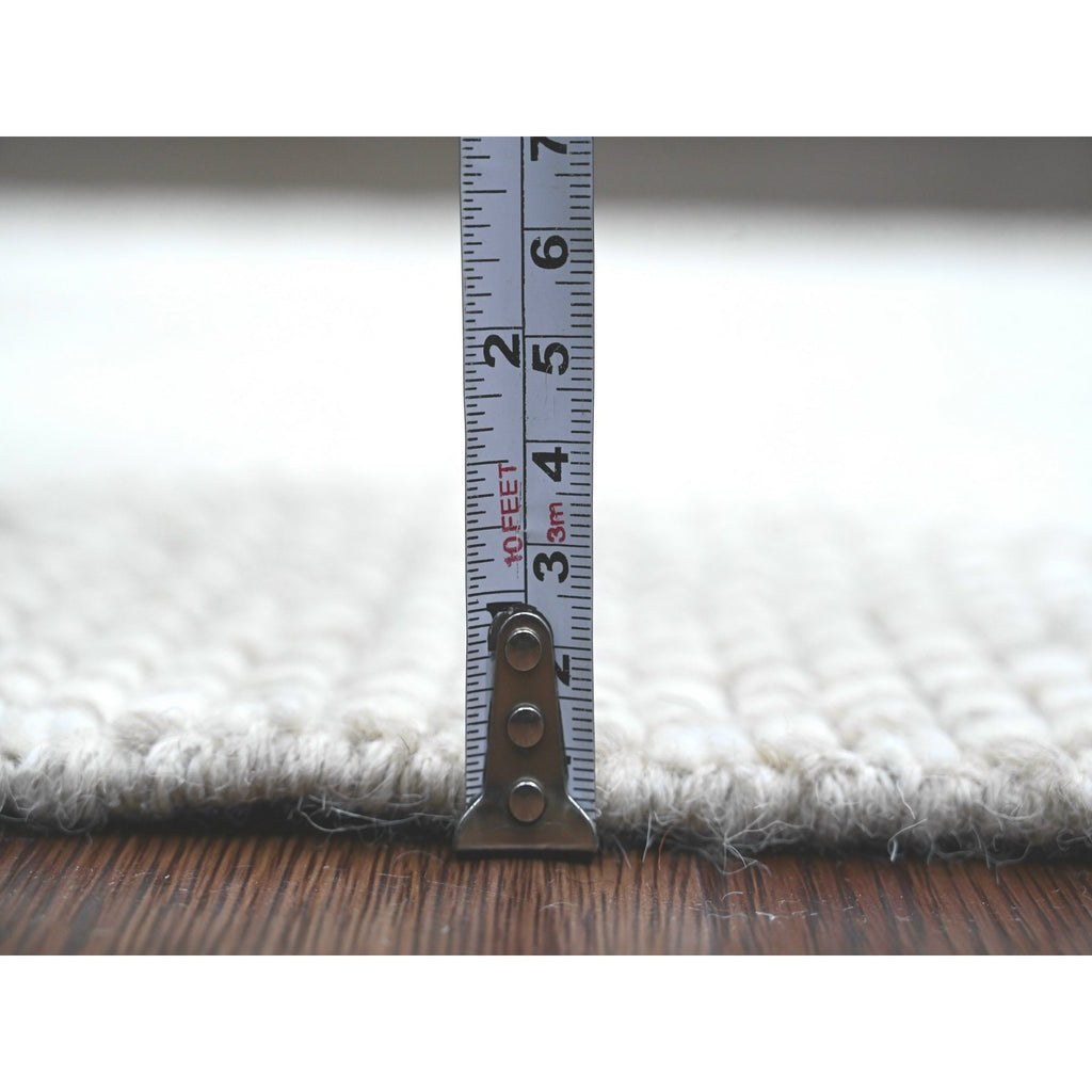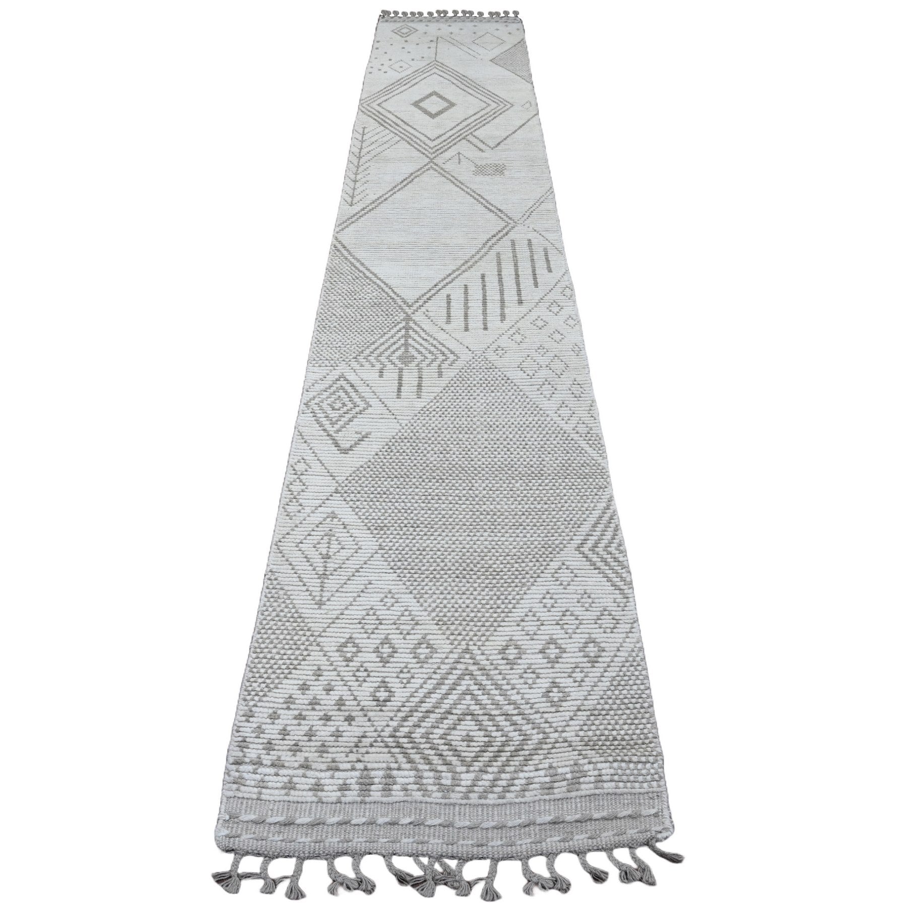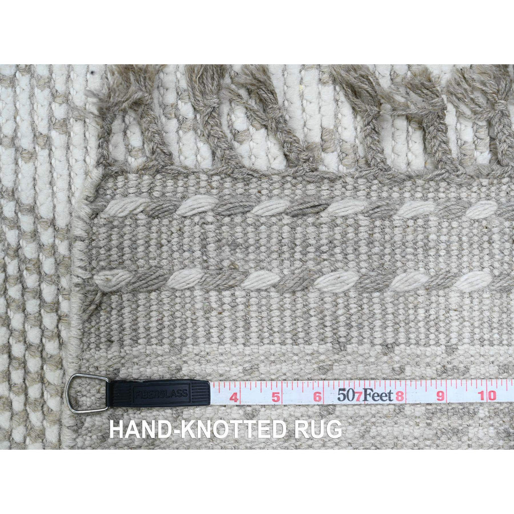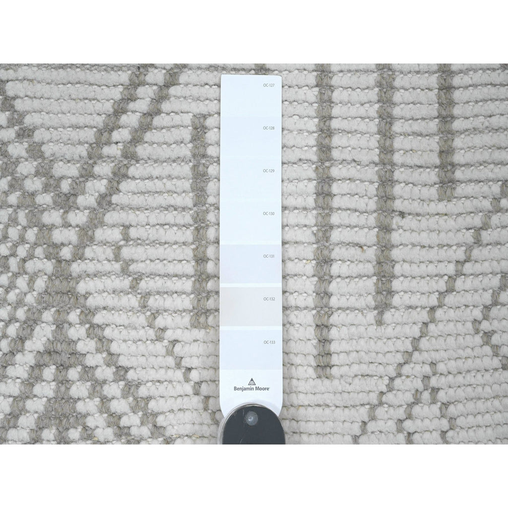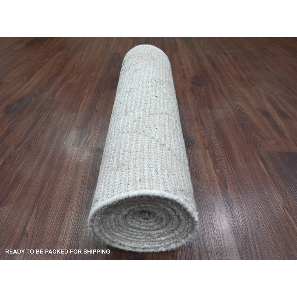 2'5"x14'3" Bone White, Moroccan Weave With Geometric Design, Hand Knotted, Soft Wool, Tone On Tone, Textured Pile, Runner, Oriental Rug FWR123702