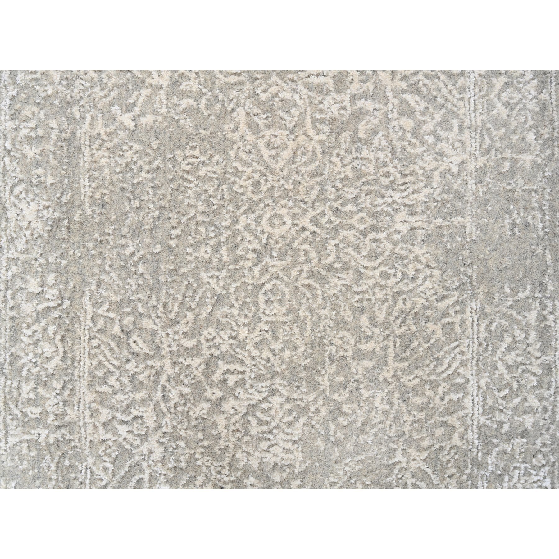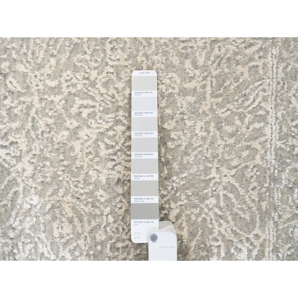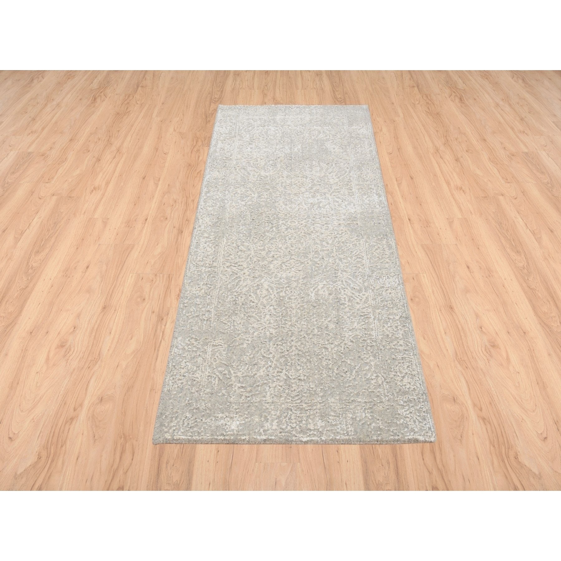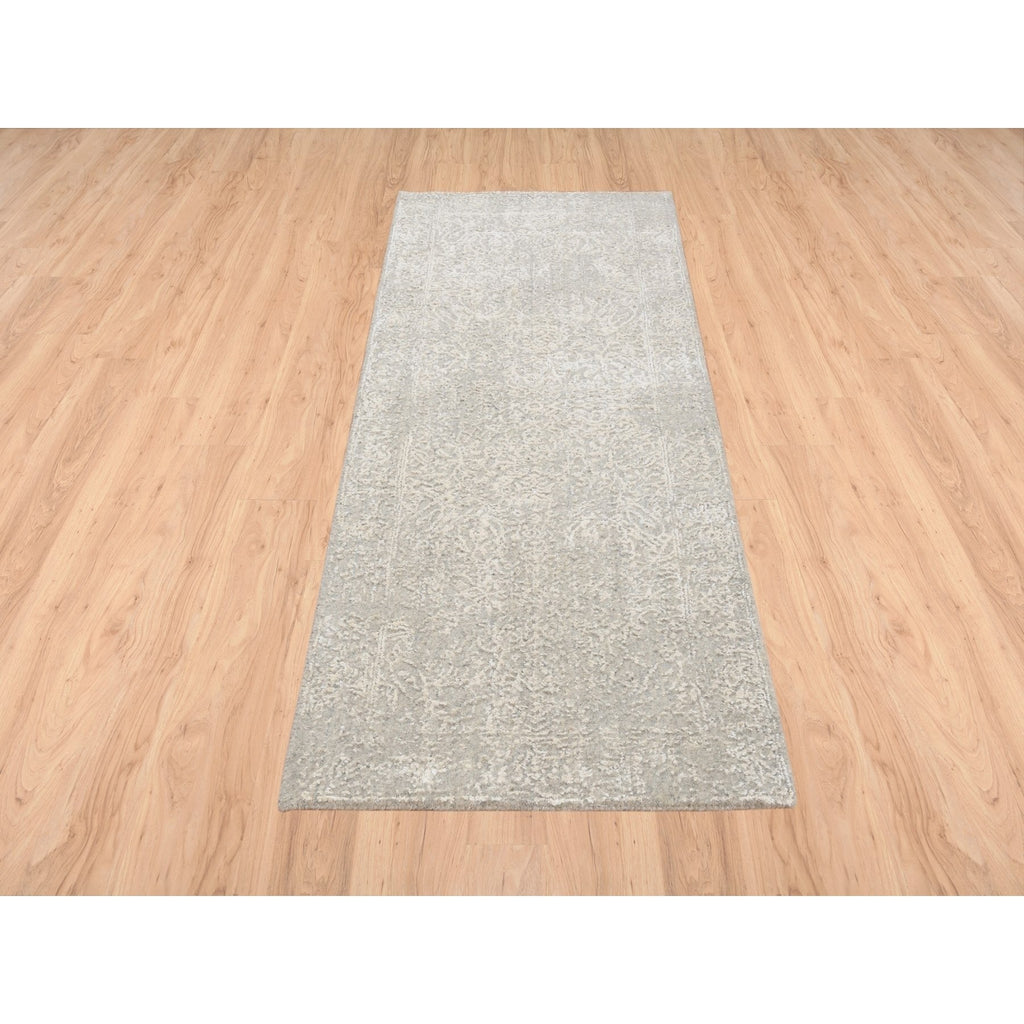 2'5"x6' Beige Wool And Plant Based Silk Hand Loomed Fine Jacquard With Erased Design Oriental Runner Rug FWR379698
