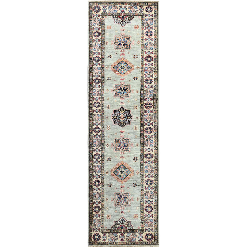 2'5"x8'6" Ash Gray, Natural Wool Hand Knotted, Afghan Super Kazak With Geometric Medallions, Natural Dyes Densely Woven, Runner Oriental Rug FWR496440
