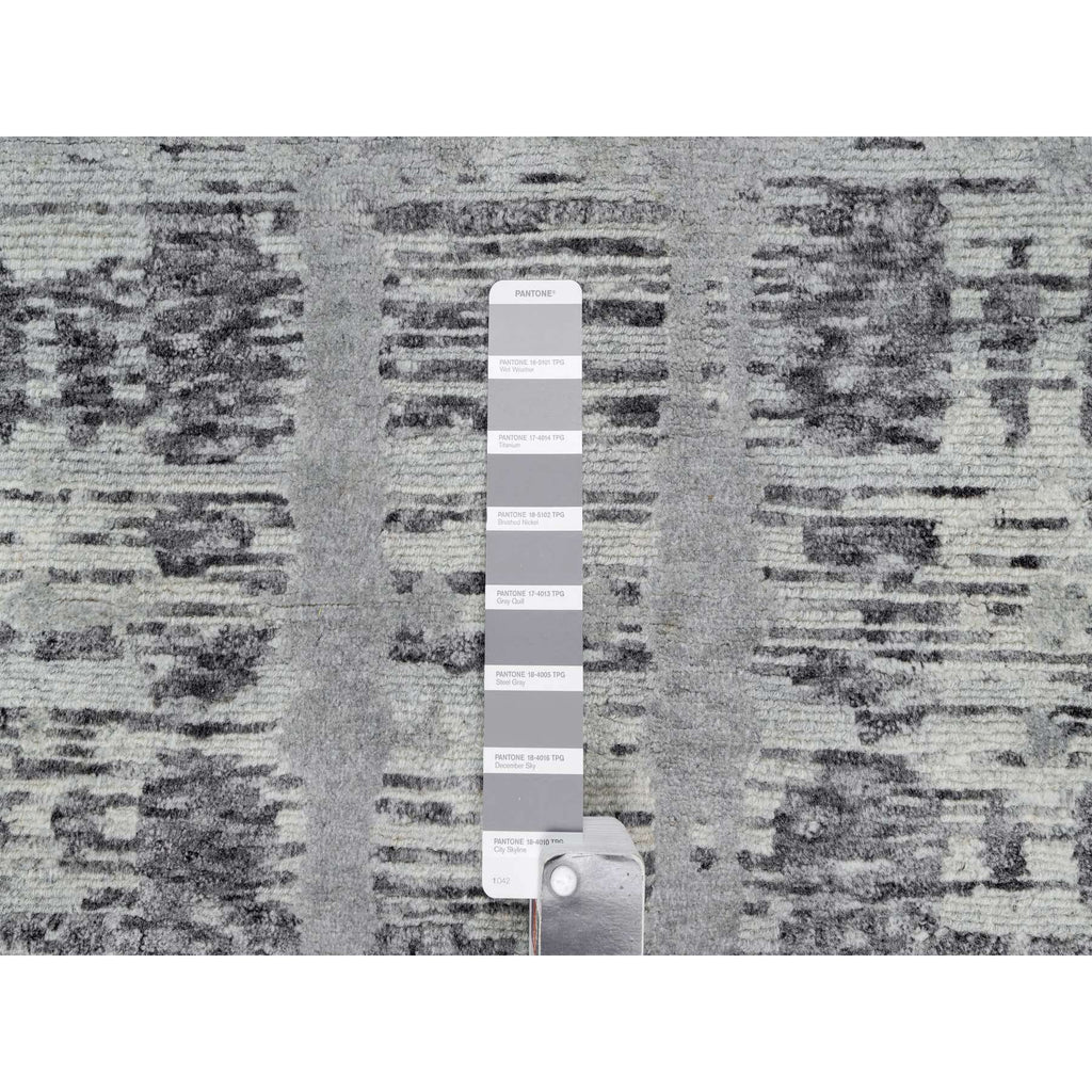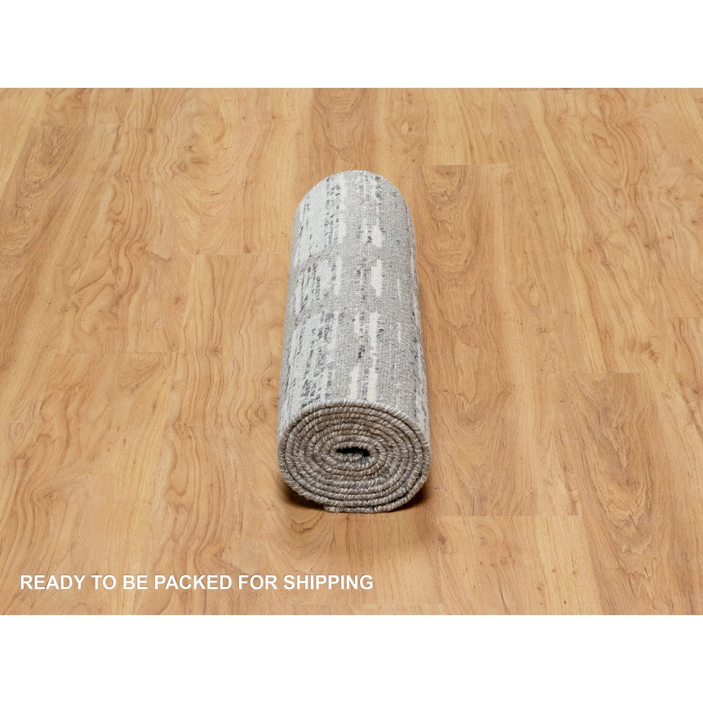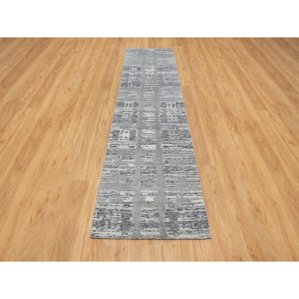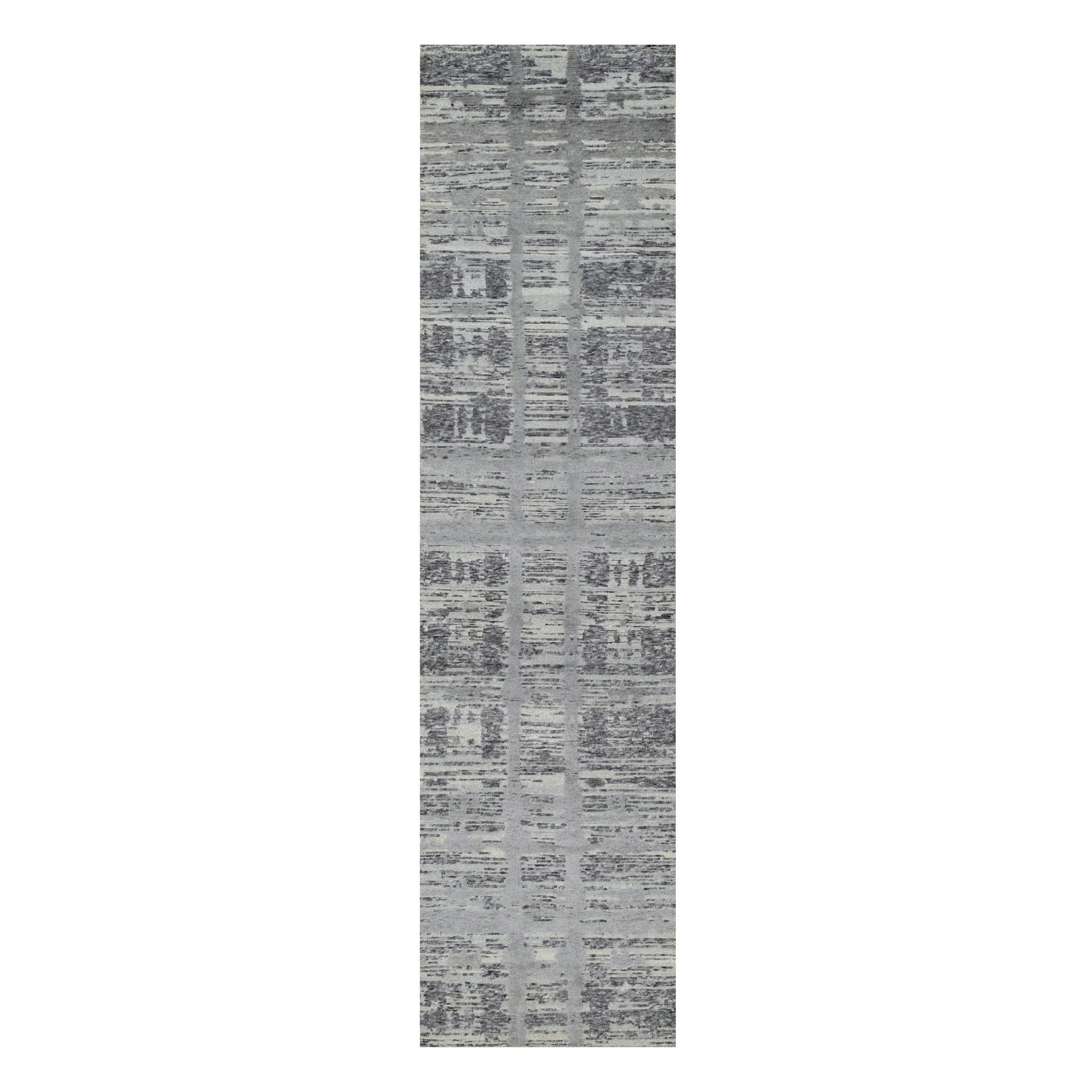 2'6"x10' Ash Gray, Hand Spun, Undyed Natural Wool, Modern Criss Cross Erased Design, Hand Knotted, Runner, Oriental Rug FWR545058