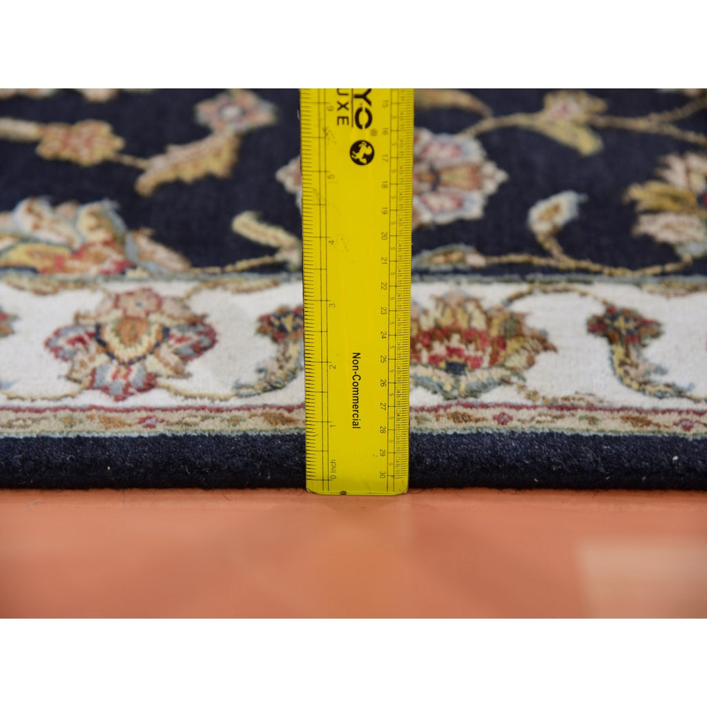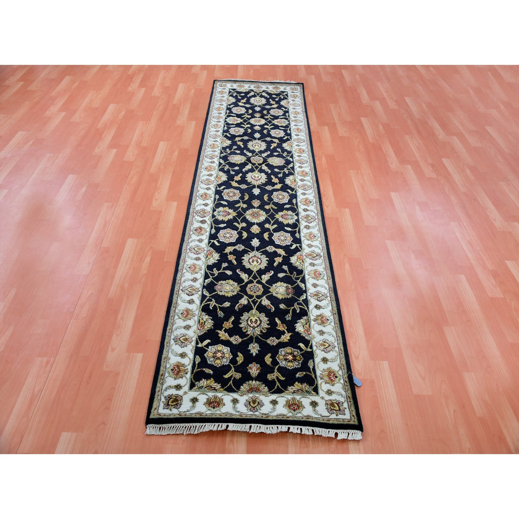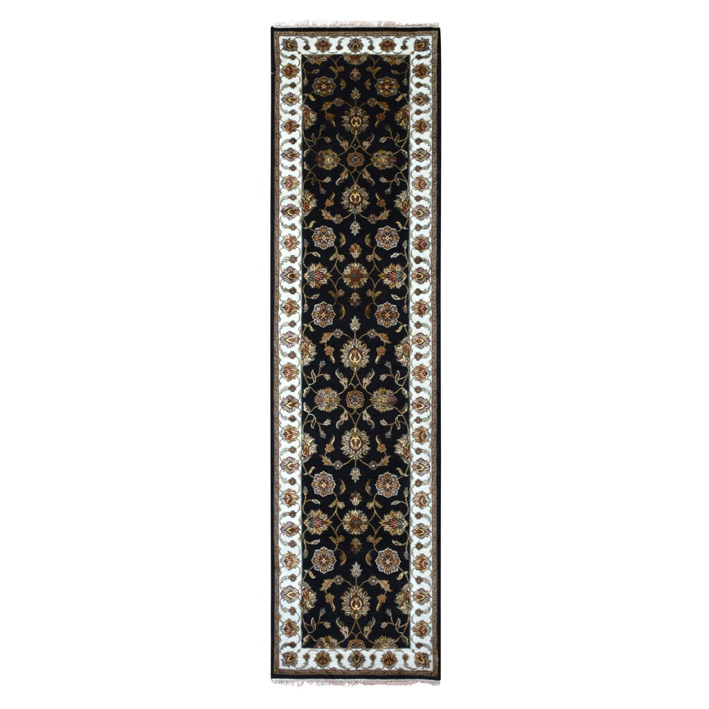 2'6"x10' Oyster Black, Hand Knotted Wool And Silk Rajasthan Design With All Over Leaf Motifs, Thick And Plush Oriental Runner Rug FWR452316