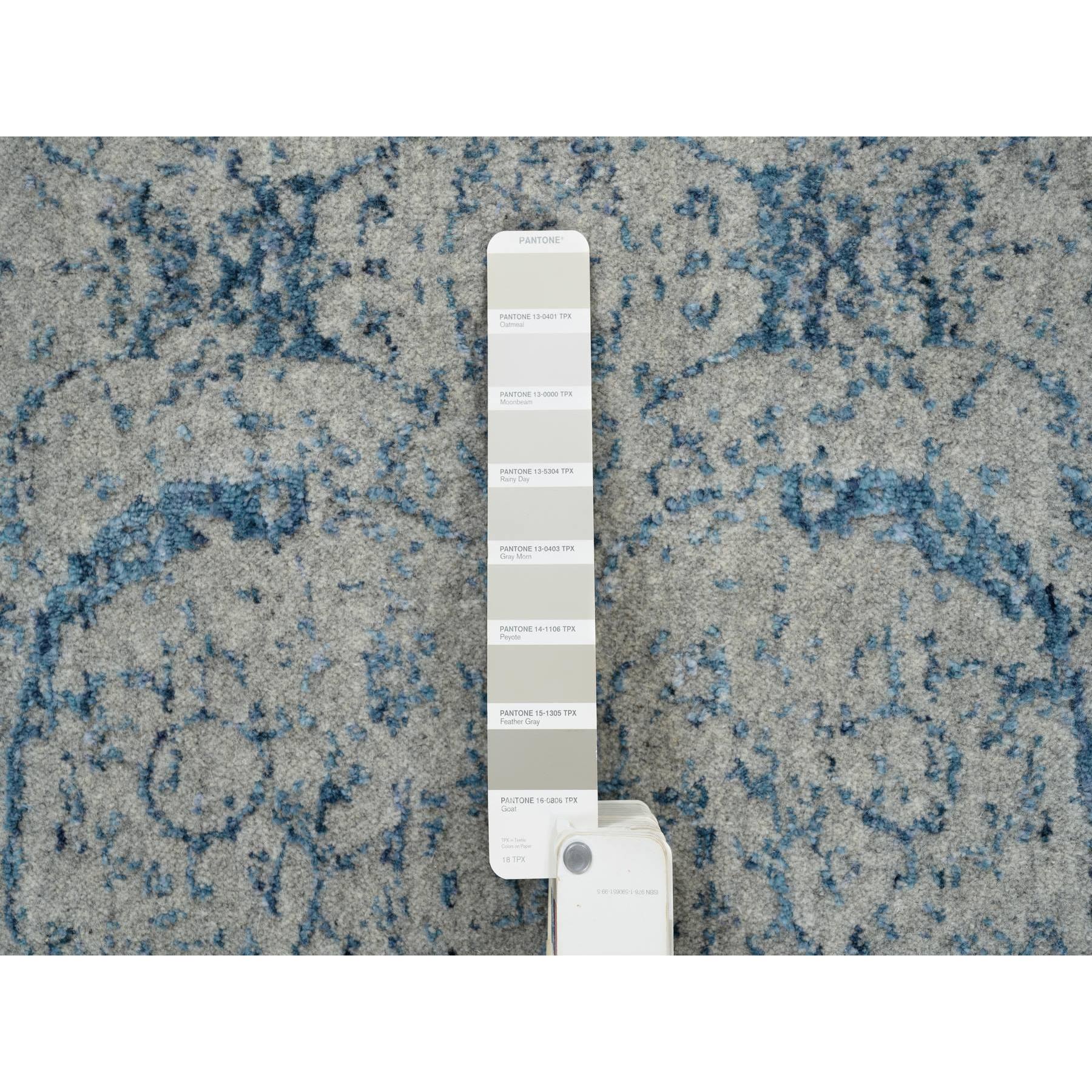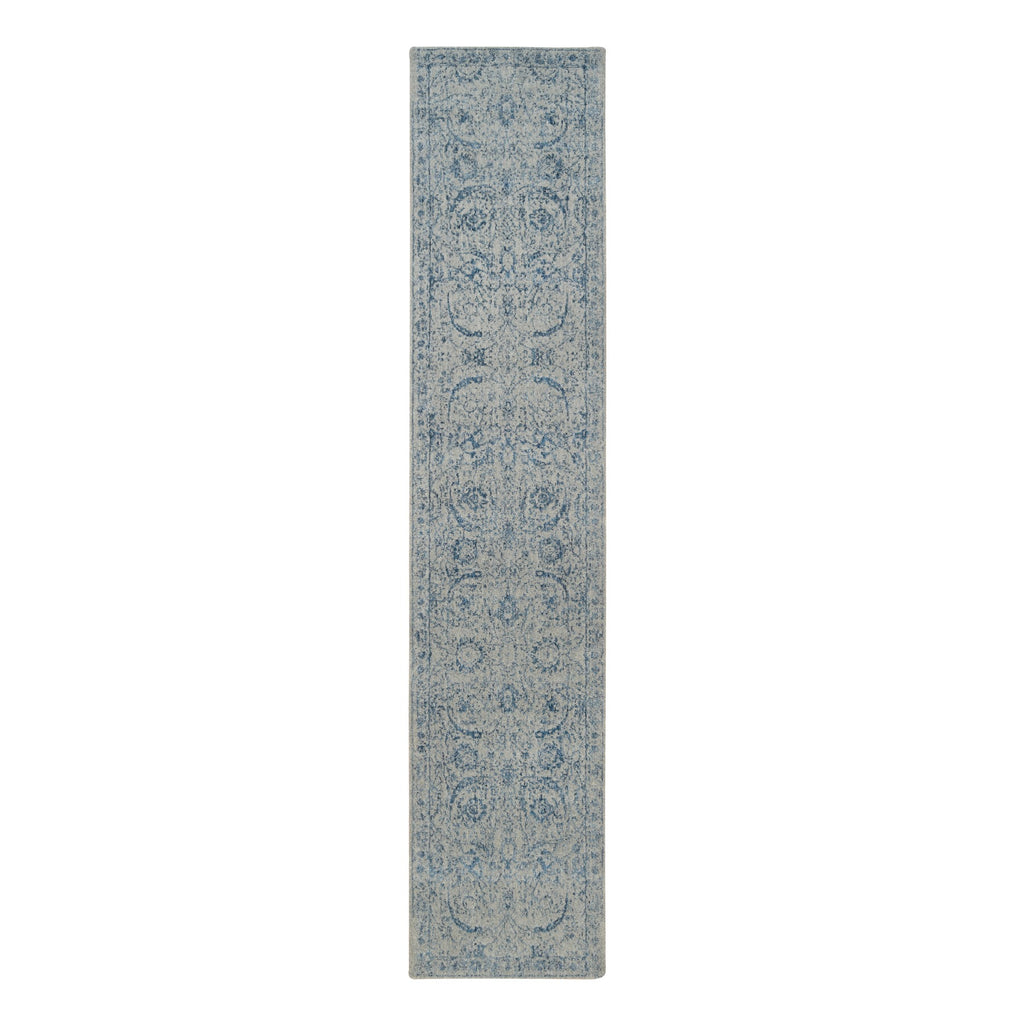 2'6"x12' Fine Jacquard With Sickle Leaf Design Wool And Plant Based Silk Hand Loomed Gray Oriental Runner Rug FWR381054