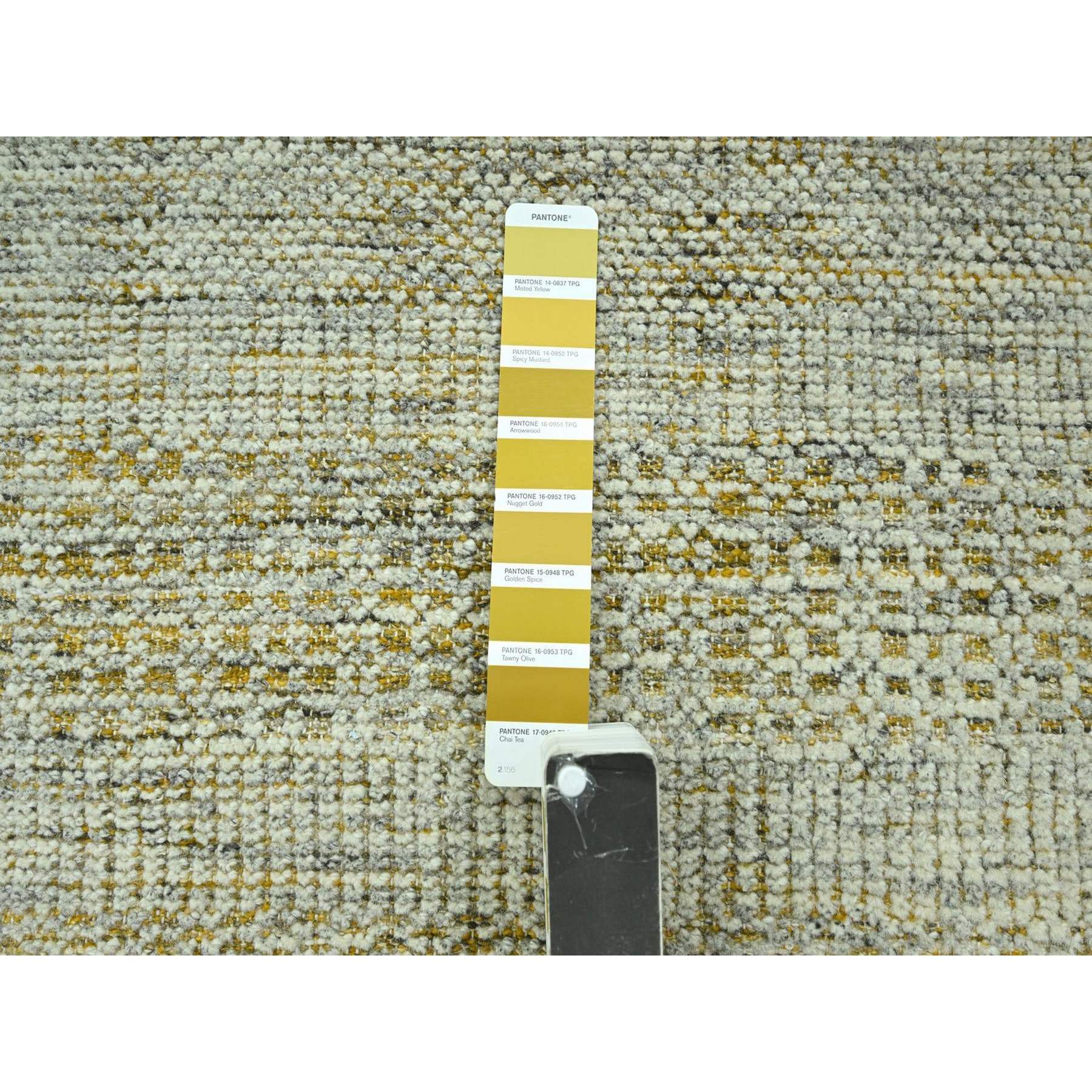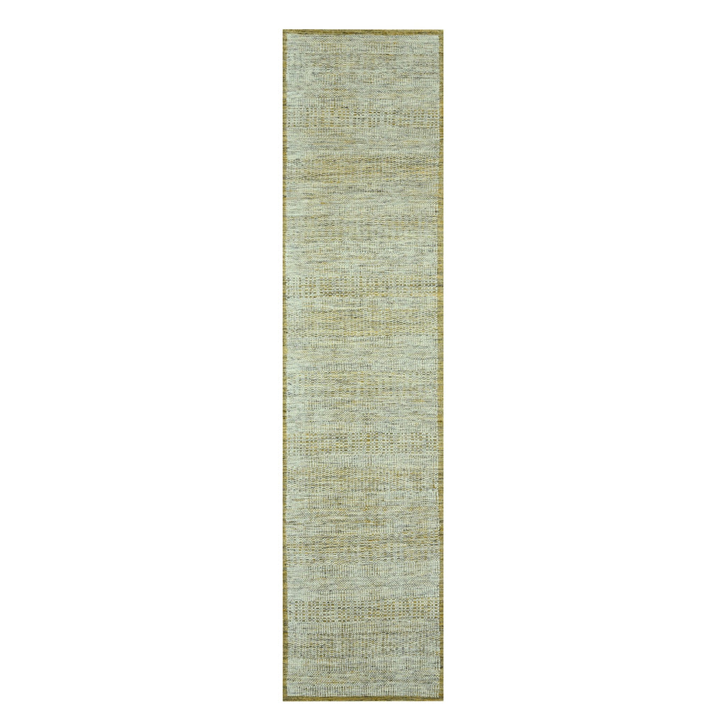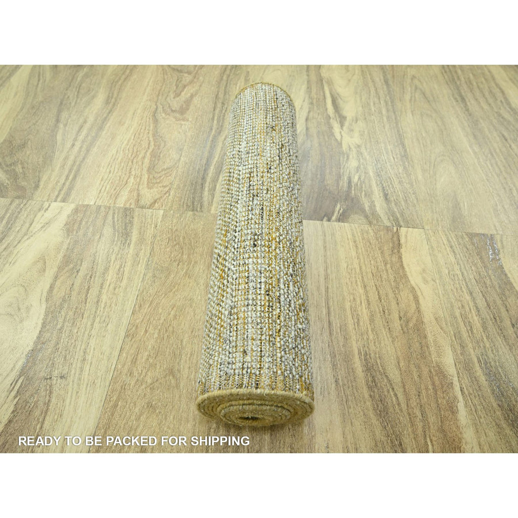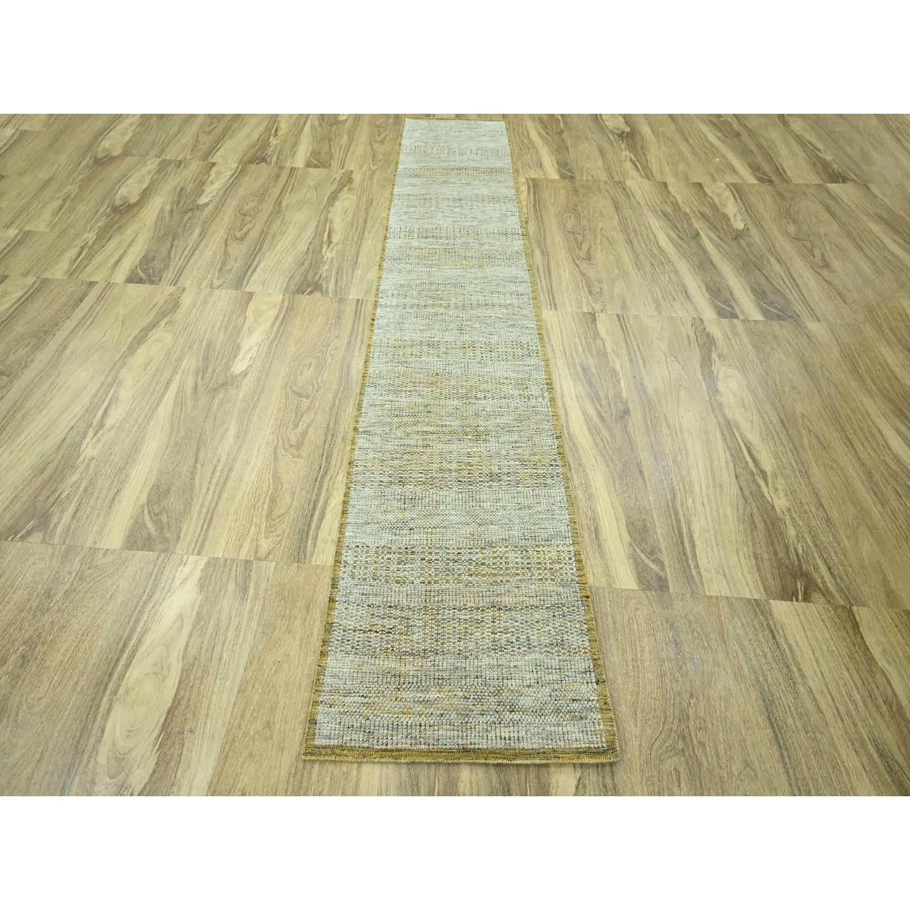 2'6"x12' Mustard Yellow, Distressed And Oxidized Grass Design With Exposed Warps, Hand Knotted, 100% Wool, Runner, Oriental Rug FWR460512