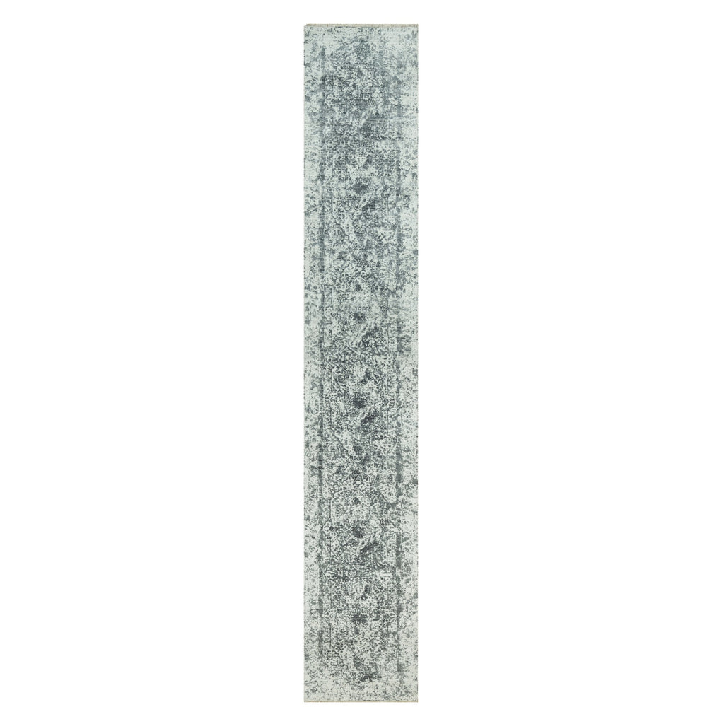 2'6"x15'8" Wind Chime Gray, Hand Knotted Broken And Erased Persian Design With Wool And Silk, Oriental Xl Runner Rug FWR542838