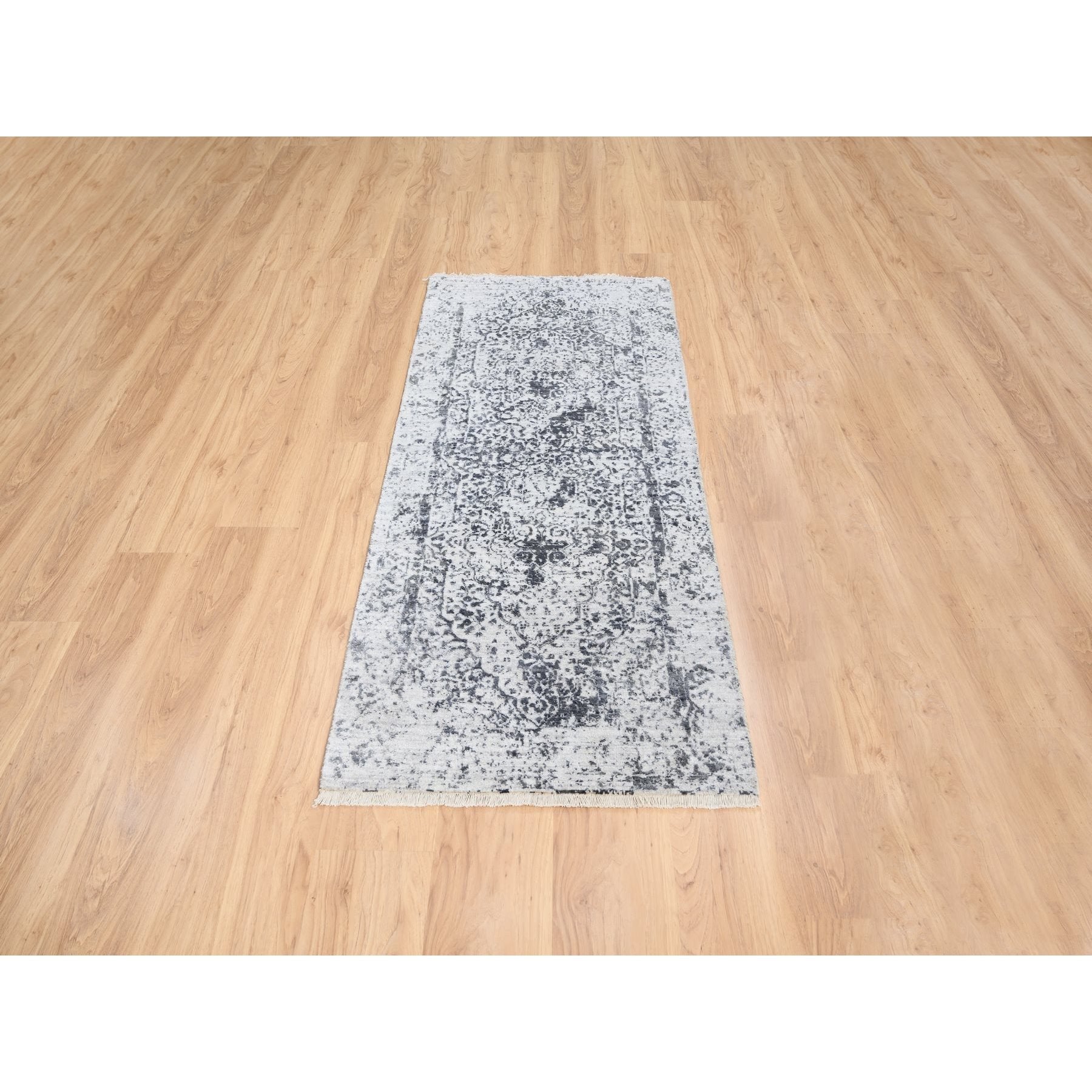 2'6"x5'10" Wool And Pure Silk Hand Knotted Silver Gray Erased Persian Design Oriental Runner Rug FWR380850