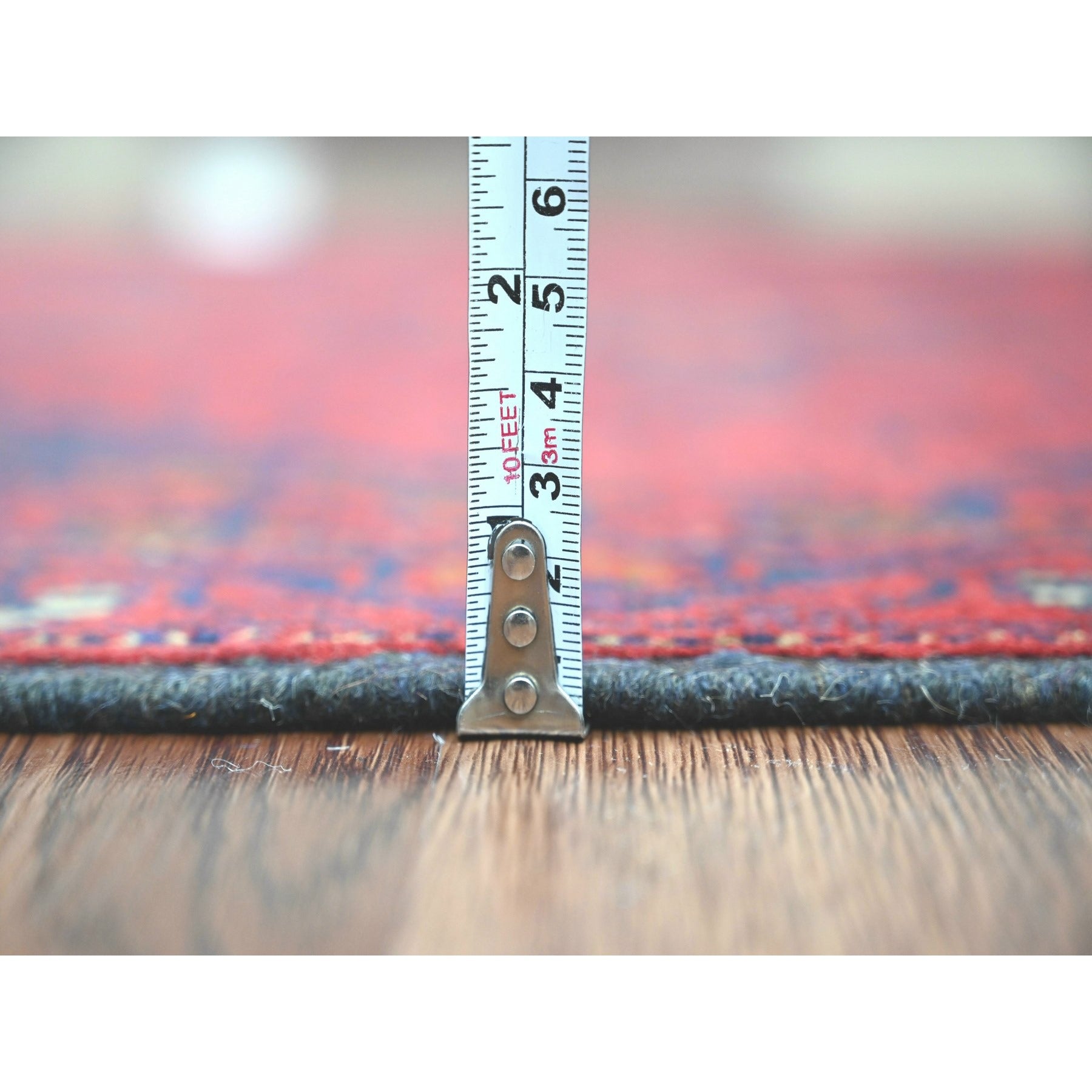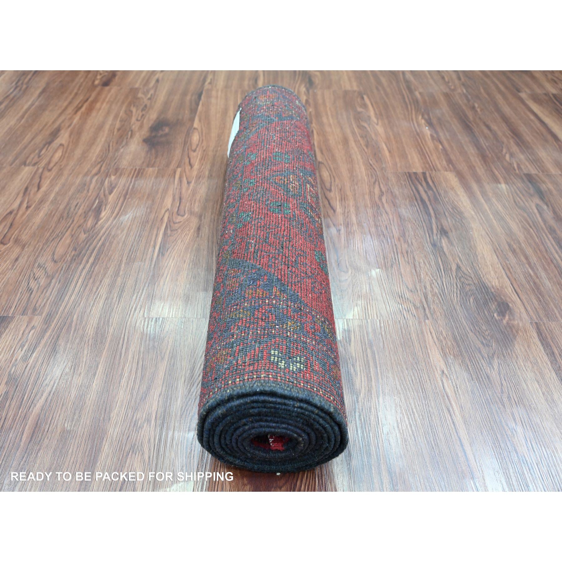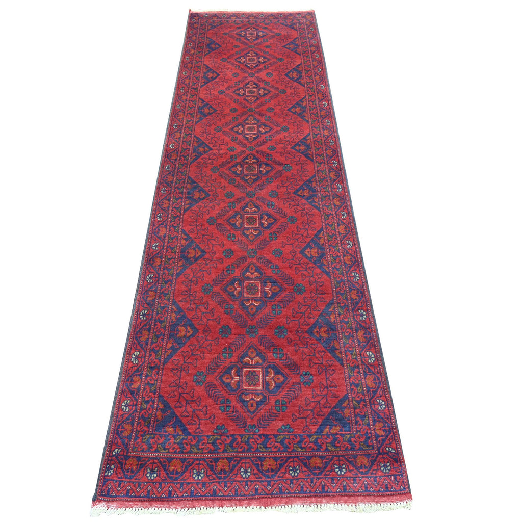 2'6"x9'4" Carmine Red, Hand Knotted, Afghan Andkhoy With Geometric Pattern, Soft And Velvety Wool, Runner, Oriental Rug FWR124302