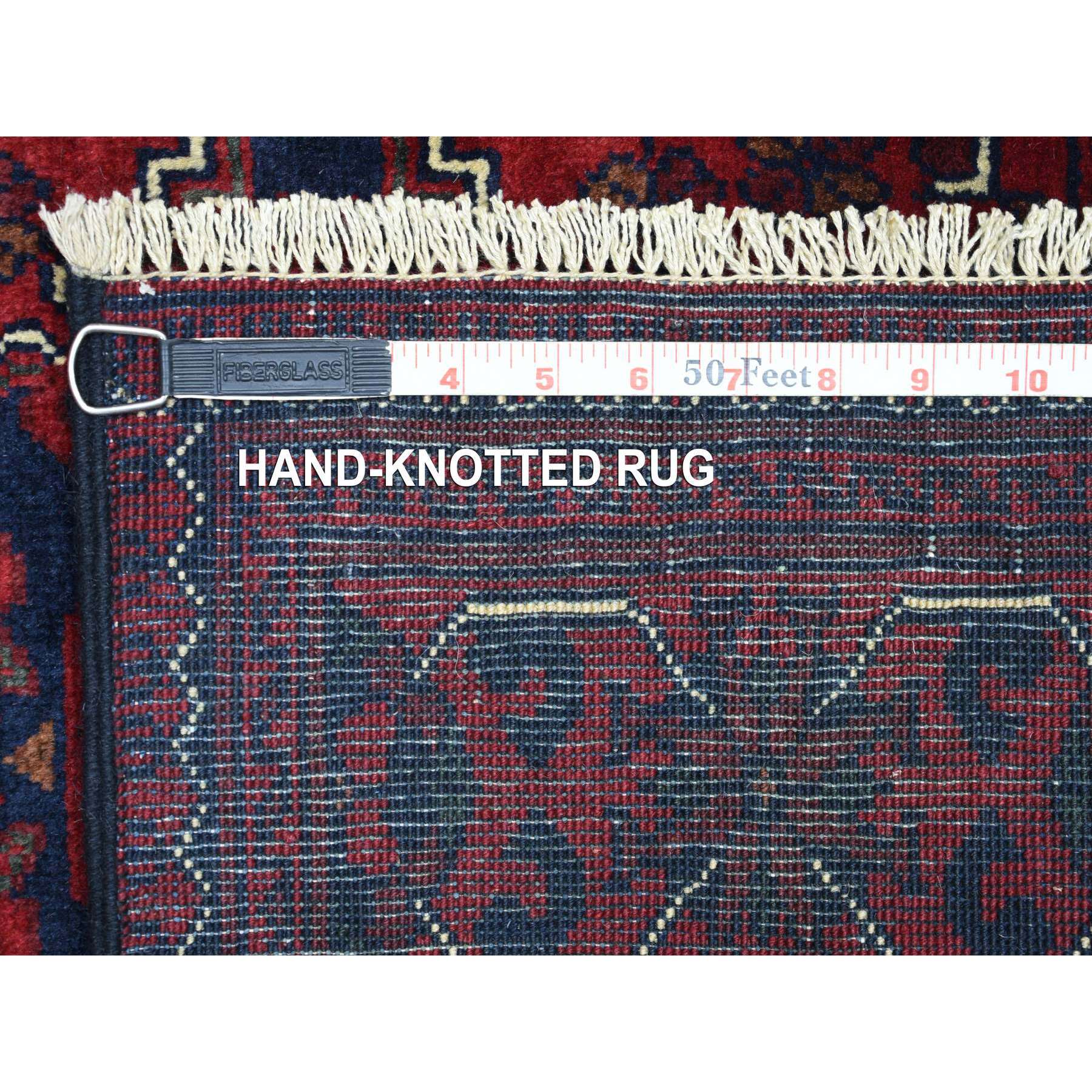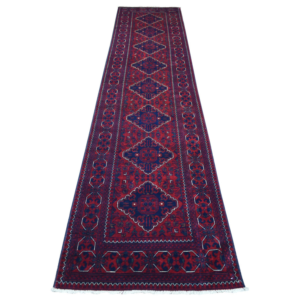 2'7"x13' Deep And Saturated Red With Touches Of Navy Blue, Afghan Khamyab With Geometric Medallions Design, Soft And Velvety Wool Hand Knotted, Runner Oriental Rug FWR430938