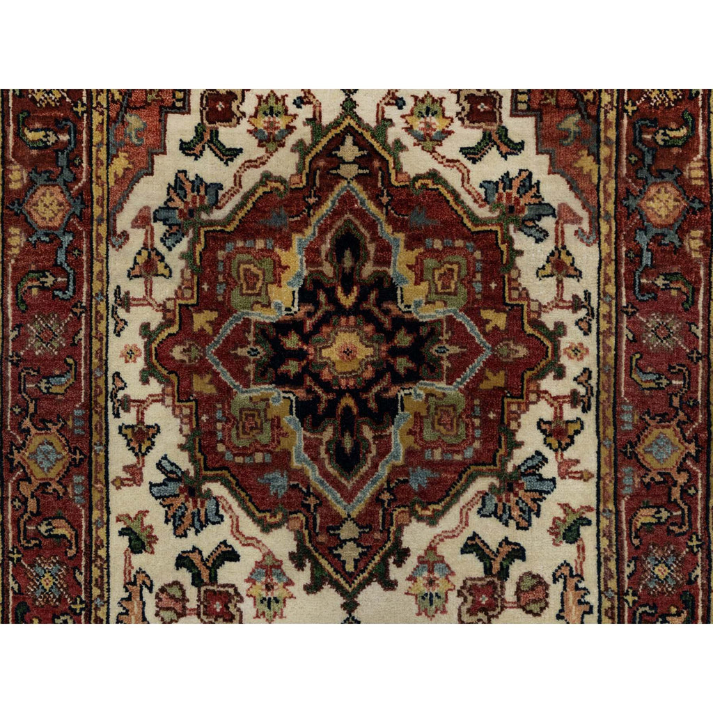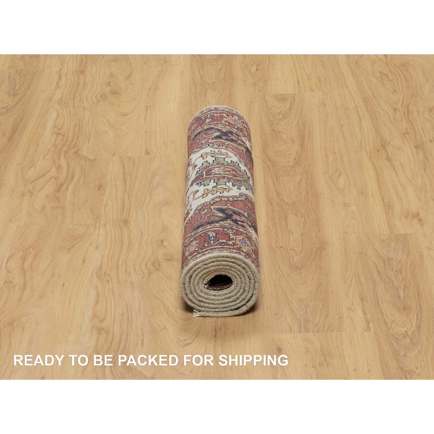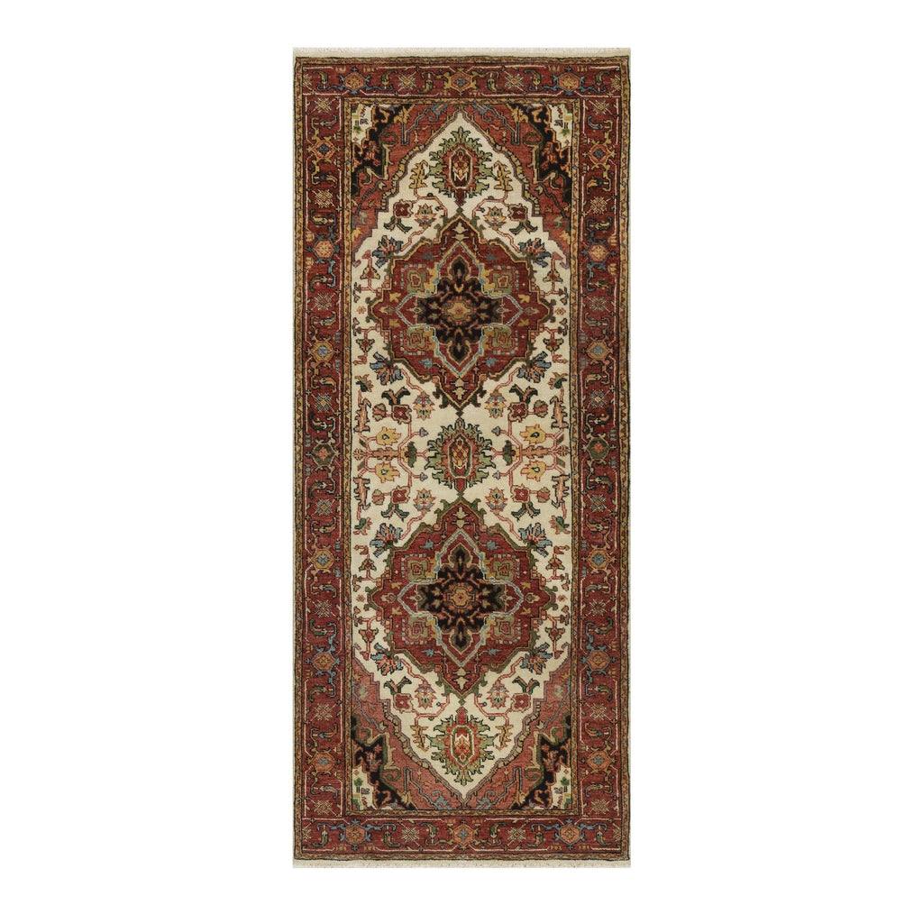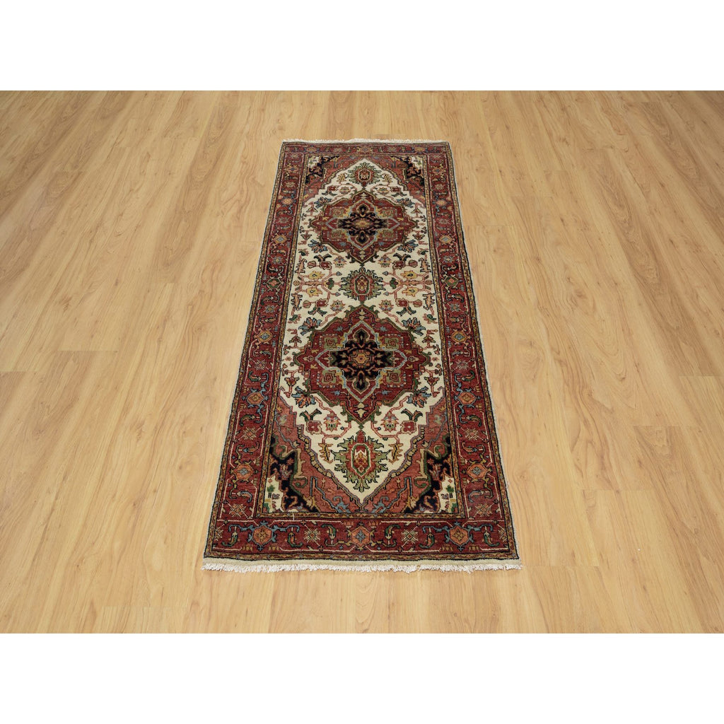 2'7"x6'2" Chiffon White With Red, Antiqued Fine Heriz Re-creation With Medallion Design, Denser Weave, Hand Spun New Zealand Wool, Hand Knotted, Runner, Oriental Rug FWR546546