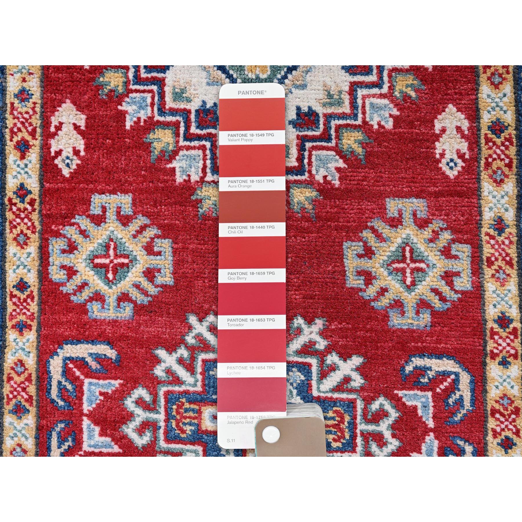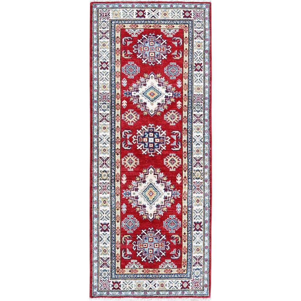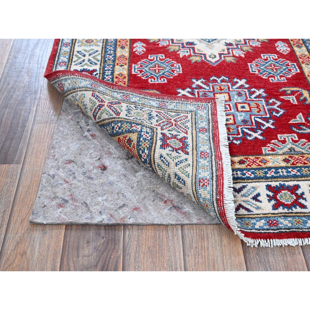 2'7"x6'5" Chili Red, Kazak With Geometric Medallions Design, Soft And Shiny Wool, Hand Knotted, Vegetable Dyes, Denser Weave, Runner, Oriental Rug FWR2568