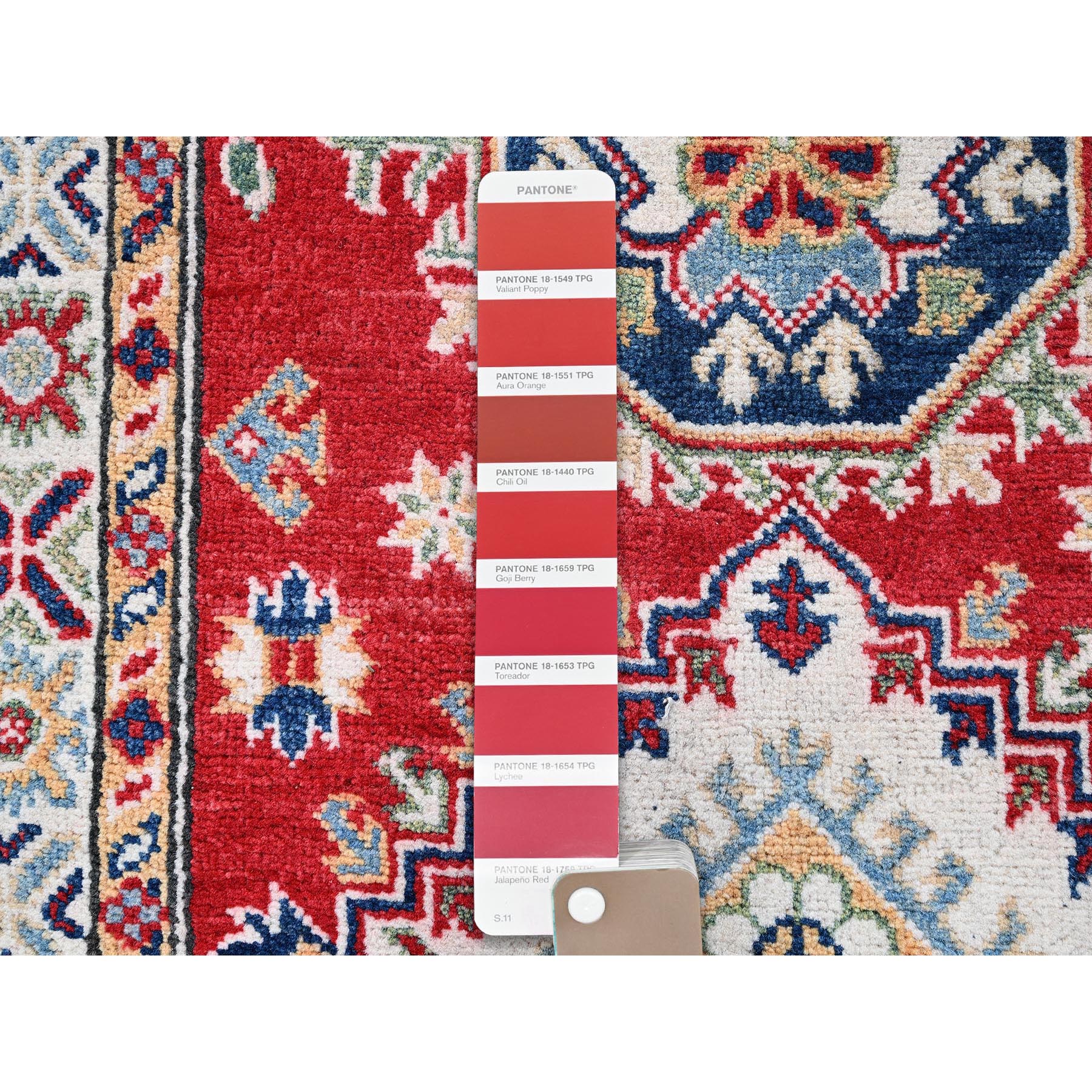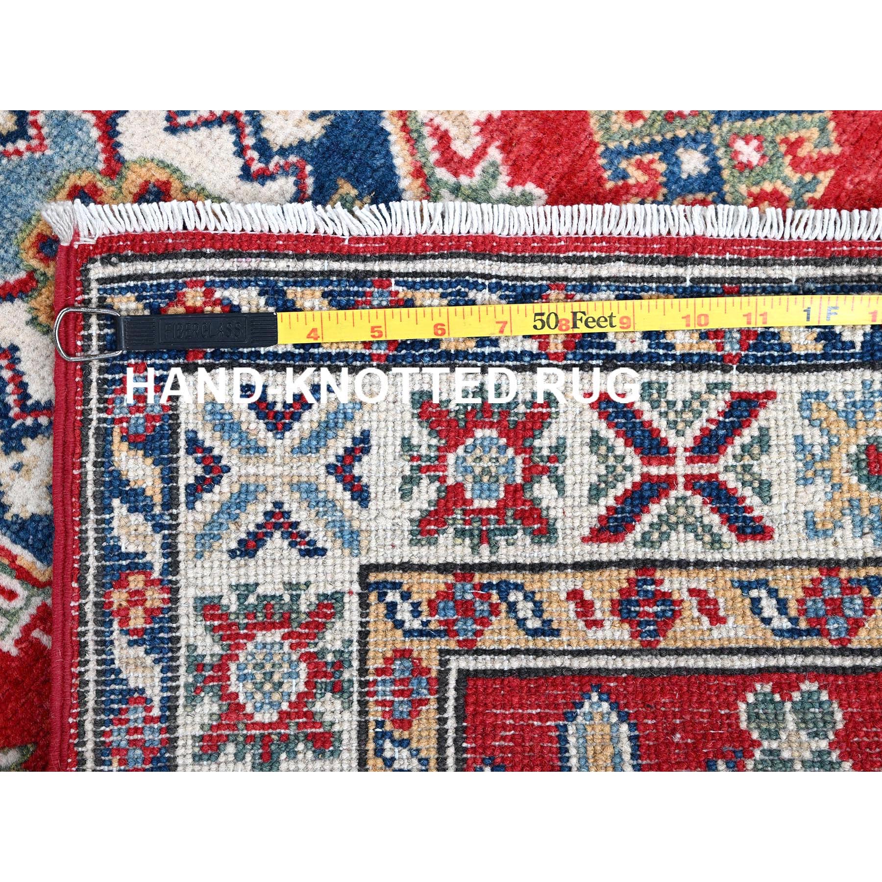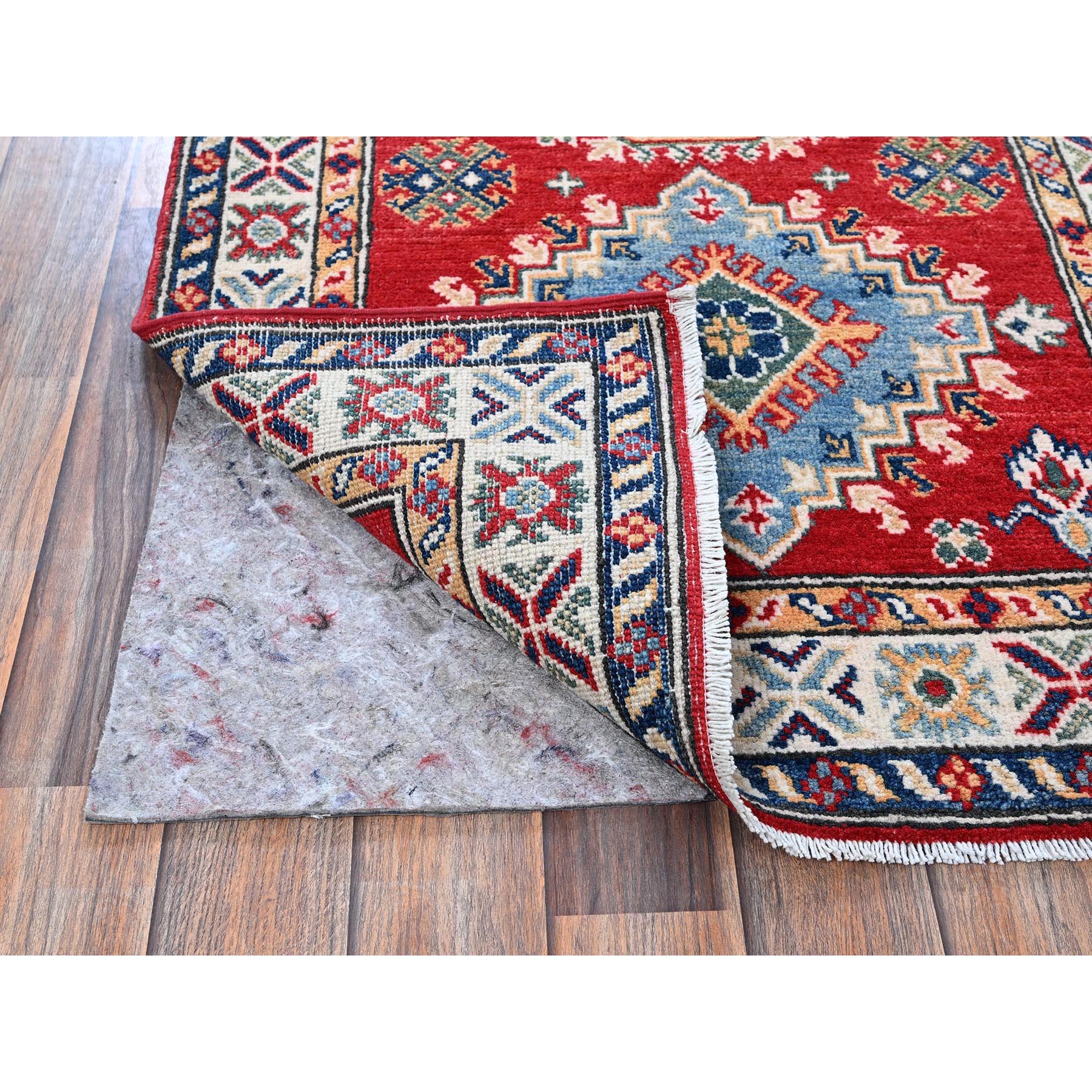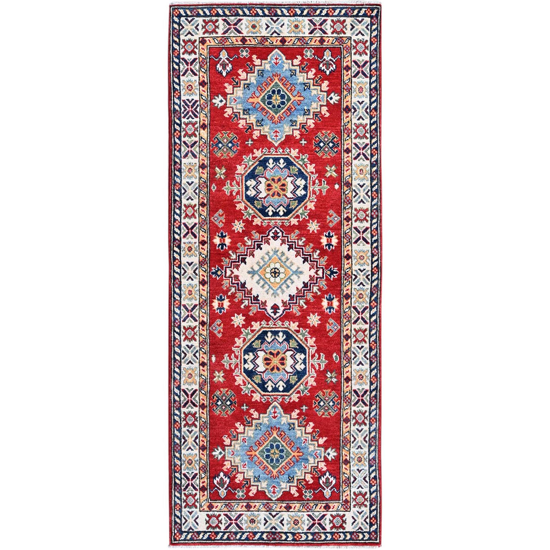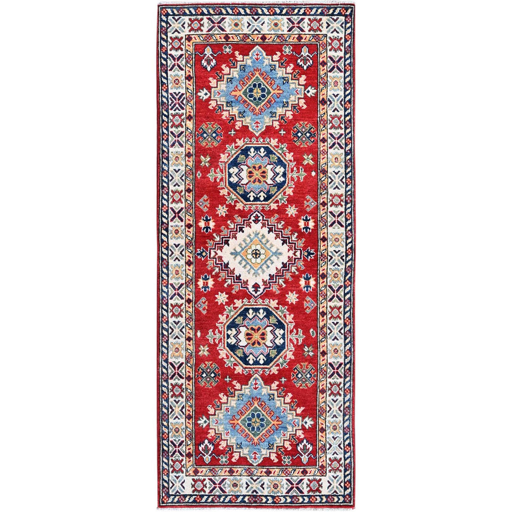 2'7"x6'9" Ajax Red, Kazak With Geometric Medallions Design, Soft And Shiny Wool, Hand Knotted, Vegetable Dyes, Denser Weave, Runner, Oriental Rug FWR2706