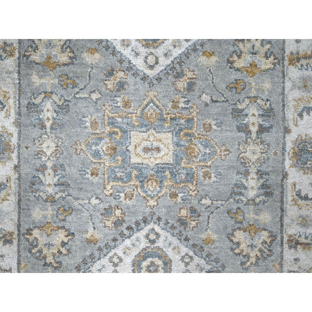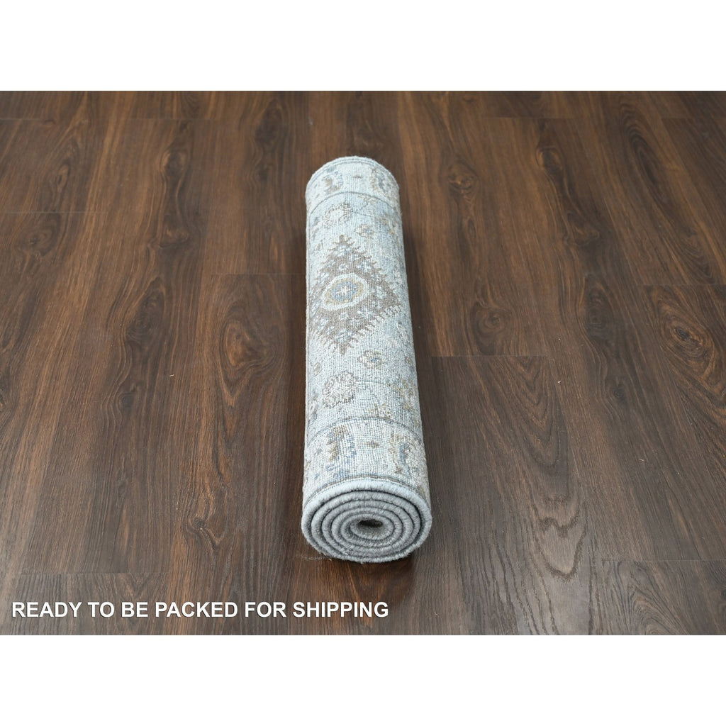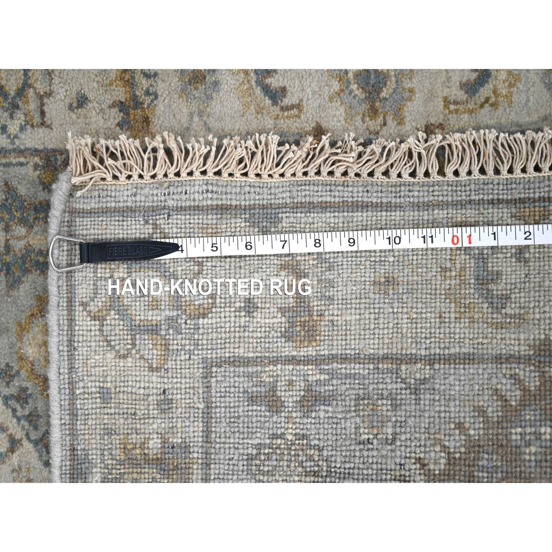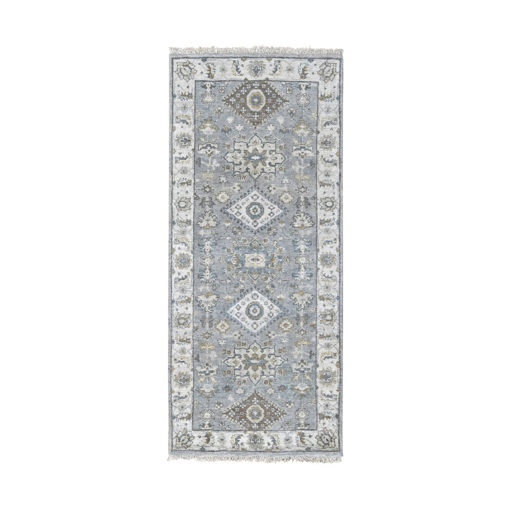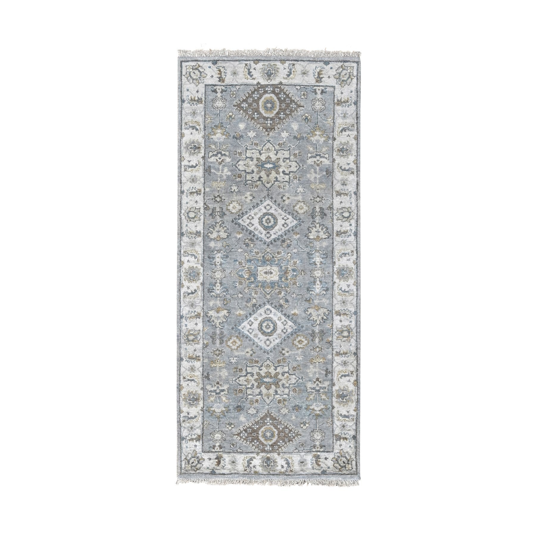 2'7"x6' Flannel Gray, Ivory Border, Hand Knotted, Natural Dyes, Karajeh Design With Geometric Pattern, Shiny Wool, Oriental Runner Rug FWR509448