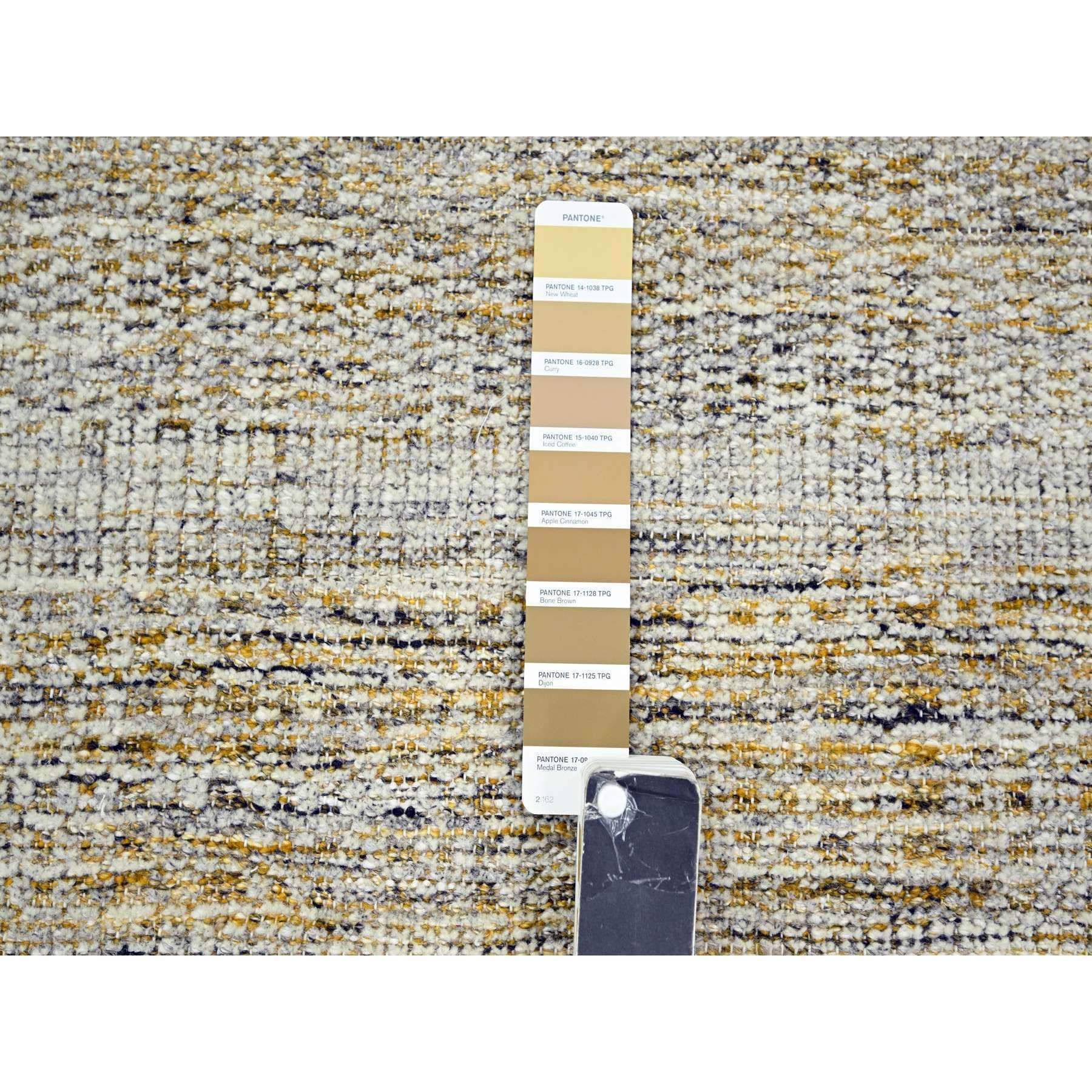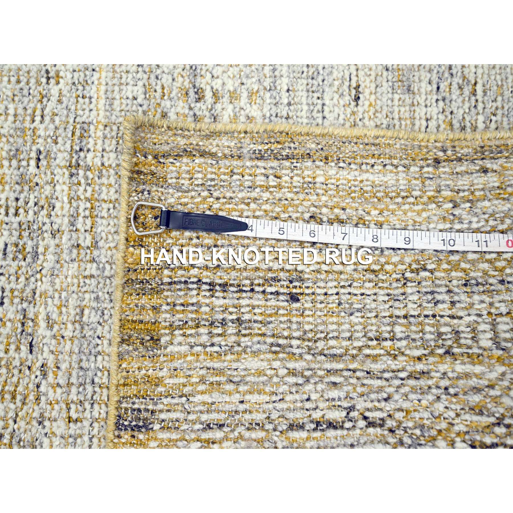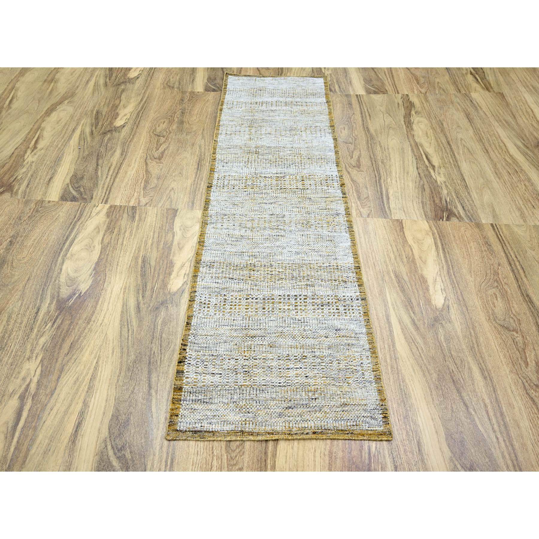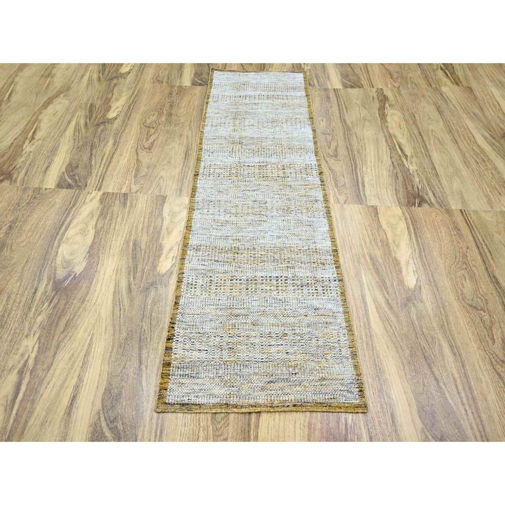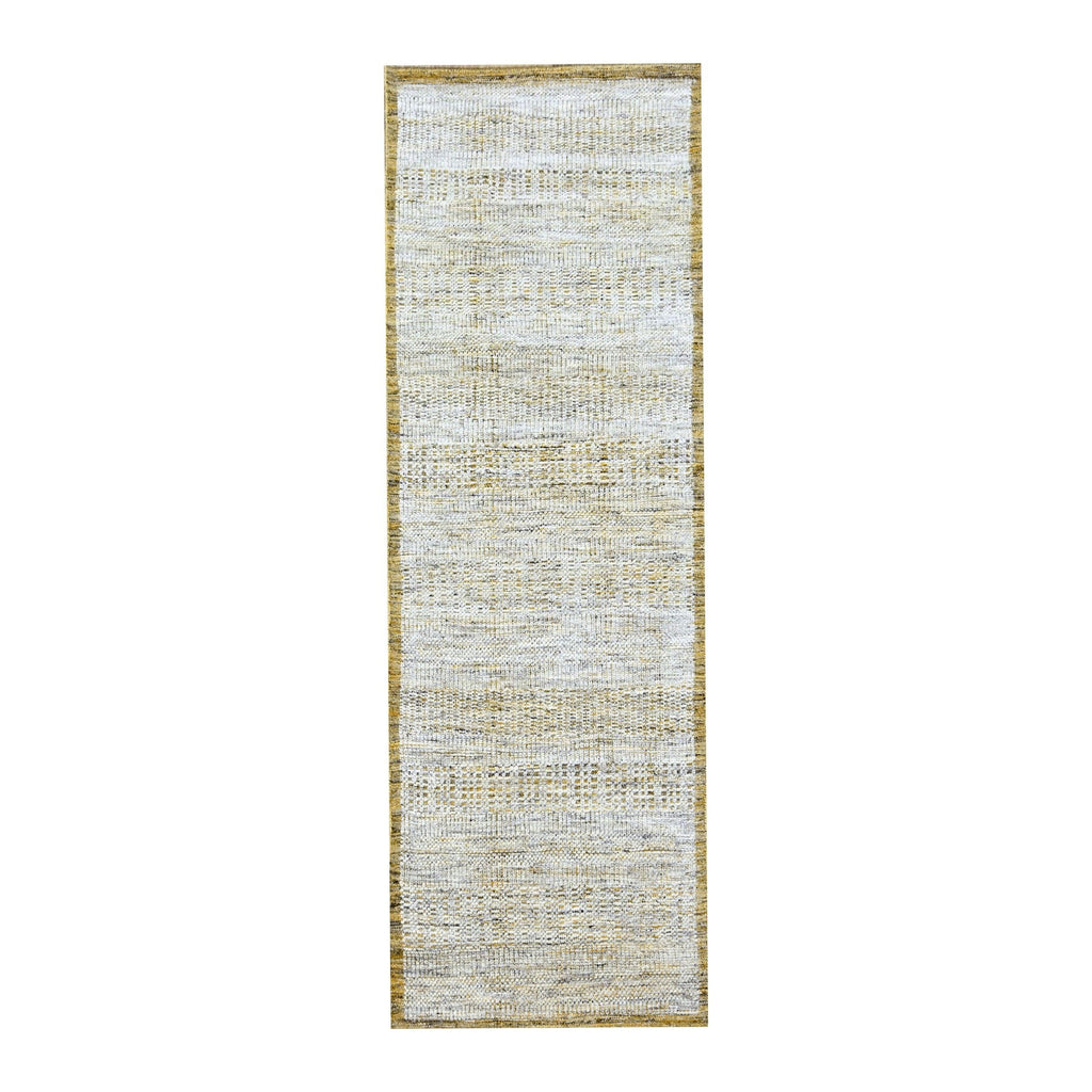 2'7"x8'2" Snow White With Golden Yellow, Hand Knotted, Oxidized And Distressed Grass Design With Exposed Warps, 100% Wool, Runner, Oriental Rug FWR457482