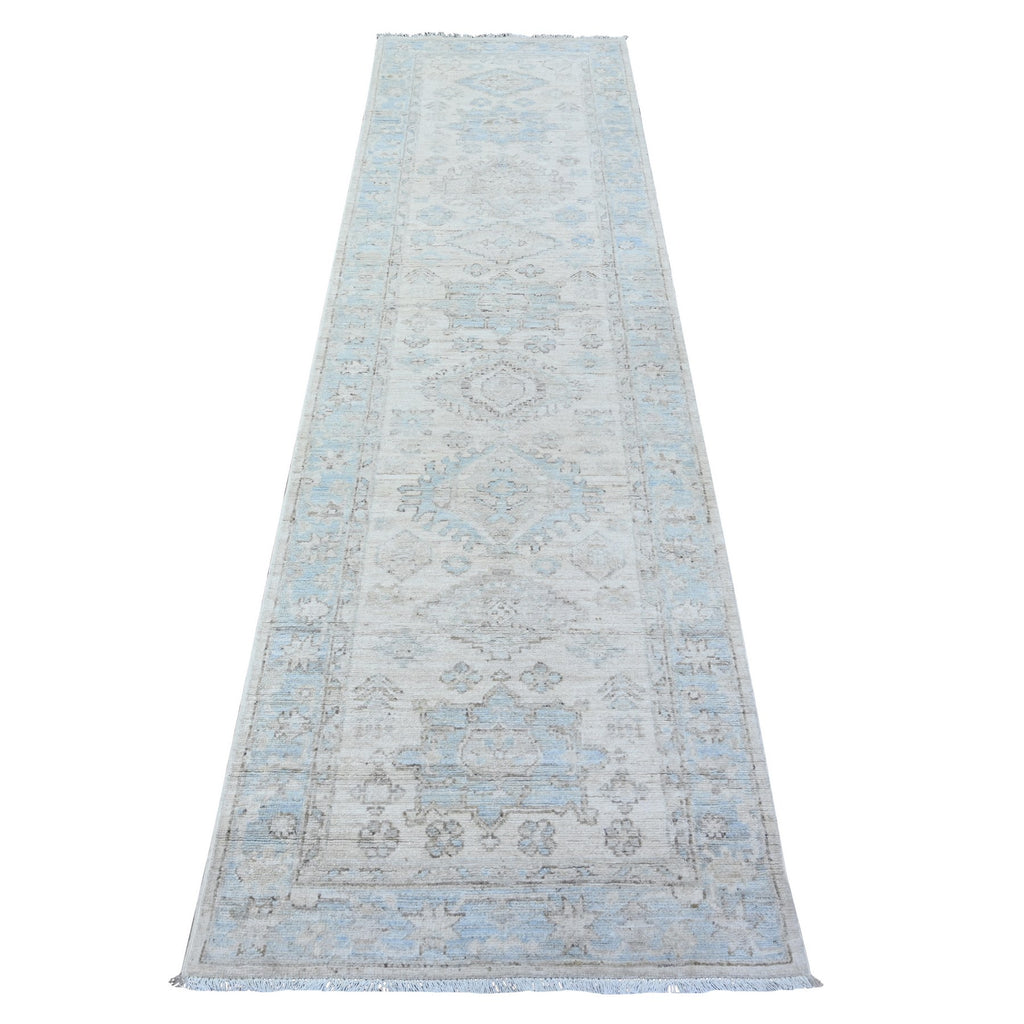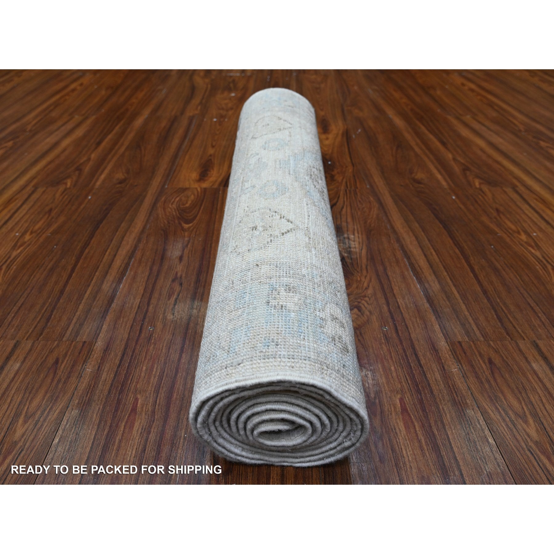 2'7"x9'5" Cloud White, Hand Knotted, Shabby Chic, Soft Wool, White Wash Peshawar, Runner Oriental Rug FWR531816