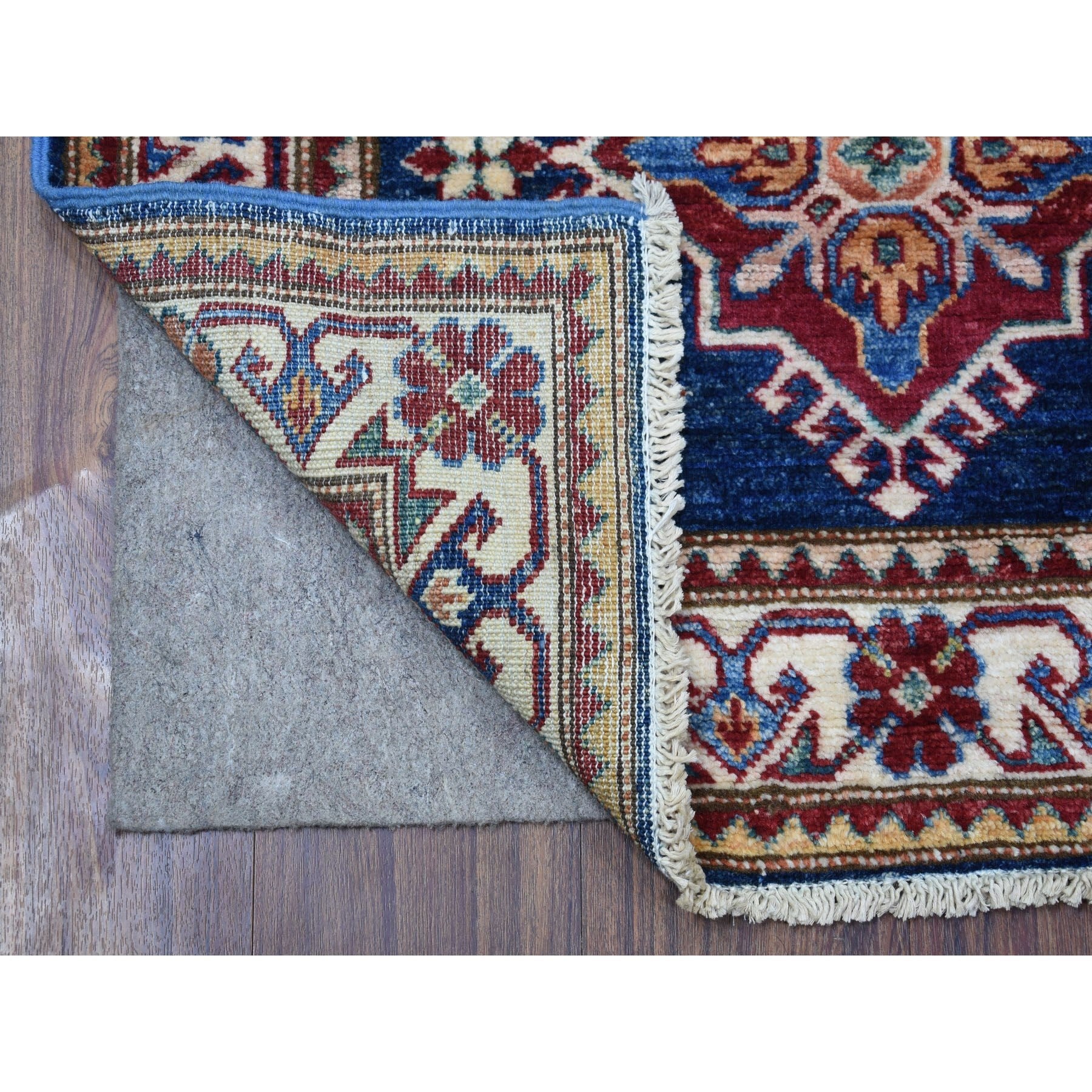 2'8"x10'5" Hand Knotted Denim Blue Extra Soft Wool Super Kazak With Tribal Medallions Design Oriental Runner Rug FWR409080