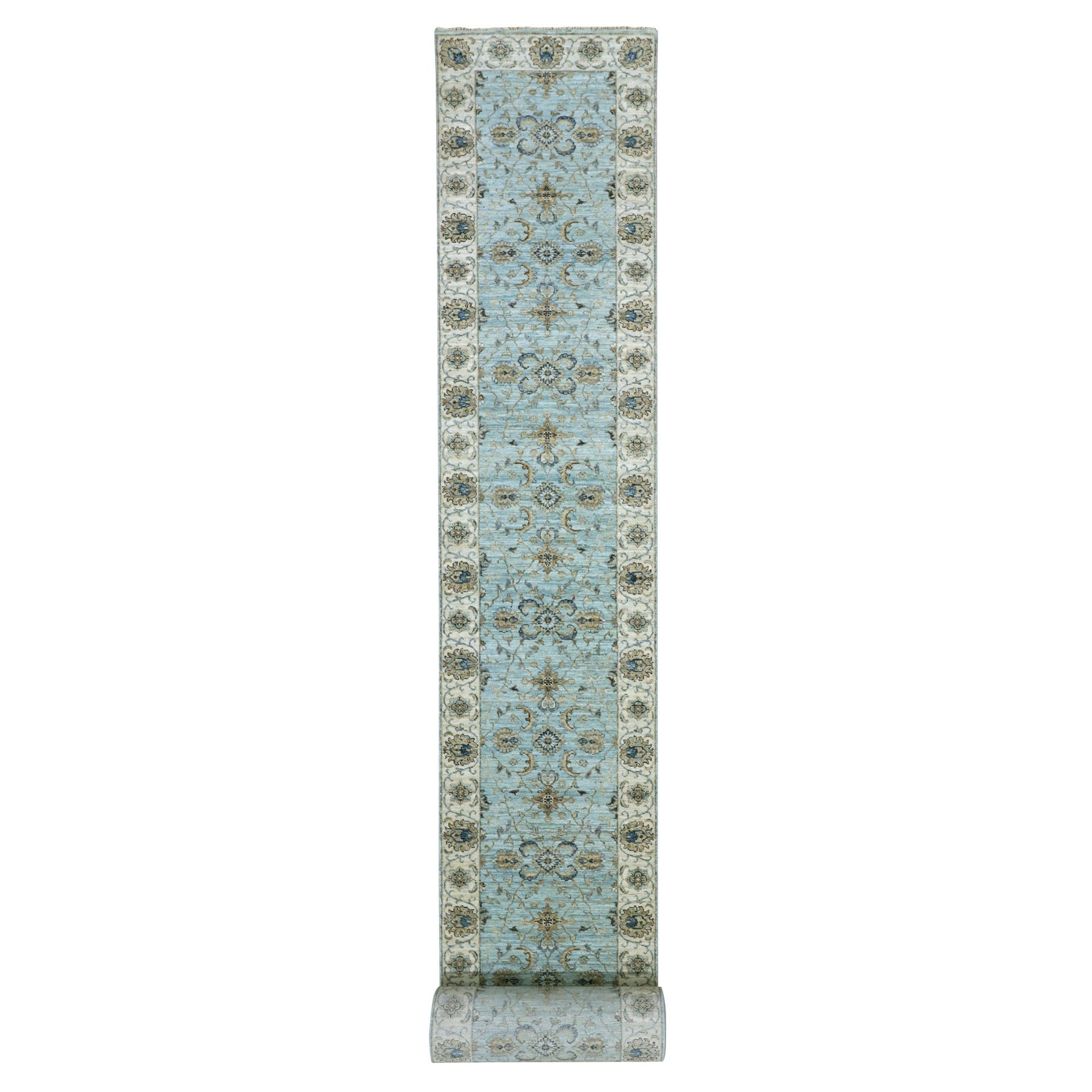 2'8"x29'9" Shades Of Blue With Cornsilk White, Shiny Wool, Hand Knotted Vegetable Dyes, Shah Abbas Agra Floral Motifs, Densely Woven Xl Runner Oriental Rug FWR456234
