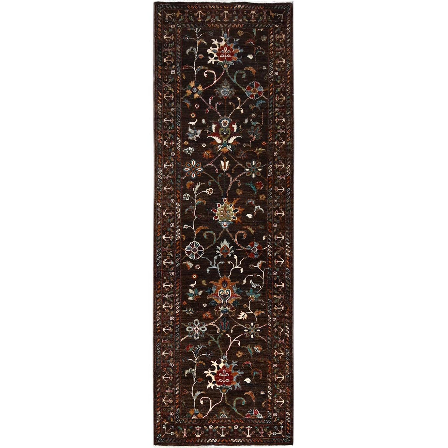 2'8"x8'5" Dark Choclate Brown, Hand Knotted, Densely Woven, Velvety Wool, Flower Blossom Design, Oriental Afghan Sultani Runner Rug FWR521382