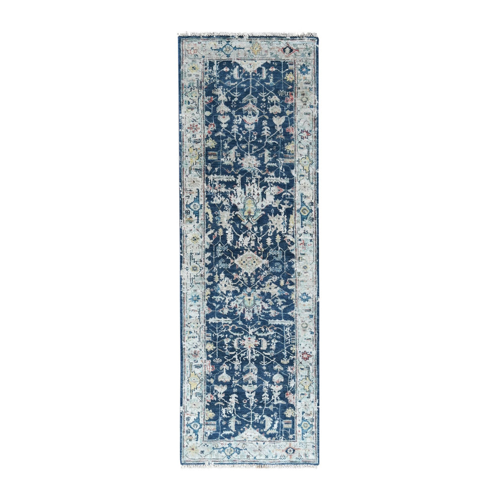 2'8"x8' Navy Blue, Denser Weave, Broken And Erased Persian Heriz All Over Design, Soft Color Palette, Hand Knotted, 100% Wool, Runner, Oriental Rug FWR61908