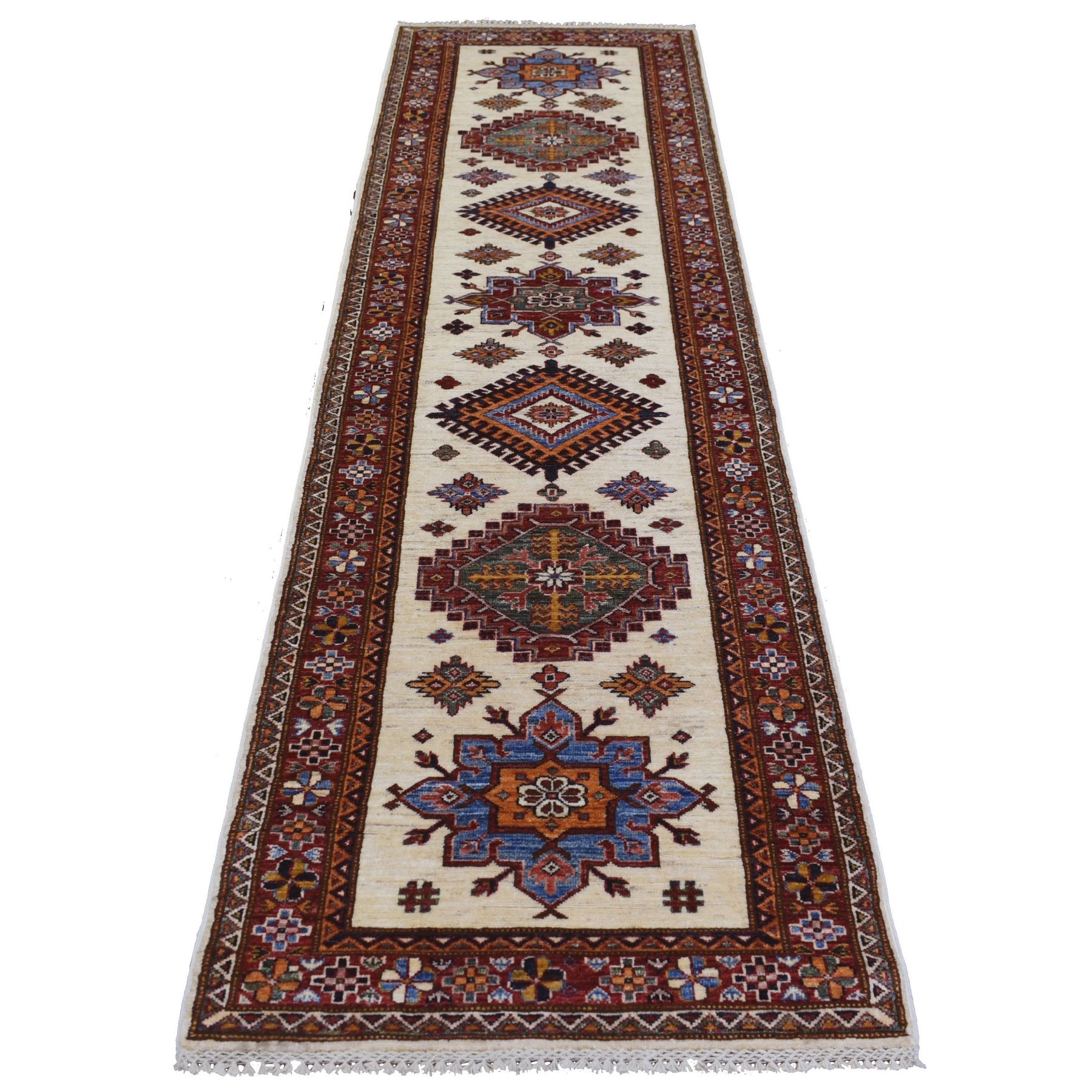 2'8"x9'4" Ivory Natural Dyes, Afghan Super Kazak With Geometric Design, Hand Knotted Pure Wool Oriental Rug FWR427302