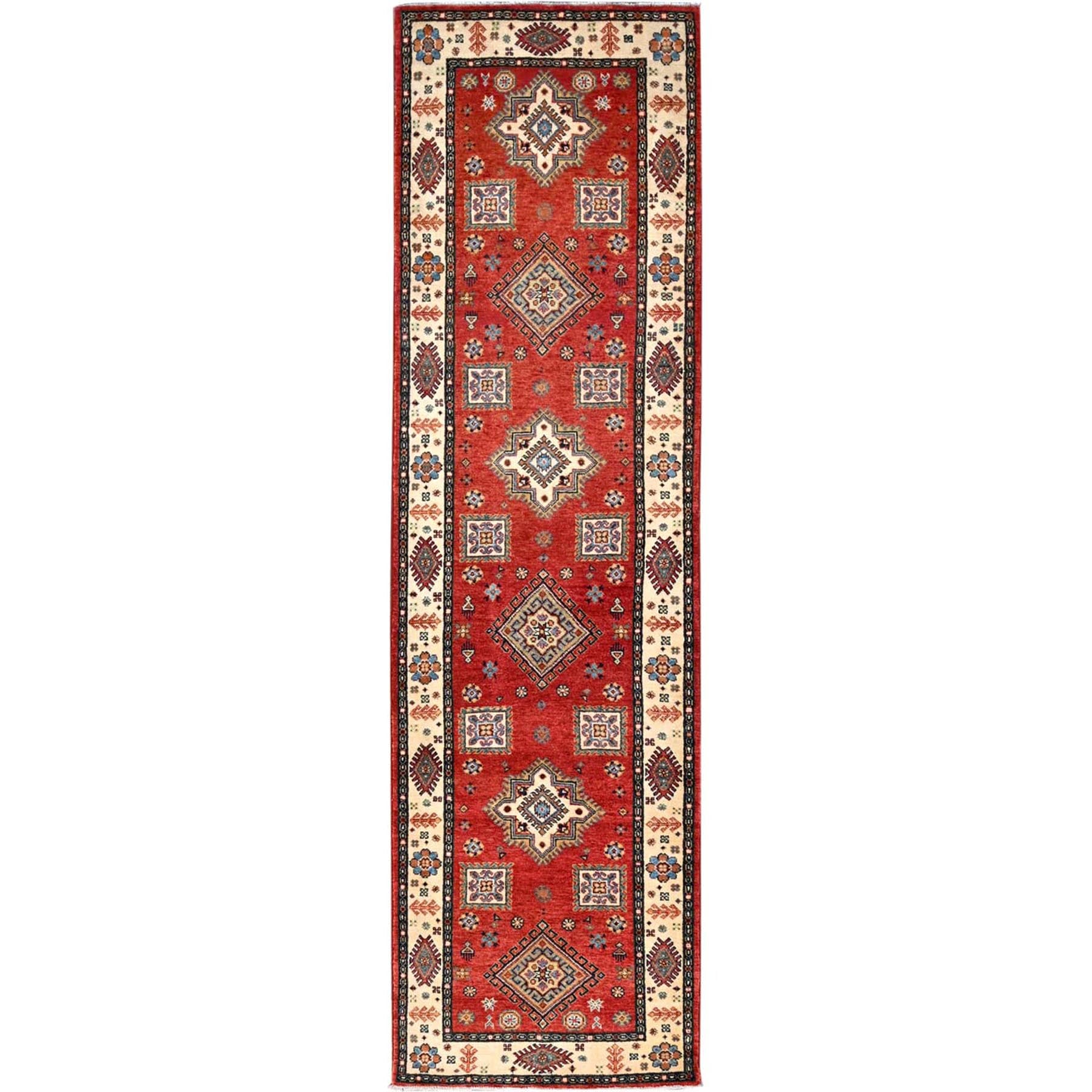 2'8"x9'6" Lattice Red, Hand Knotted Afghan Special Kazak With Geometric Elements, Natural Dyes Densely Woven, Pure Wool, Runner Oriental Rug FWR518700