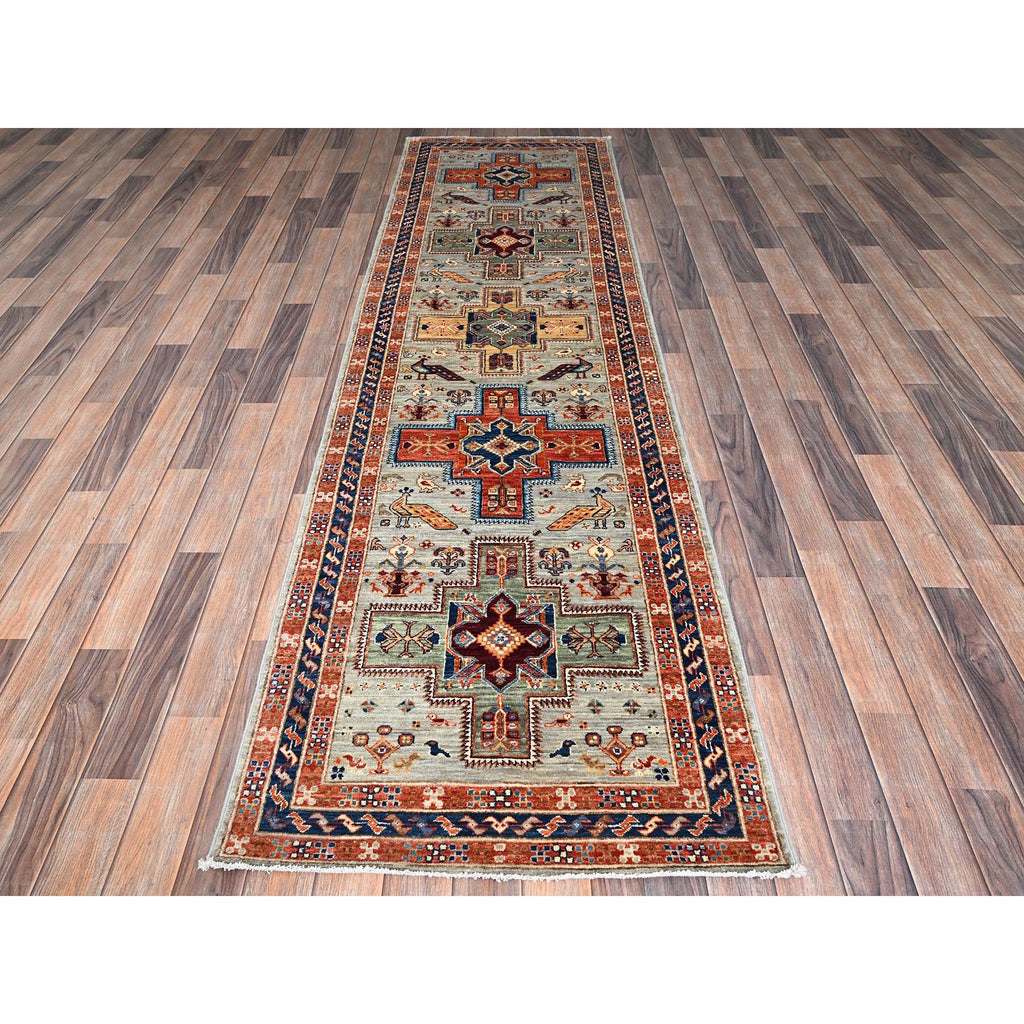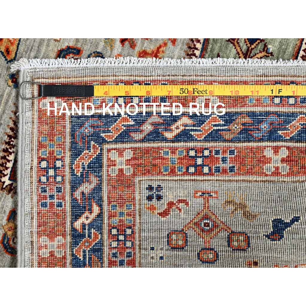 2'8"x9'7" Misty Gray, Armenian Inspired Caucasian Design With Bird Figurines, 200 Kpsi, Super Fine Wool, Hand Knotted, Denser Weave, Vegetable Dyes, Runner, Oriental Rug FWR6900