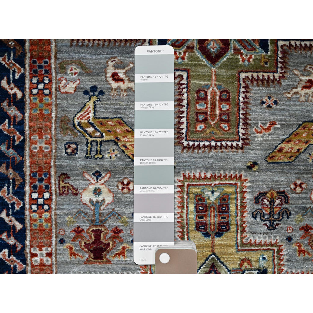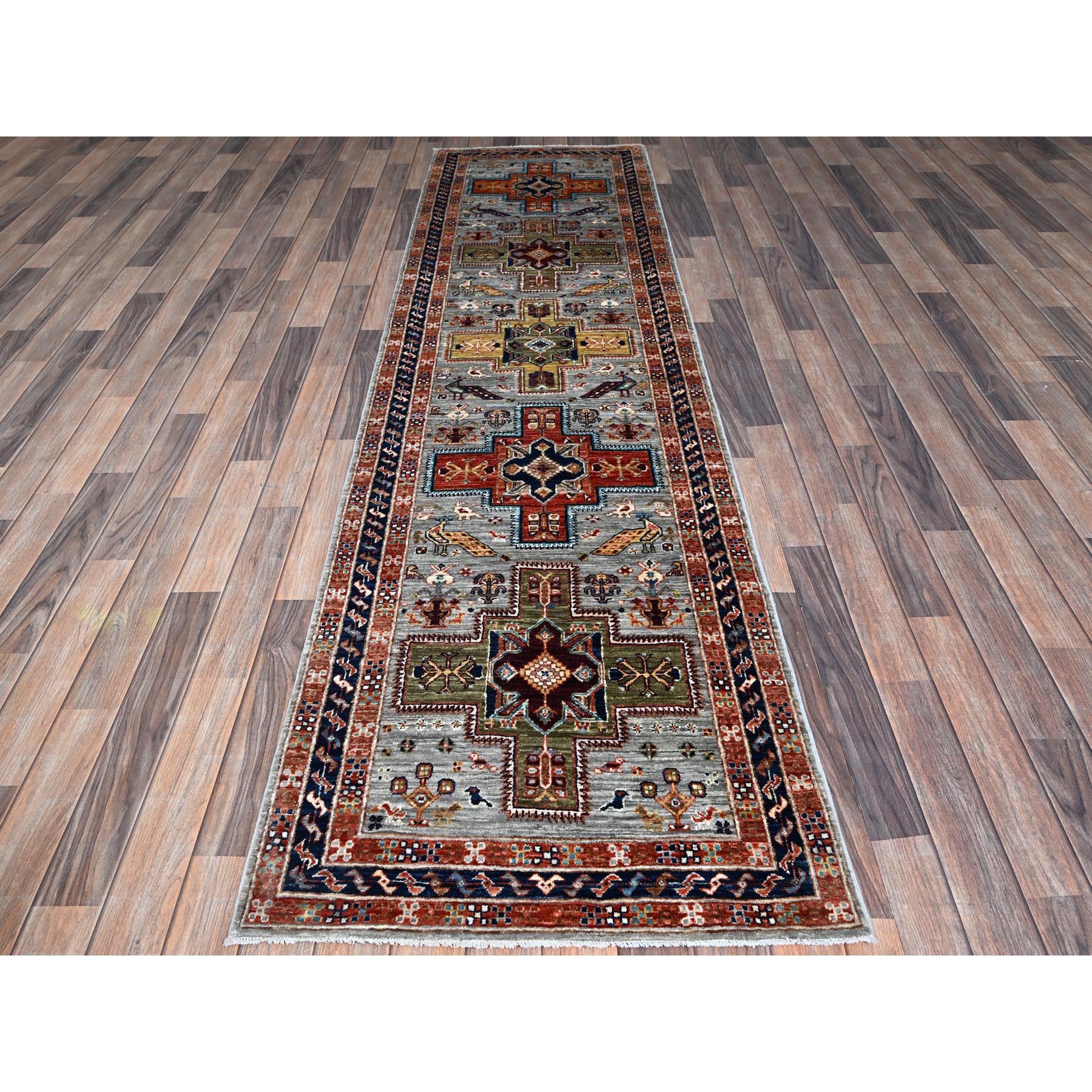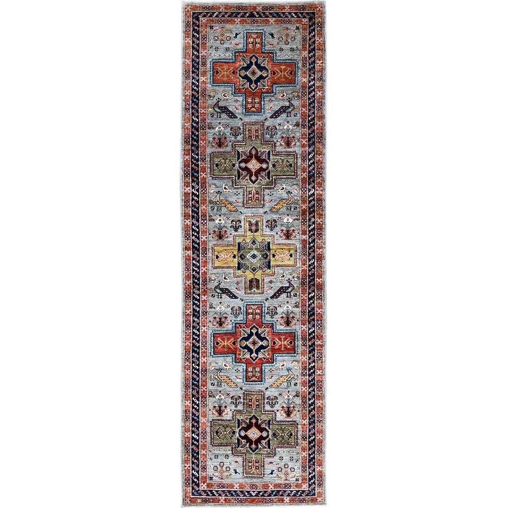 2'8"x9'8" Quiet Gray, Armenian Inspired Caucasian Design With Bird Figurines, Super Fine Wool, 200 Kpsi, Hand Knotted, Denser Weave, Vegetable Dyes, Runner, Oriental Rug FWR8064