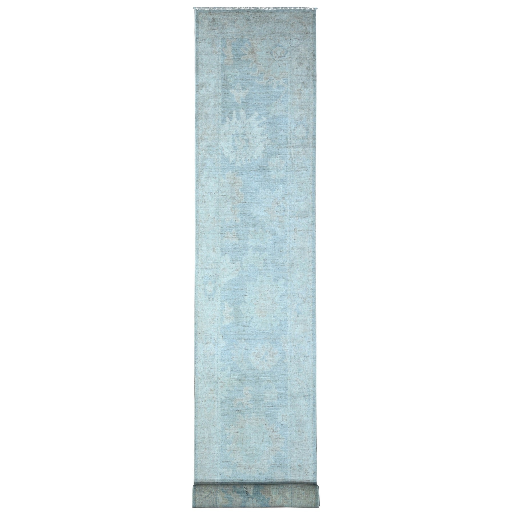 2'9"x19'6" Cloud Gray, Soft Wool Weft, Natural Dyes, Afghan Angora Oushak, Hand Knotted With Rural Floral Medallions All Over Design, Oversized Runner Oriental Rug FWR534942