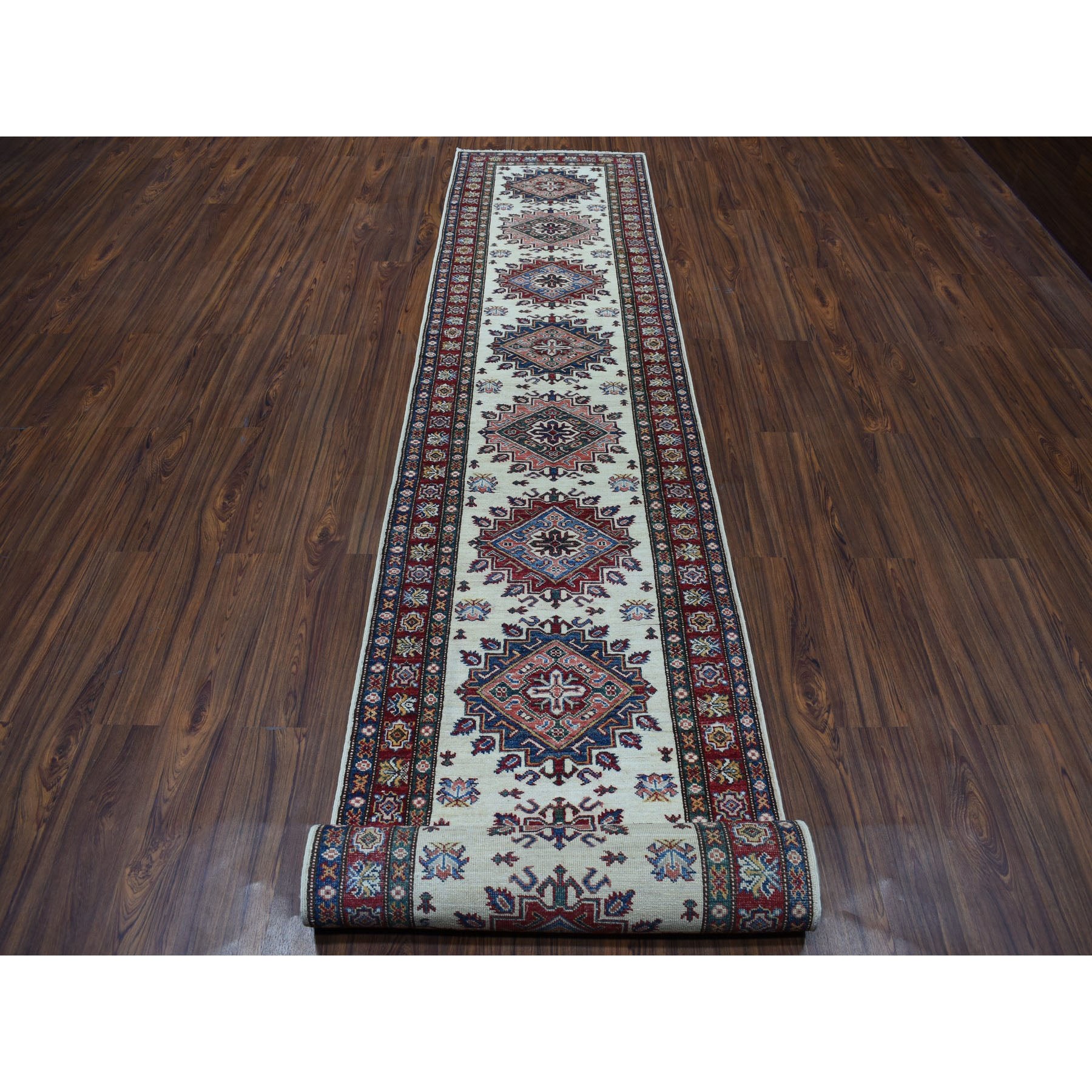 2'9"x19' Ivory Super Kazak Geometric Design Xl Runner Pure Wool Hand-knotted Oriental Rug FWR303876