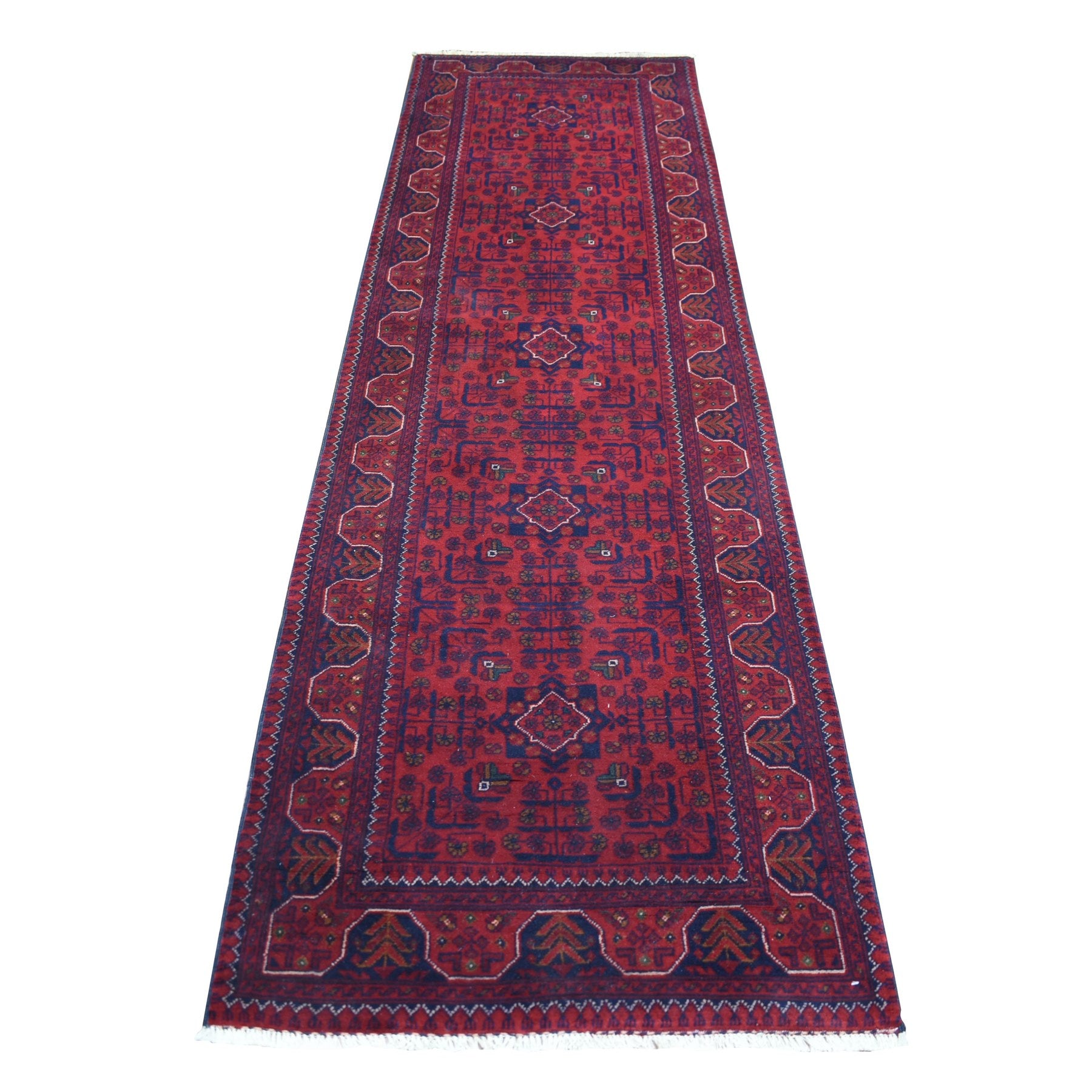 2'9"x9'10" Deep And Saturated Red Hand Knotted With Tribal Design, Soft And Shiny Wool Afghan Khamyab Runner Oriental Rug FWR432180