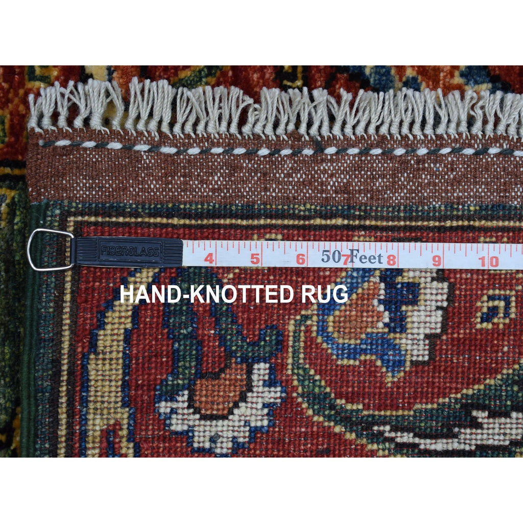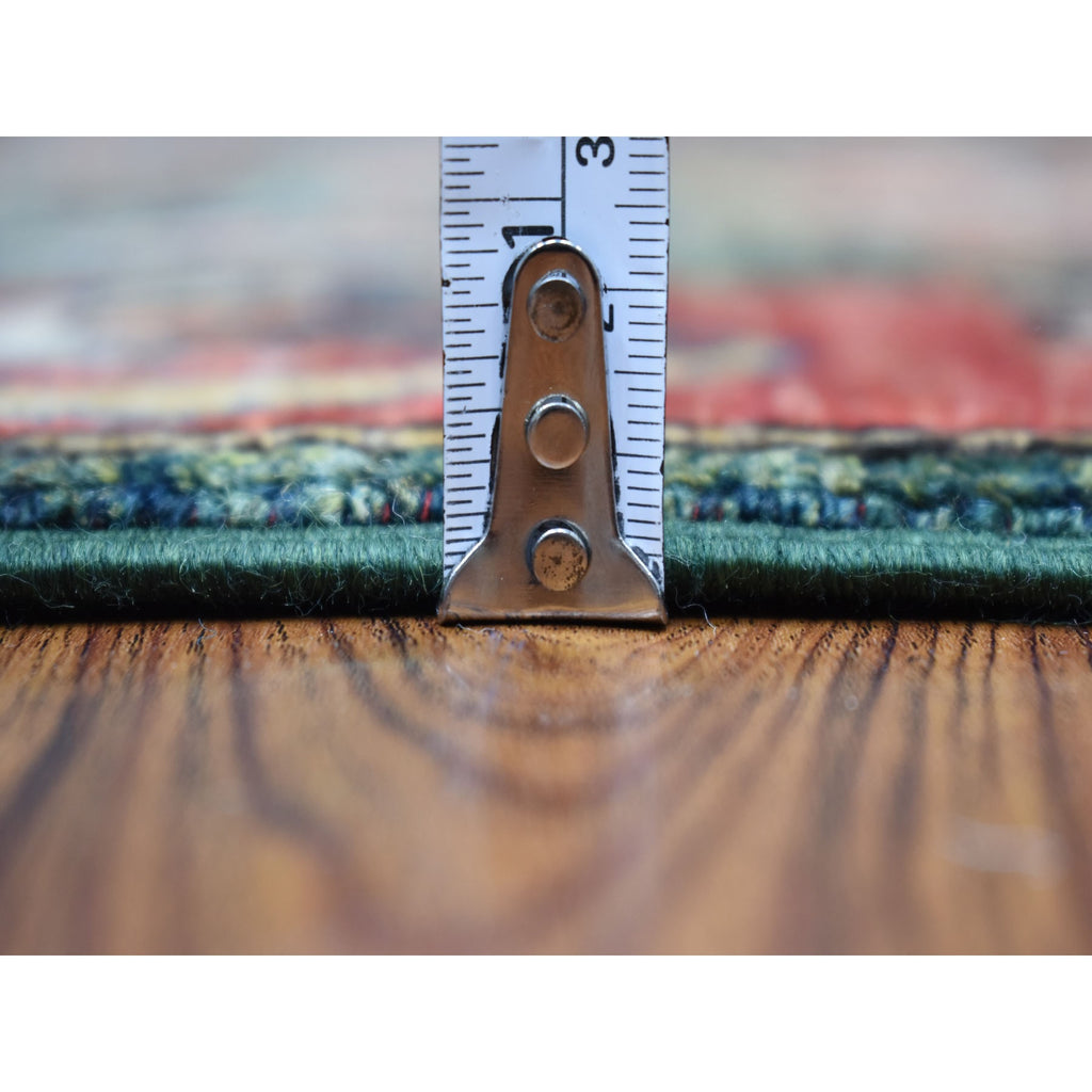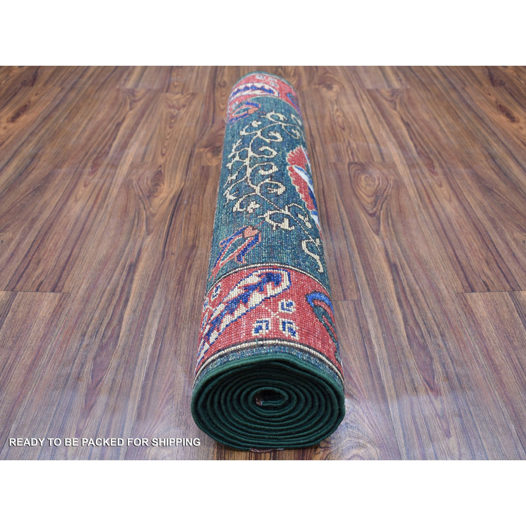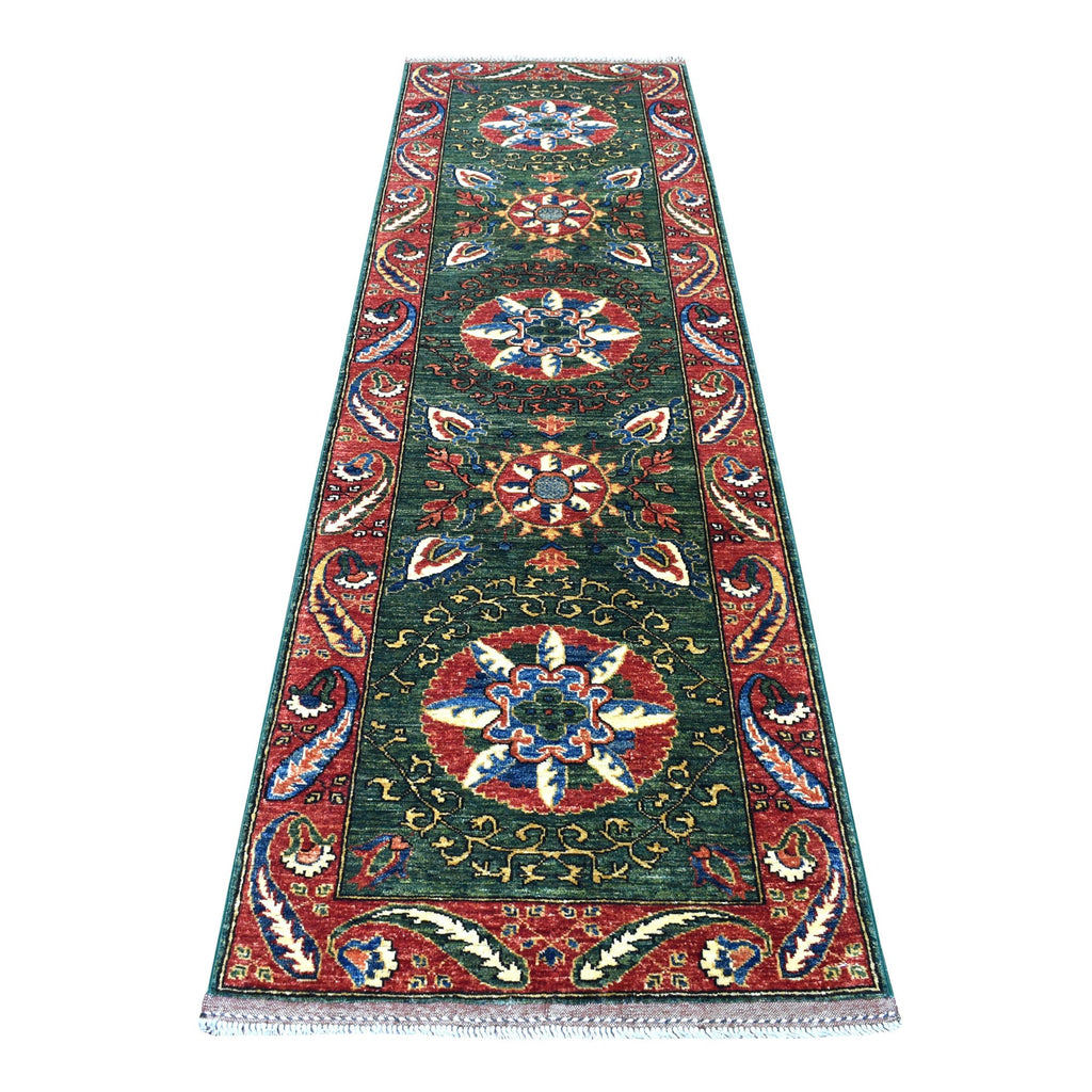 2'9"x9'7" Hand Knotted Green Afghan Turkoman Ersari With Tribal Design Pure Wool Oriental Runner Rug FWR340512