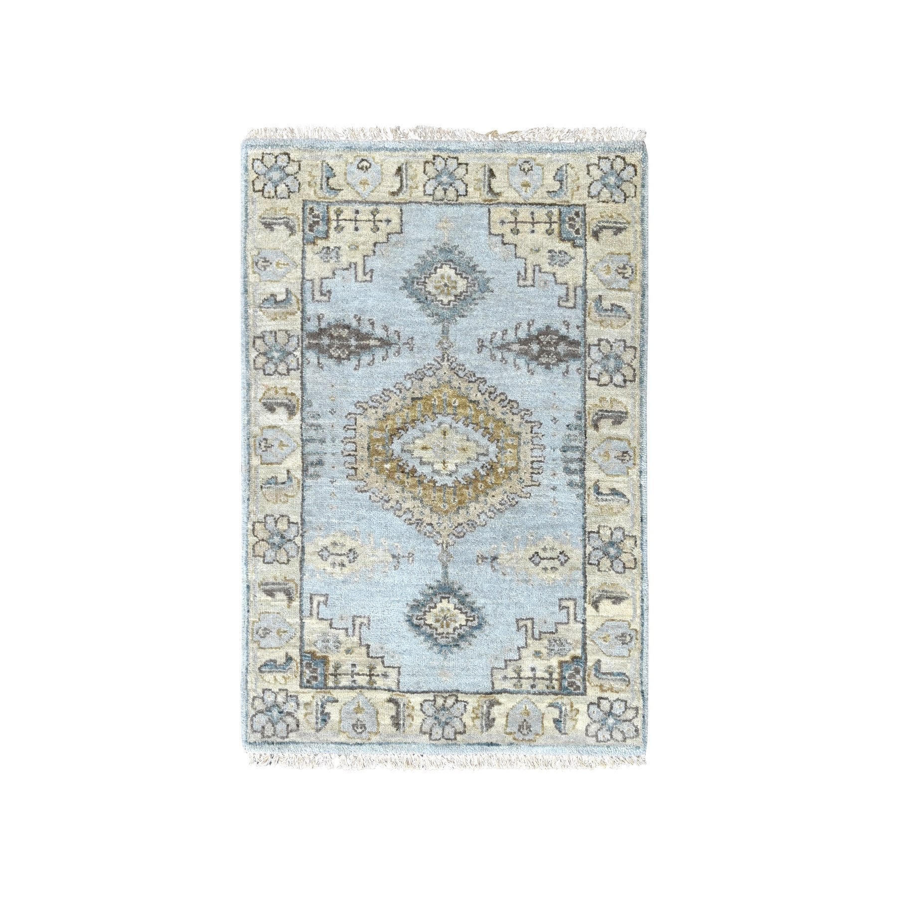 2'x3' Medium Gray, Persian Village Inspired Geometric Pattern, Hand Knotted, 100% Wool, Natural Dyes, Denser Weave, Sample, Mat, Oriental Rug FWR61938