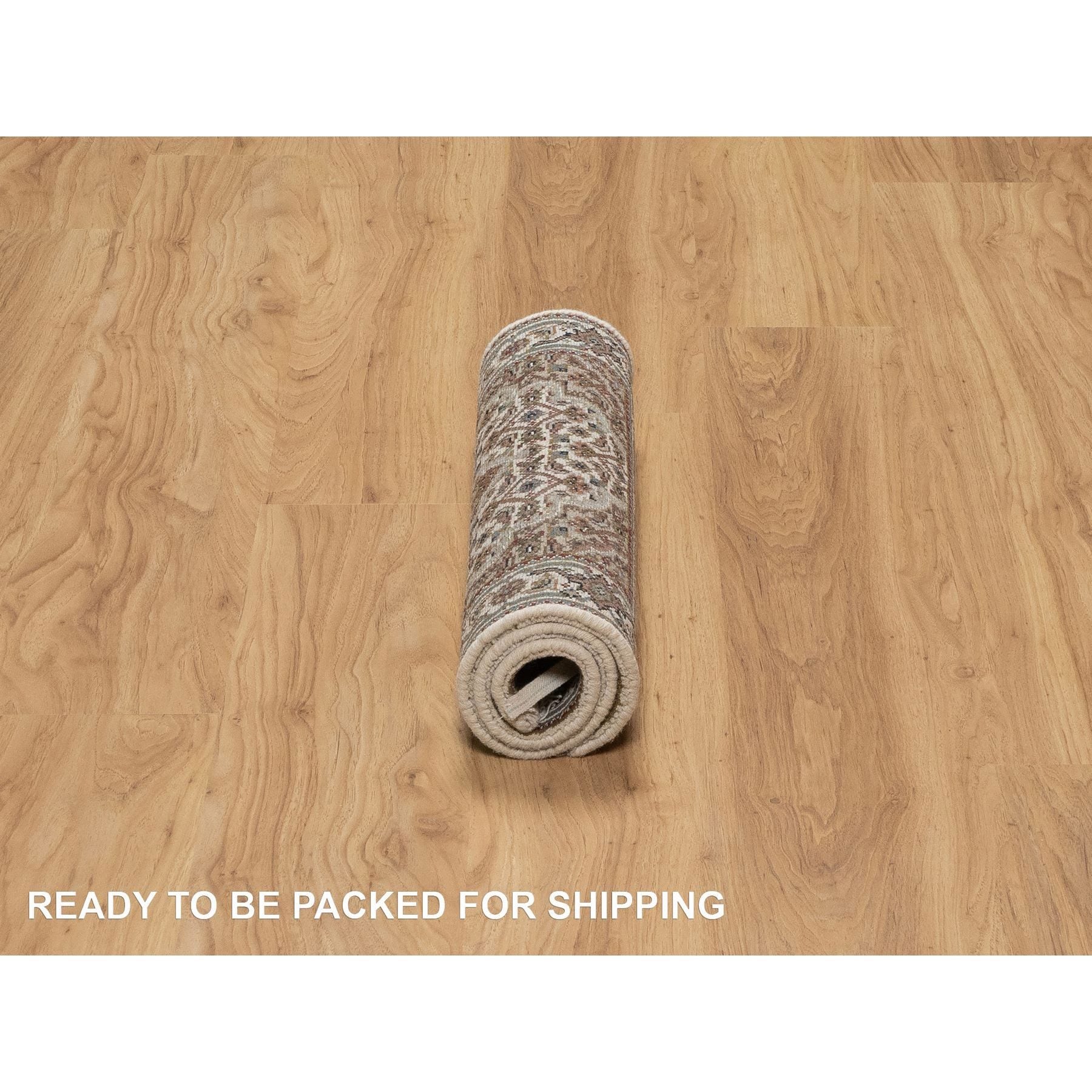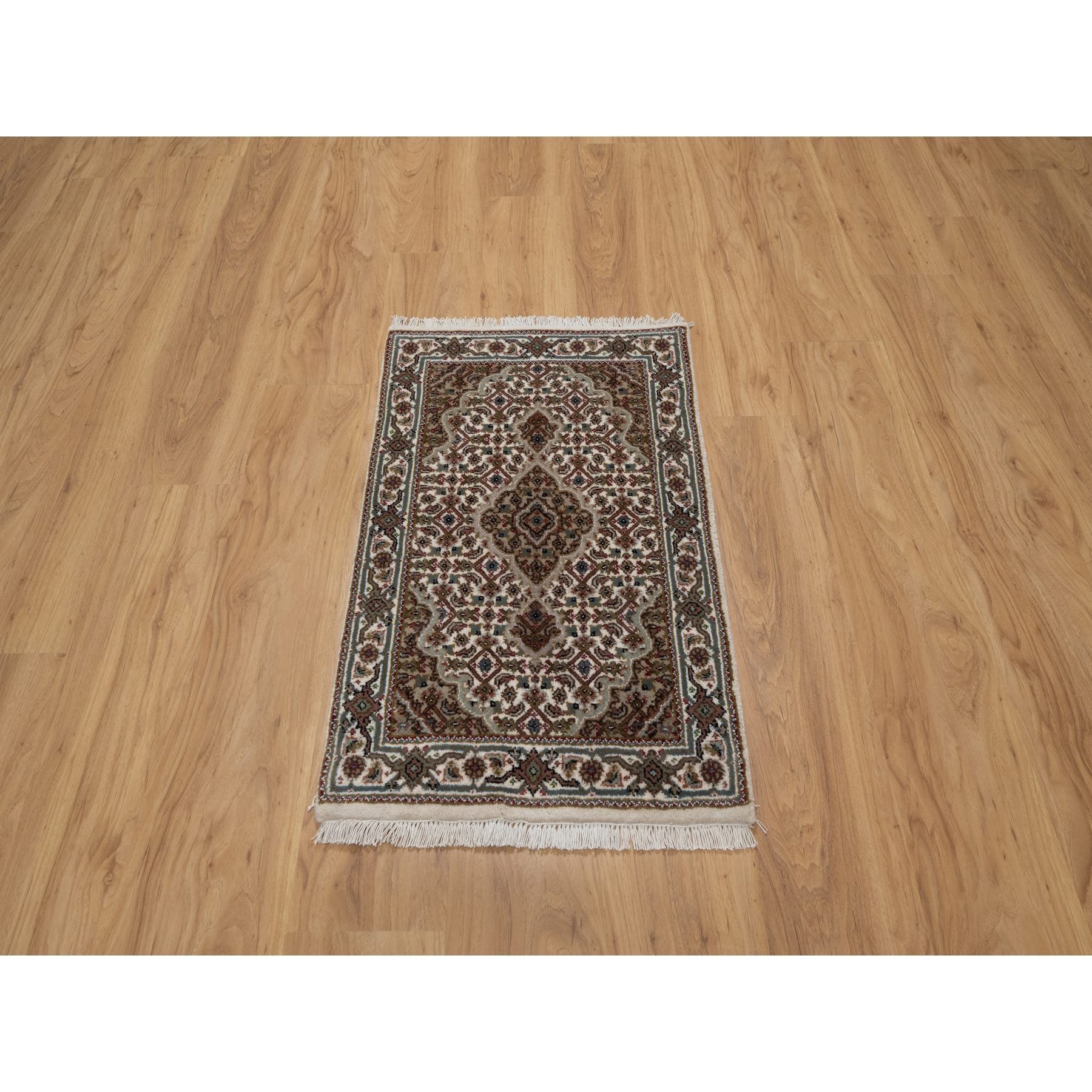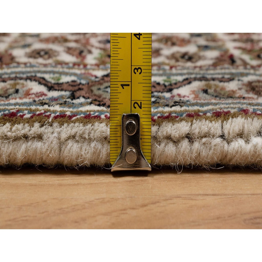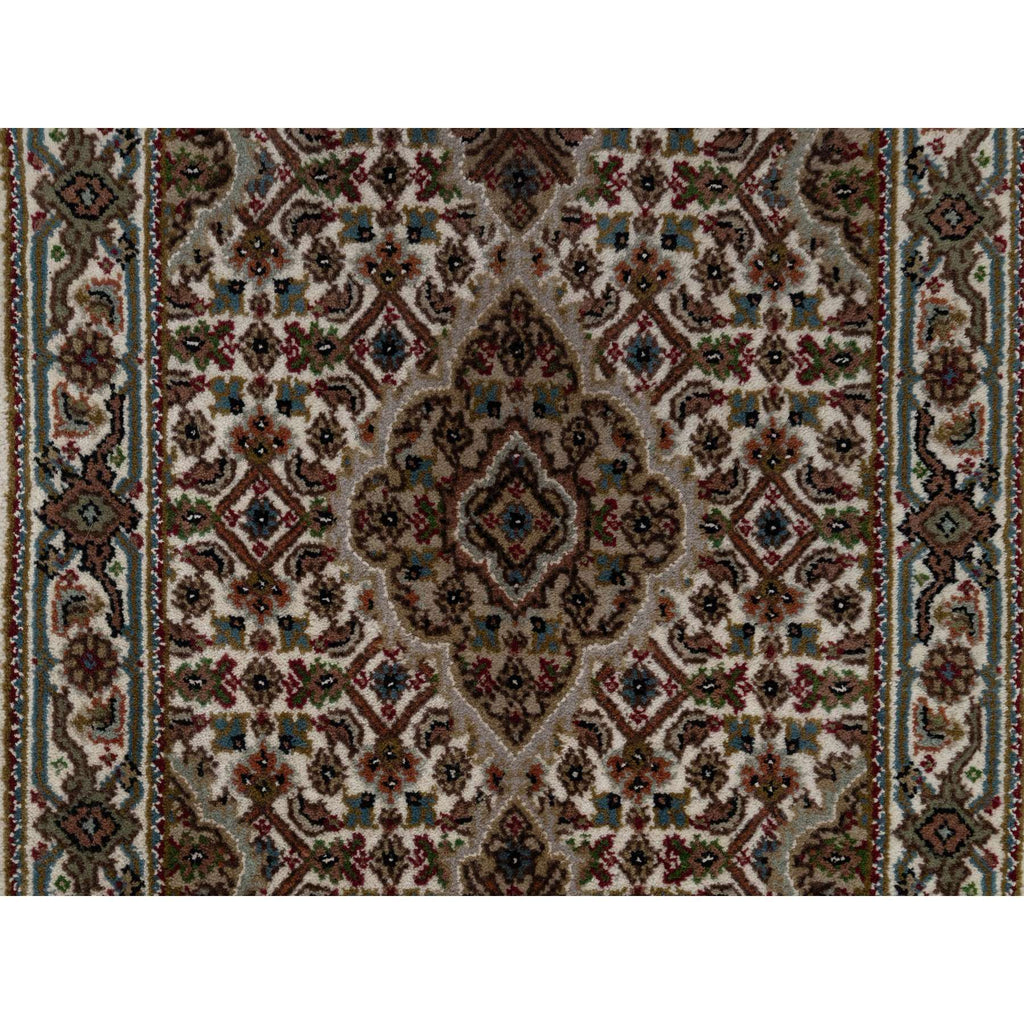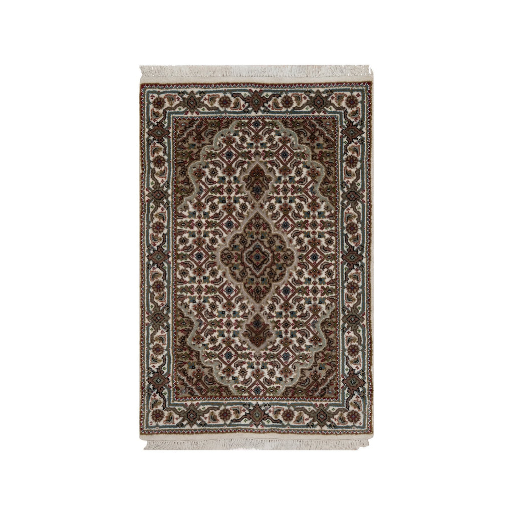 2'x3' Oyster White, Hand Knotted, Tabriz Mahi With Fish Medallion Design, Pure Wool, Denser Weave, Mat, Oriental Rug FWR546180