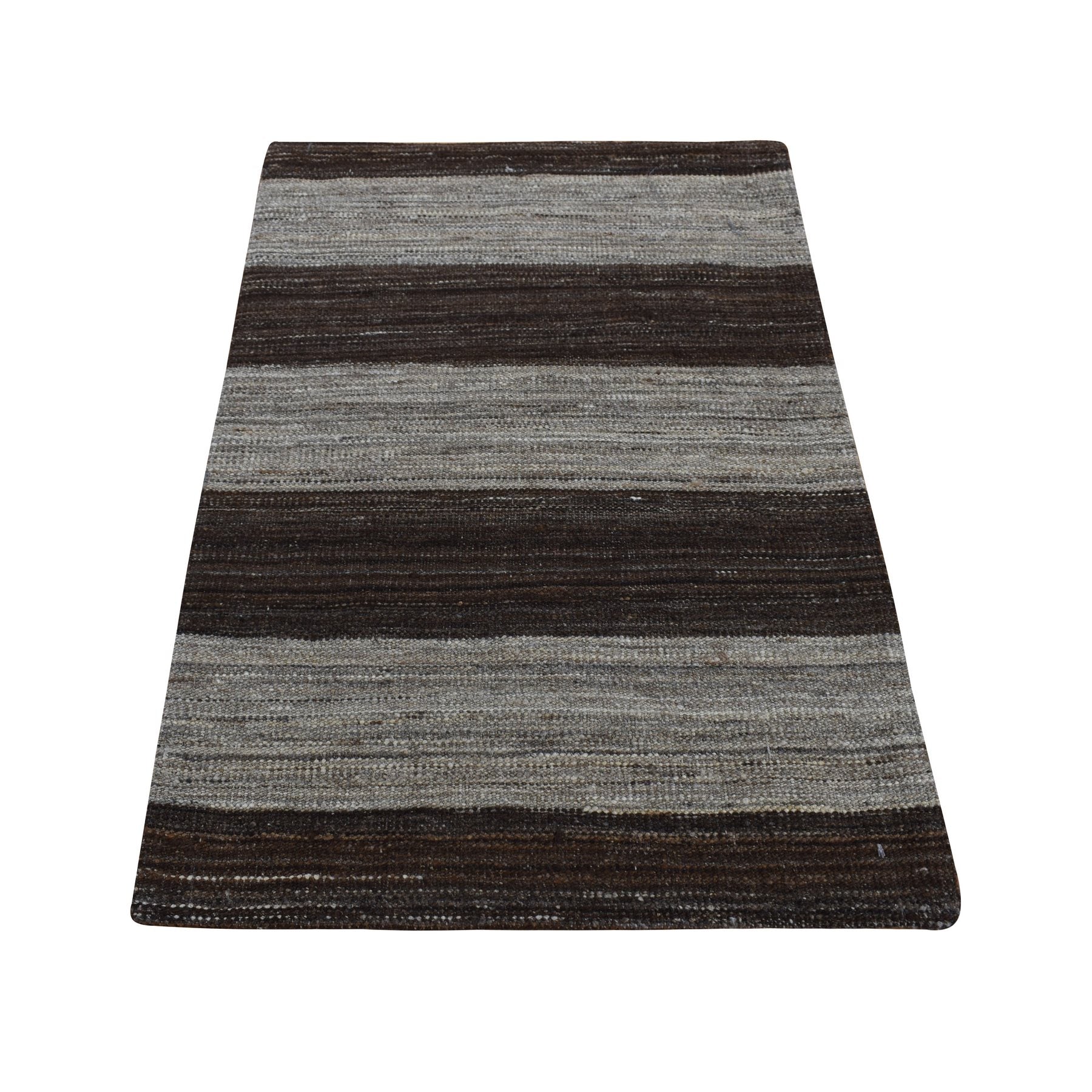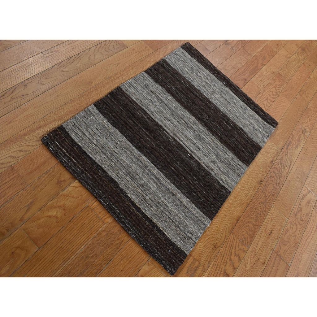 2'x3' Taupe Brown, Flat Weave Kilim, Wide Stripe Design, Undyed Natural Wool, Hand Woven, Sample Oriental Rug FWR526932