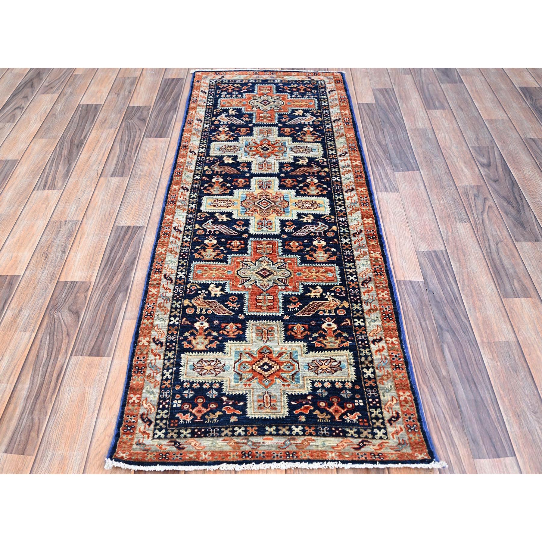 2'x5'10" Gibraltar Sea Blue With Small Bird Figurines, 200 Kpsi, Hand Knotted, Denser Weave, Natural Dyes, Armenian Inspired Caucasian Design, Organic Wool, Runner Oriental Rug FWR912
