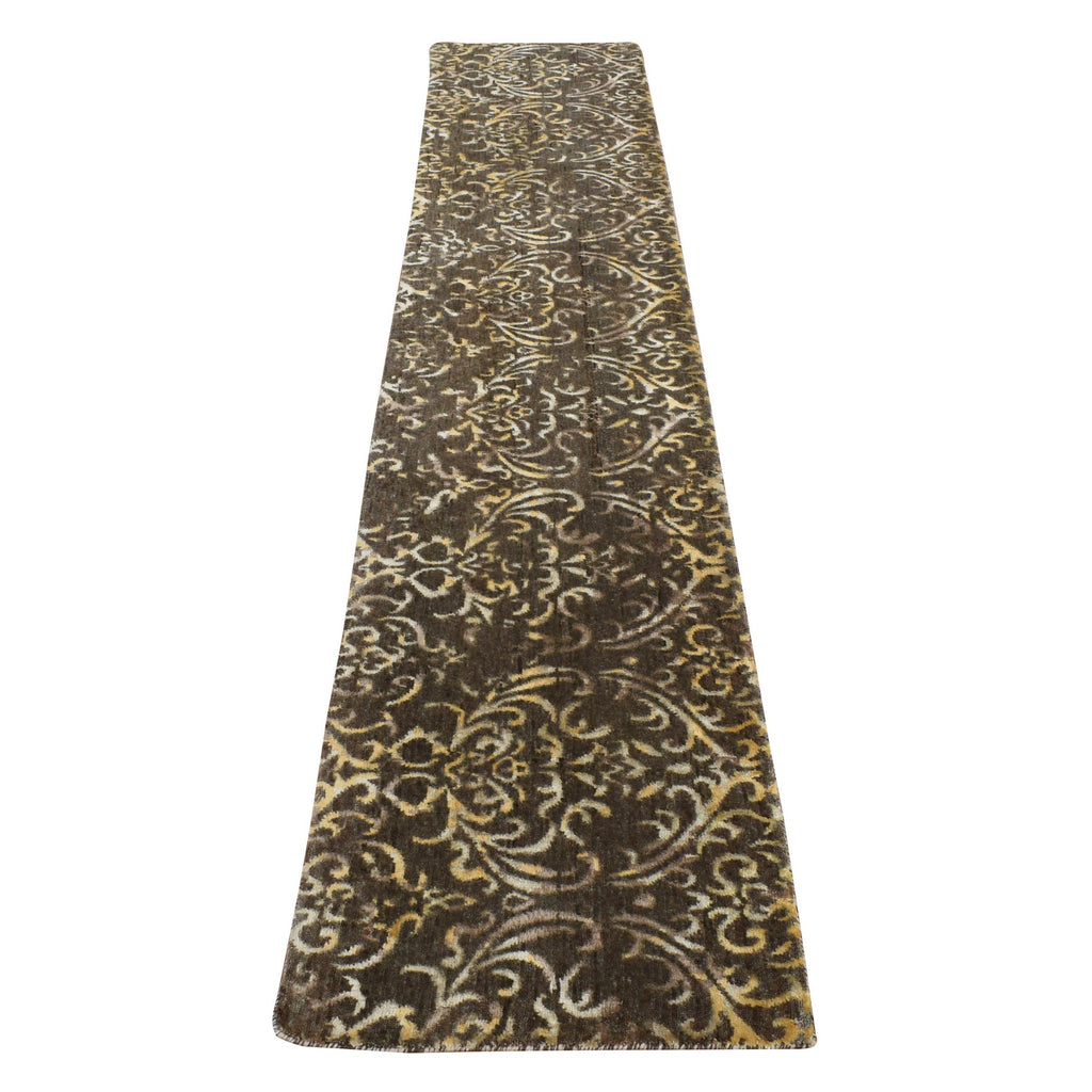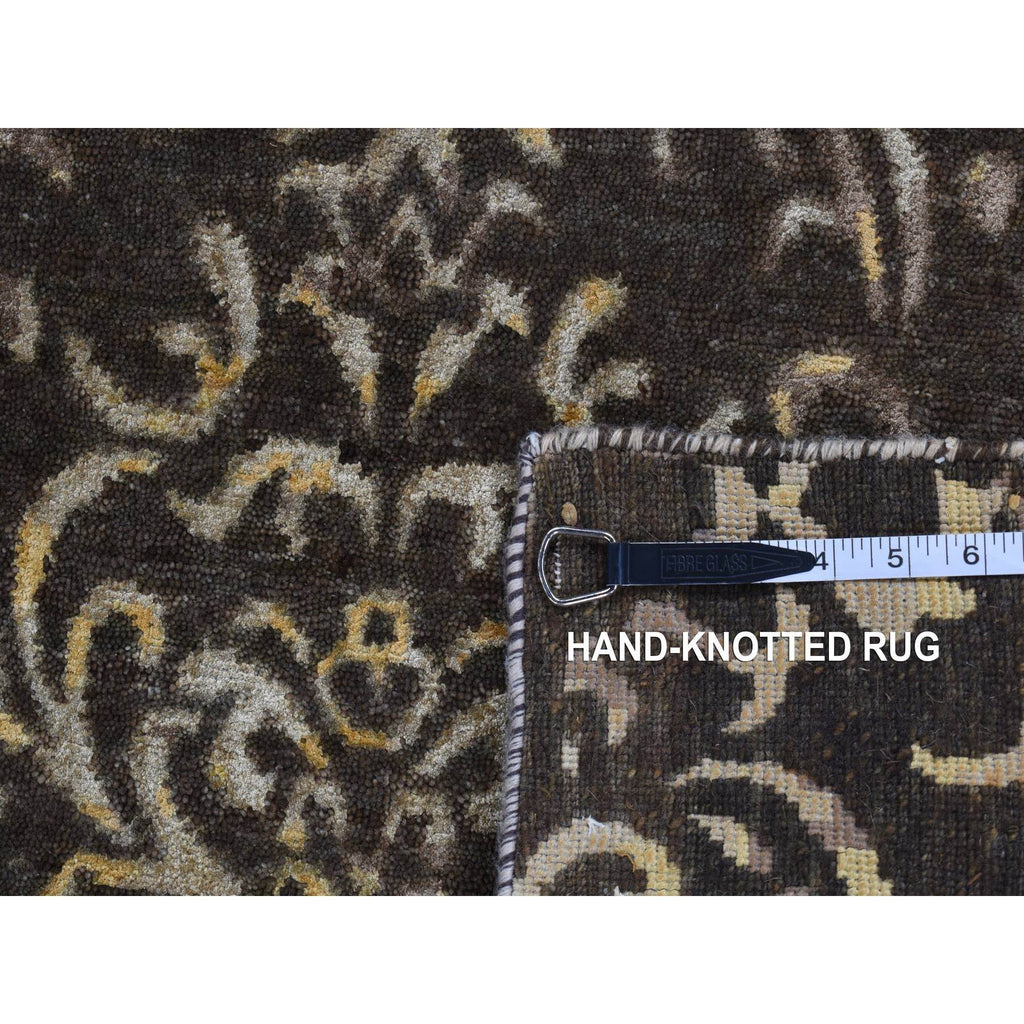 2'x9'10" Taupe Brown, Hand Knotted, Damask Tone On Tone, Wool And Silk, Runner Oriental Rug FWR523512