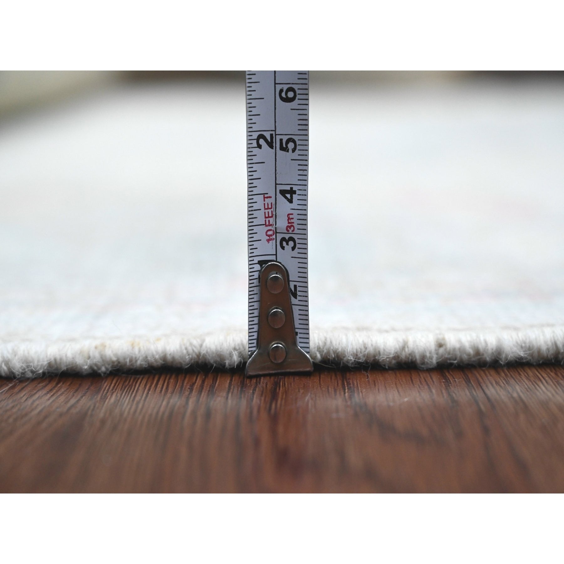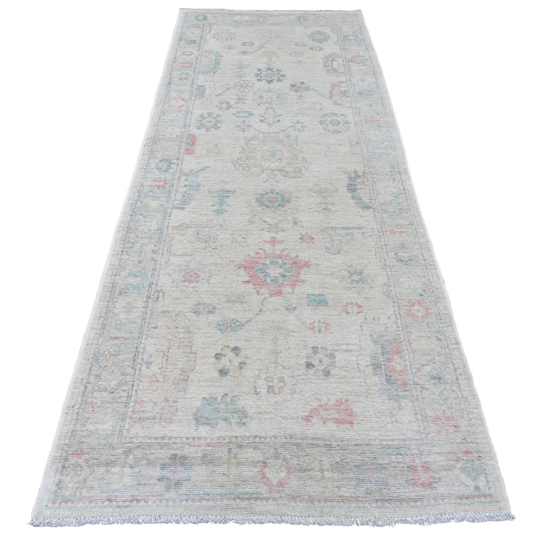 3'10"x10' Alabaster White, Hand Knotted, Afghan Angora Oushak With Colorful Leaf Design, Vegetable Dyes, 100% Wool, Runner, Oriental Rug FWR124602