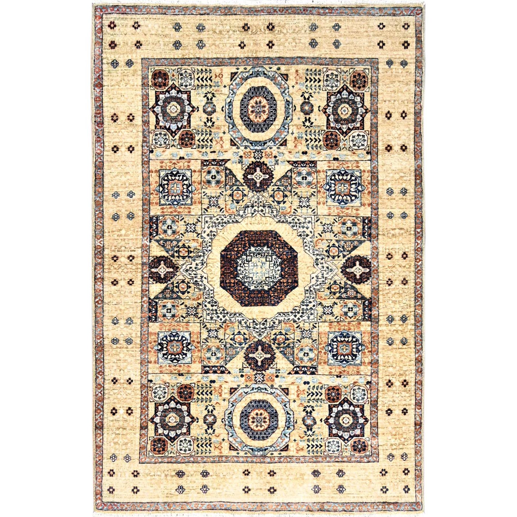 3'10"x6' Eggshell White, 200 Kpsi, Extra Soft Wool, Hand Knotted, 14th Century Mamluk Dynasty Pattern, Vegetable Dyes, Oriental Rug FWR515154