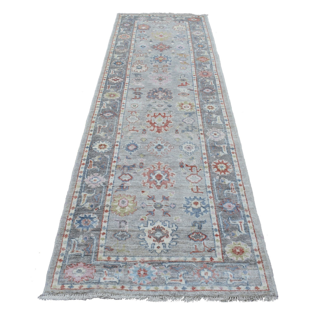3'2"x10' Angora Oushak With Geometric Design Hand Knotted Gray Soft Organic Wool Oriental Runner Rug FWR409884