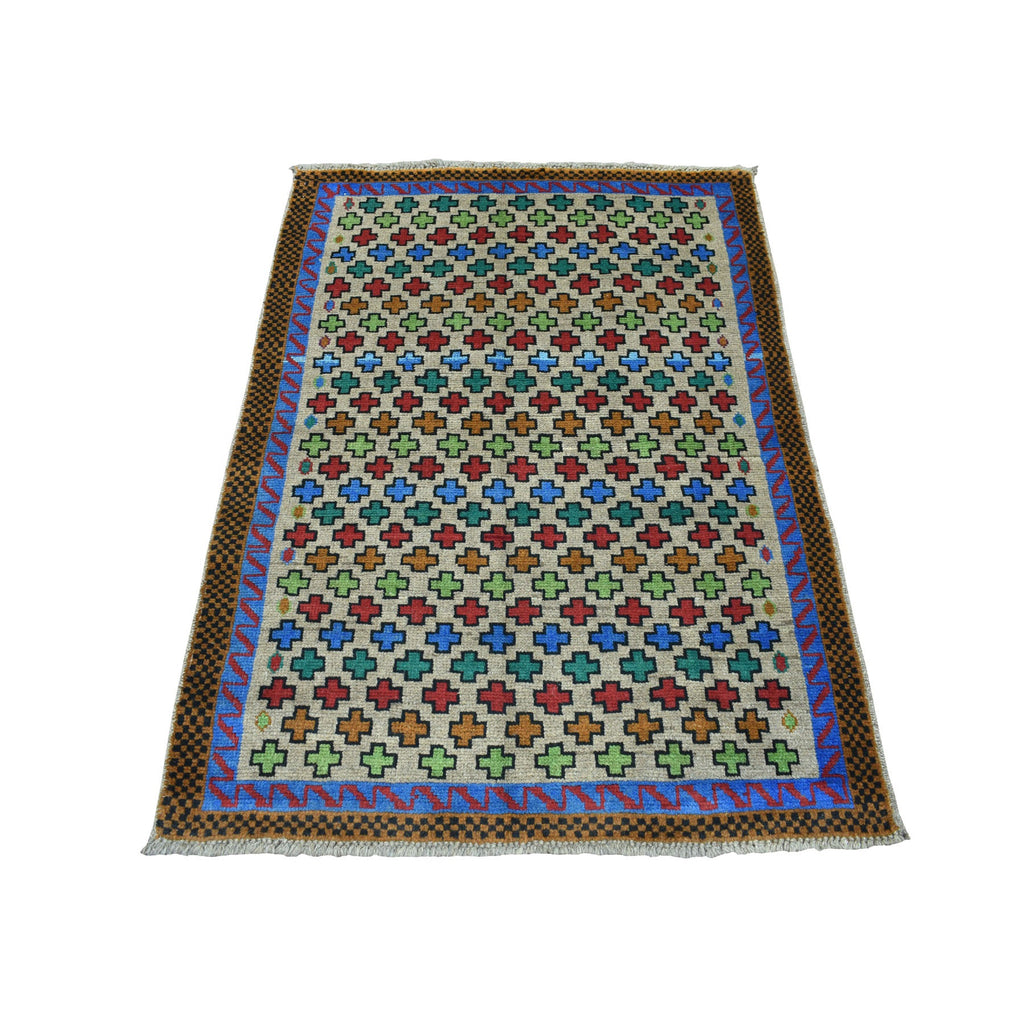 3'4"x4'9" Gray Hand Knotted Colorful Afghan Baluch All Over Design Pure Wool Oriental Rug FWR319002