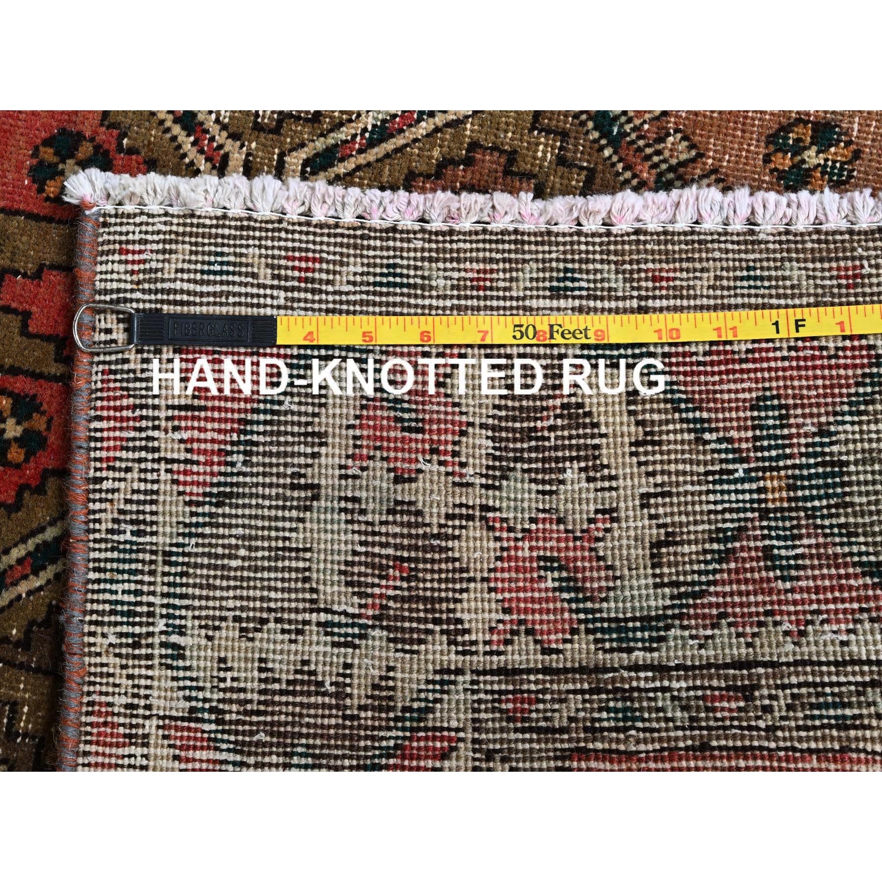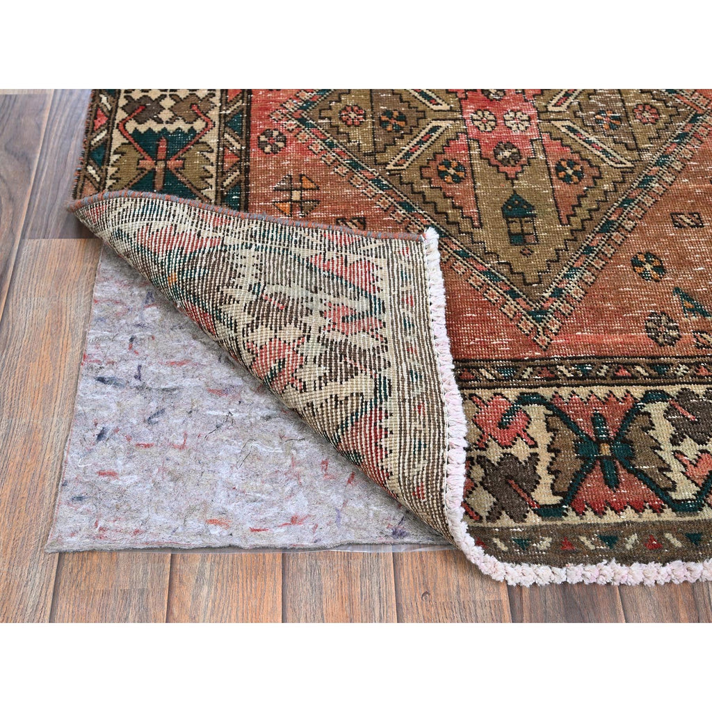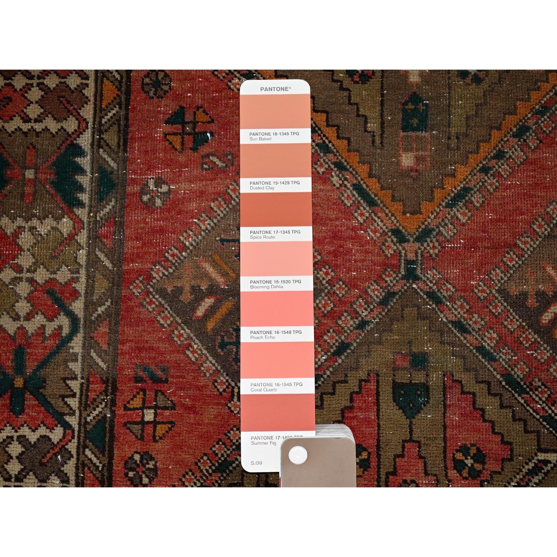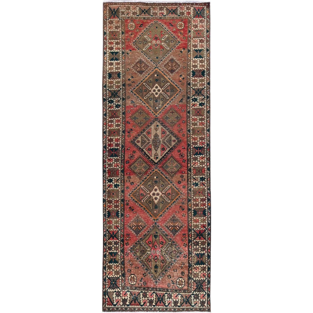 3'5"x10'3" Blush Red With Army Green, Vintage Persian Bakhtiar, Geometric Design, Distinct Abrash, Shaved Down, Zero Pile, Sides And Ends Professionally Secured, Clean, Hand Knotted, Pure Wool, Wide Runner, Oriental Rug FWR5292