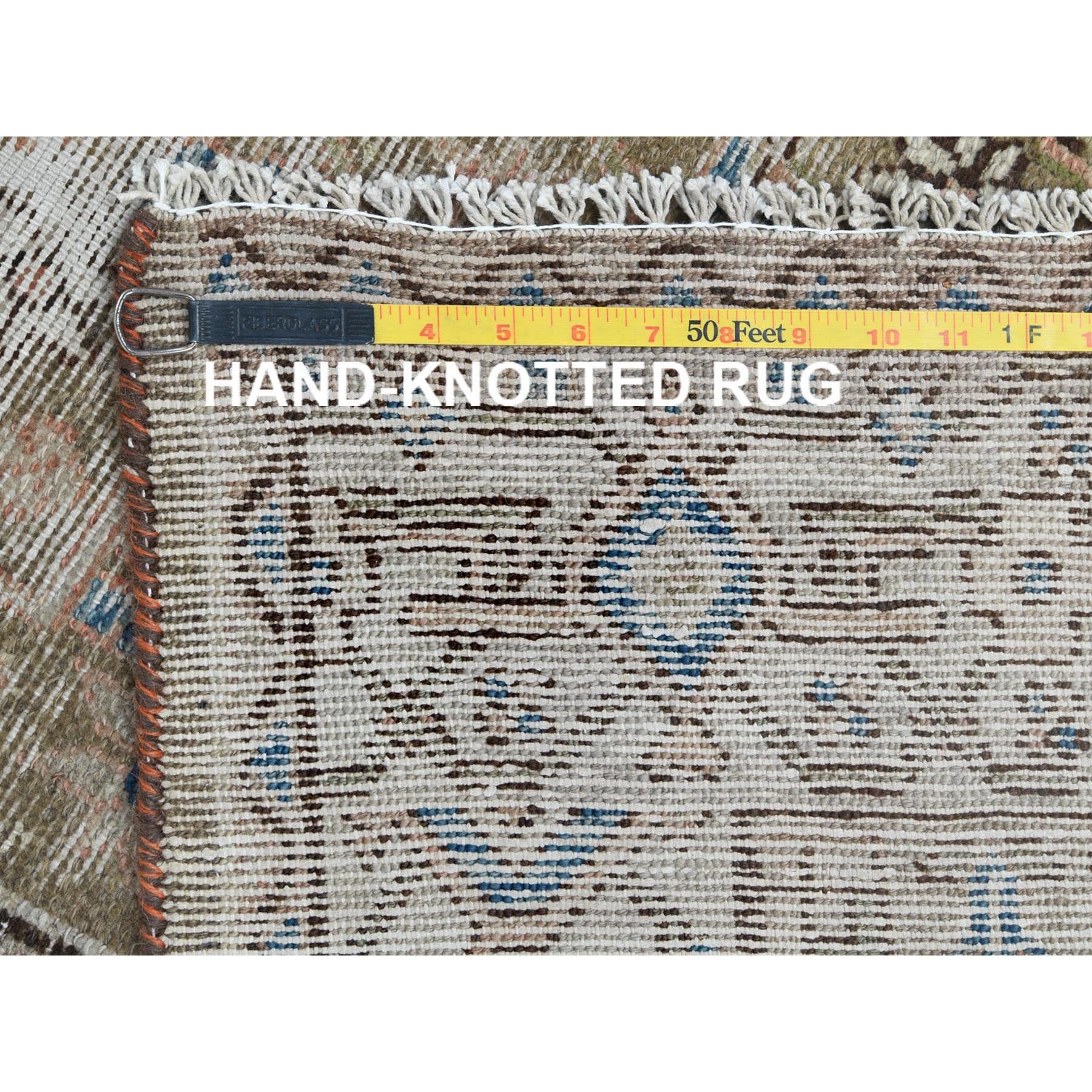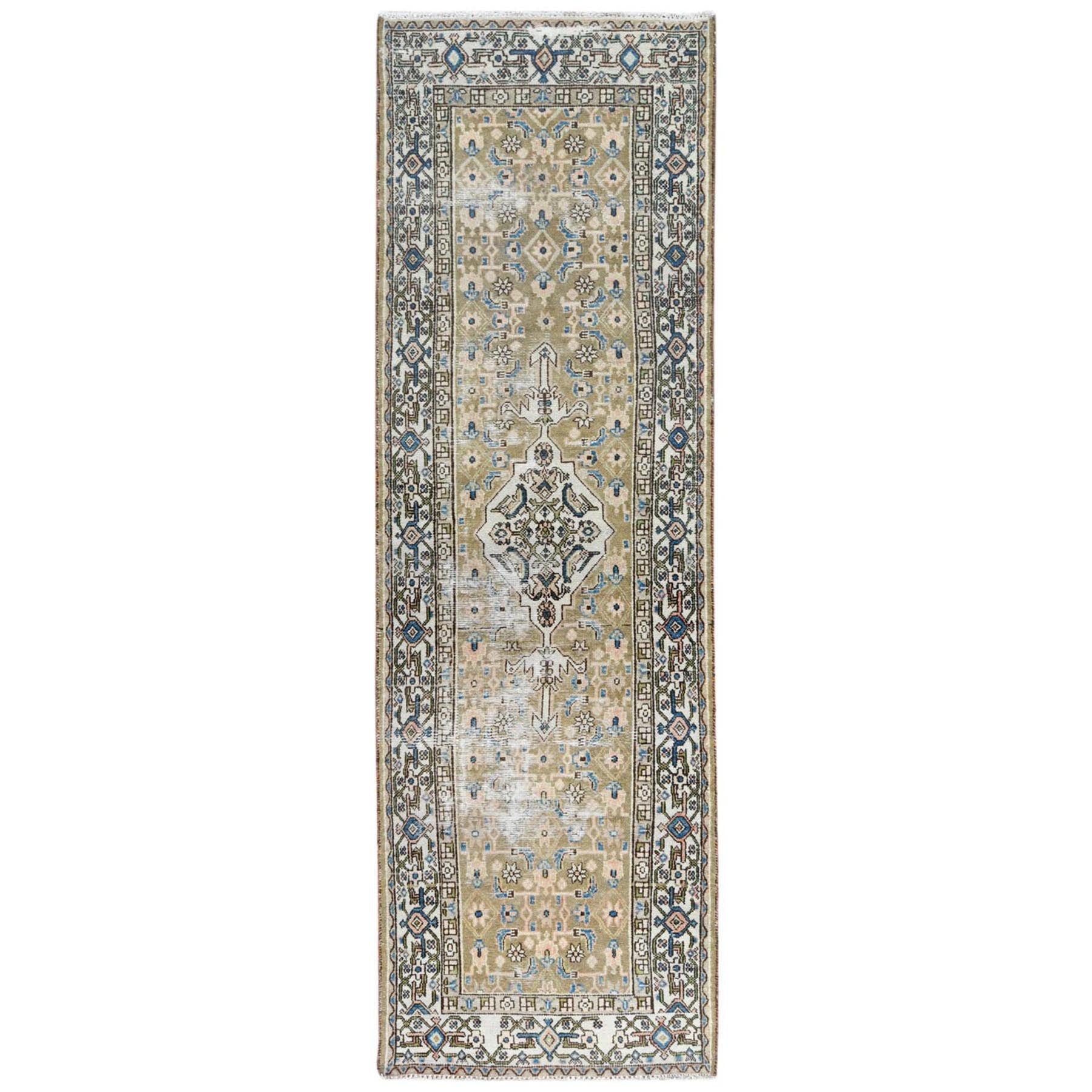 3'5"x10'6" Army Green, Worn Wool Hand Knotted Vintage Persian Hamadan With Fish Mahi Design, Cropped Thin Distressed Look, Wide Runner Oriental Rug FWR486792