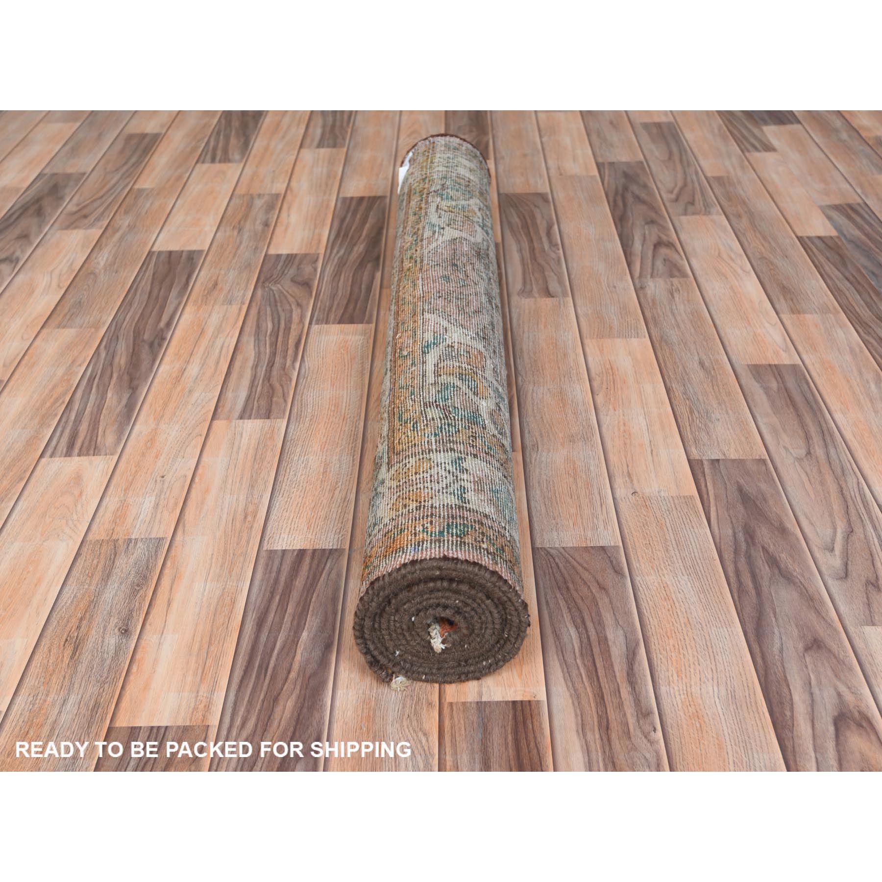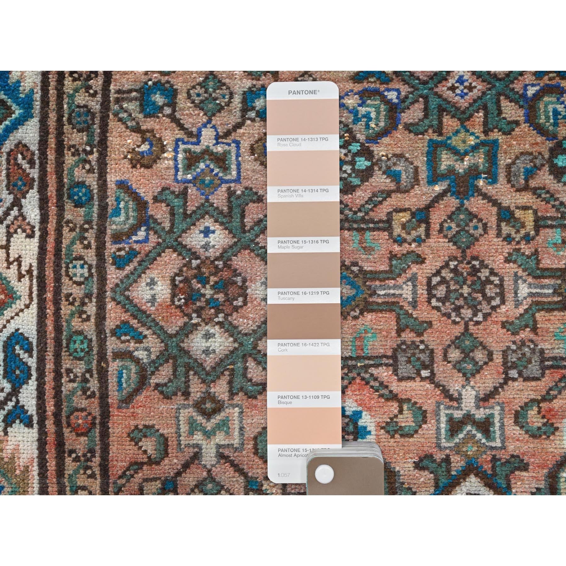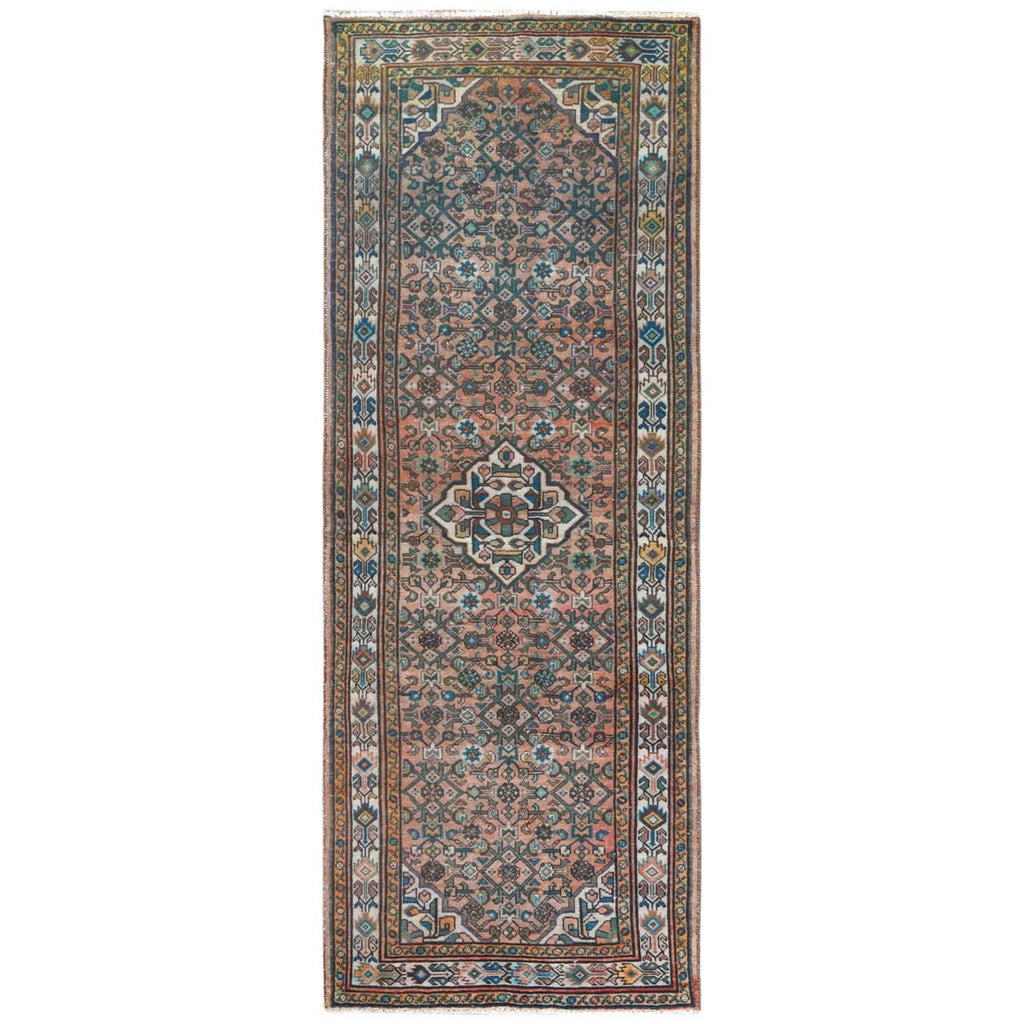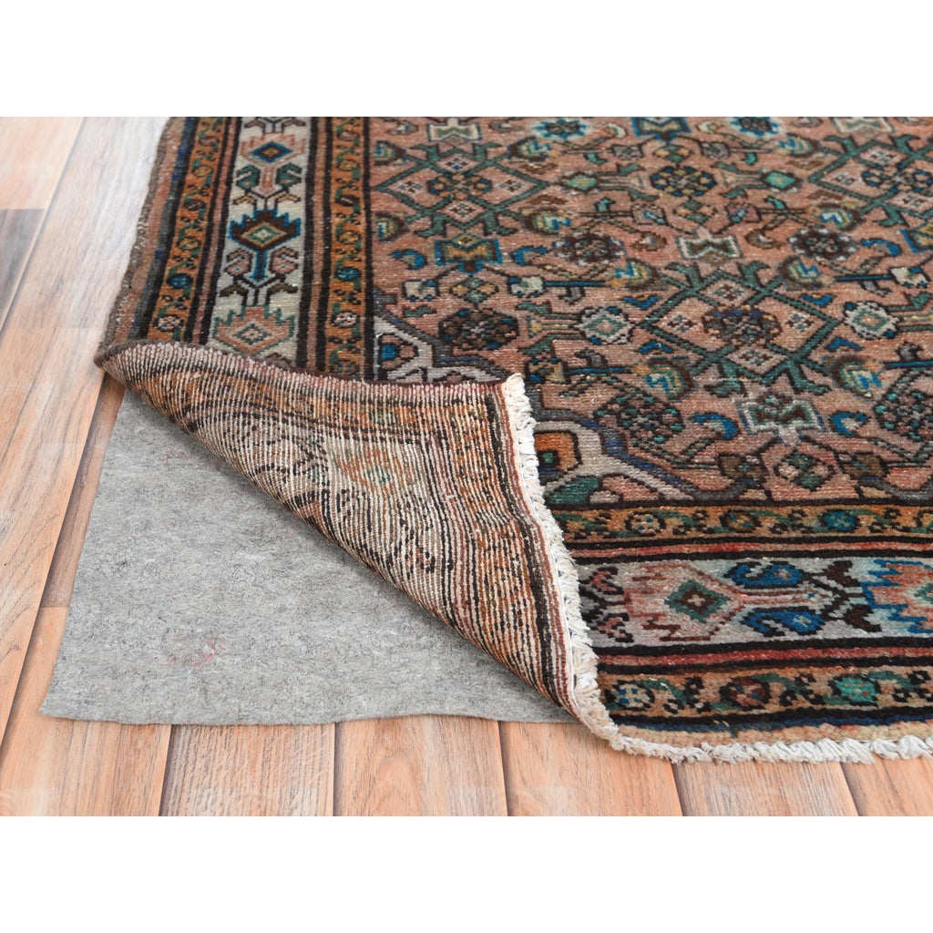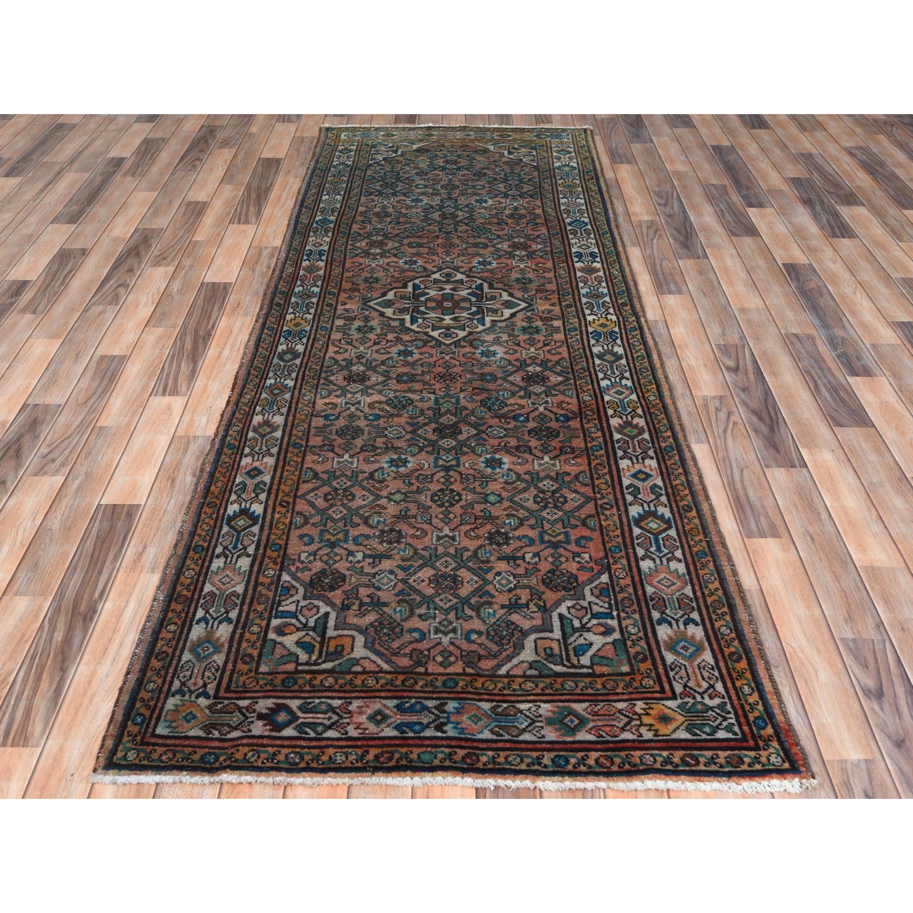 3'6"x9'7" Terracotta Red, Vintage Persian Husainabad With Fish Mahi Design, Cropped Thin Distressed Look Worn Wool Hand Knotted, Runner Oriental Rug FWR371676