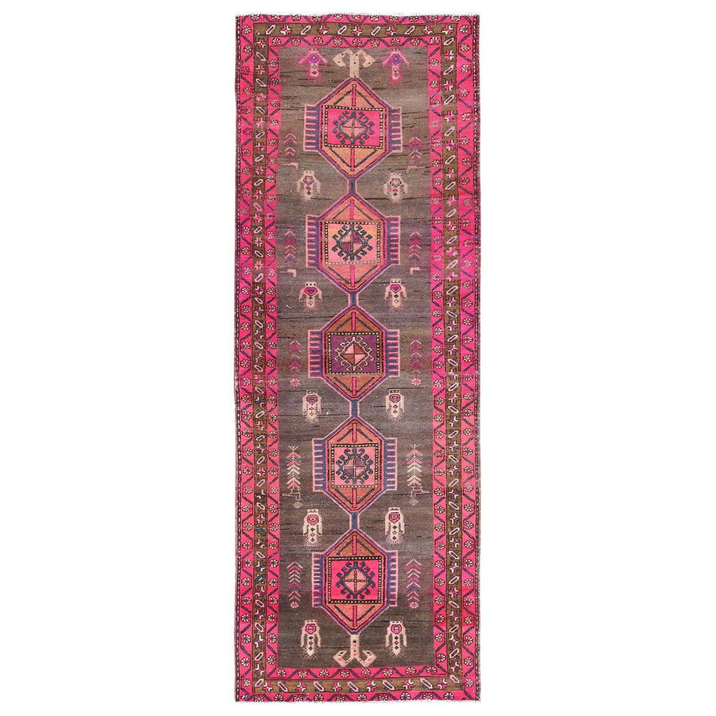 3'7"x10'1" Mocha Brown With Pink, Vintage Persian Heriz, Geometric Medallions, Hand Knotted Pure Wool, Bohemian, Clean, Worn Down, Wide Runner Oriental Rug FWR491082