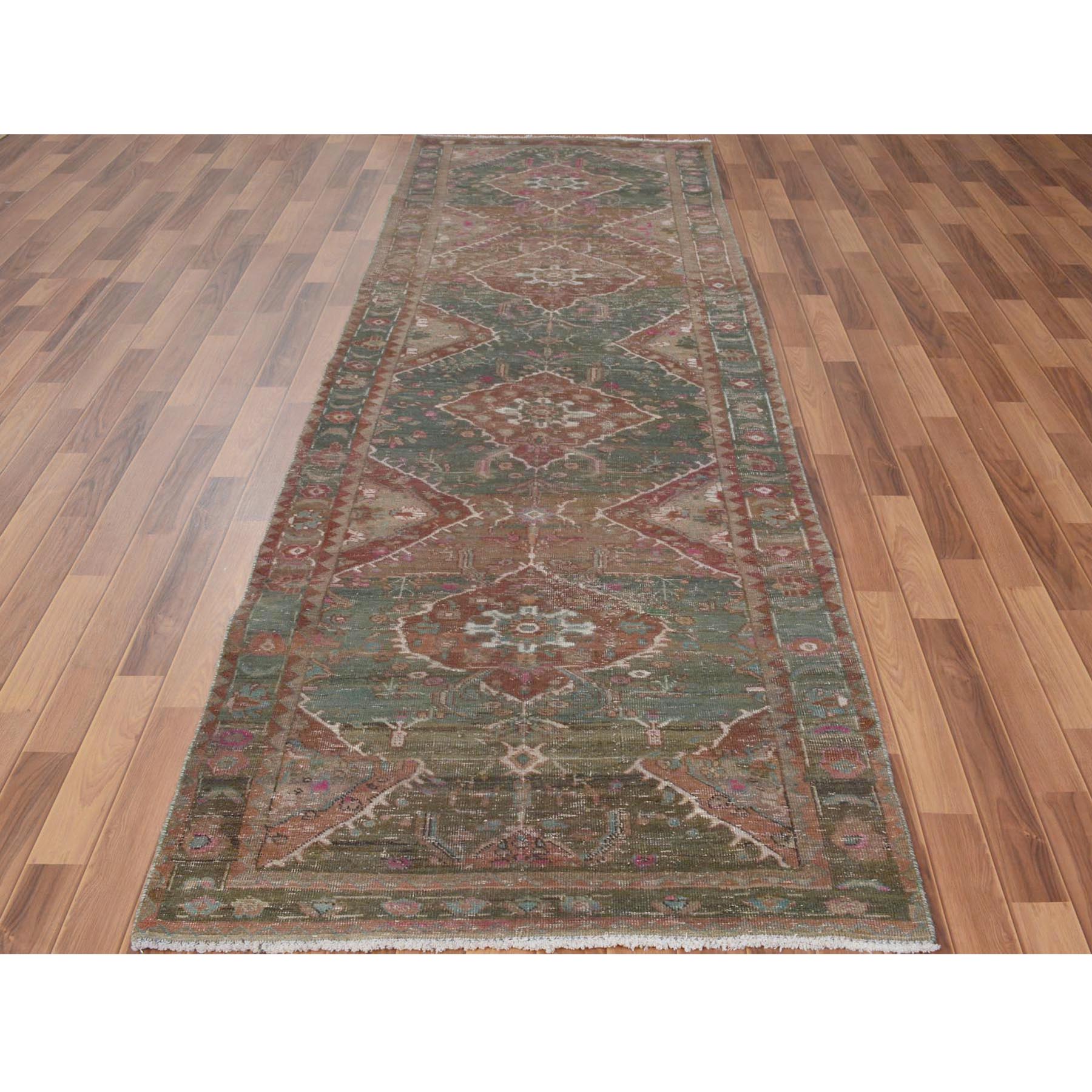 3'7"x12'3" Green Vintage And Worn Down Persian Heriz Distressed Hand Knotted Runner Pure Wool Oriental Rug FWR345876