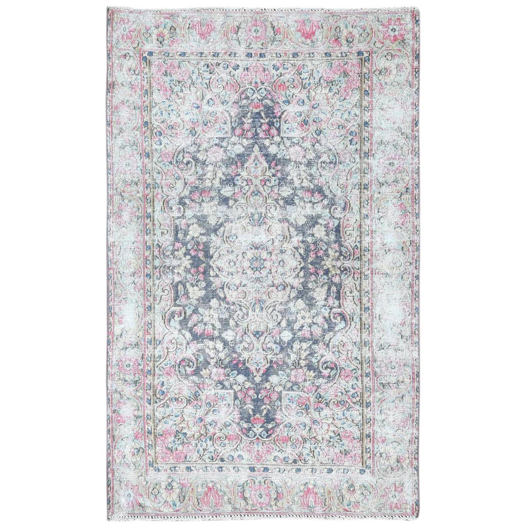 3'7"x5'9" Navy Blue, Hand Knotted Old Persian Kerman, Cropped Thin Distressed Look Worn Wool, Oriental Rug FWR491682