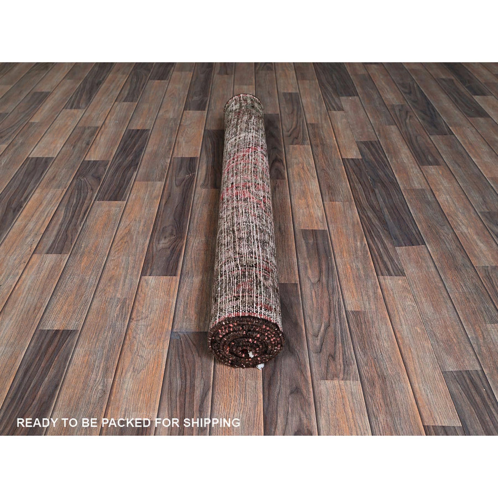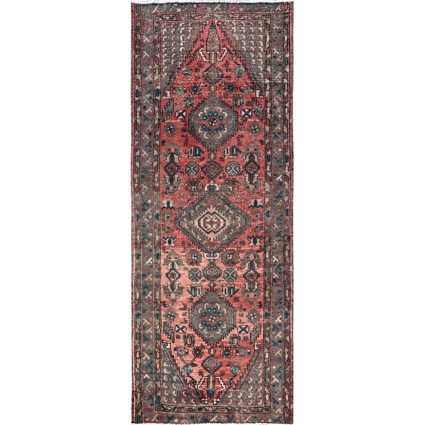 3'7"x8'6" Blush Red, Vintage Persian Shiraz With Geometric Medallion Design, Distinct Abrash, Worn And Distressed, Shaved Down, Zero Pile, Sides And Ends Professionally Secured, Clean, Hand Knotted, 100% Wool, Wide Runner, Oriental Rug FWR5154