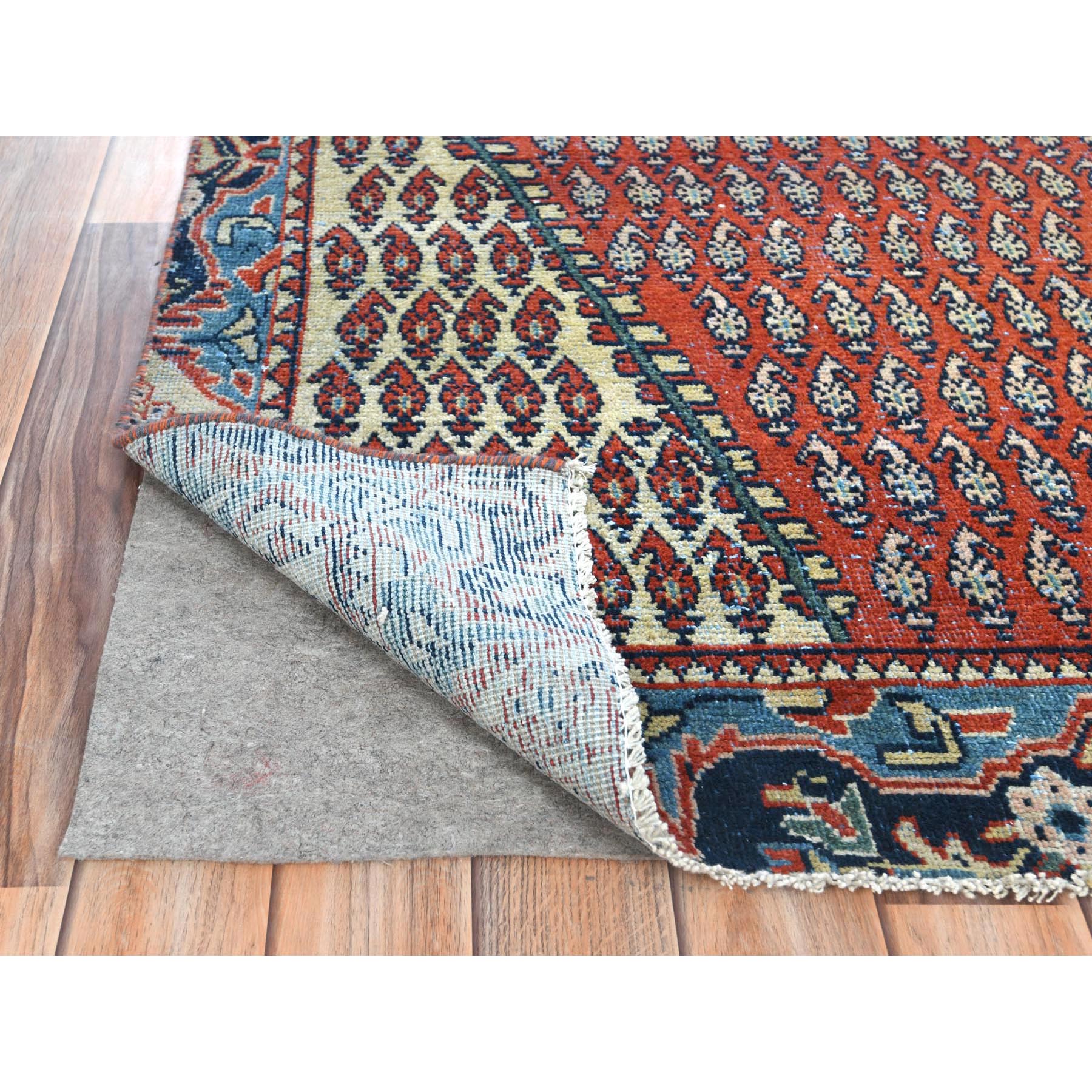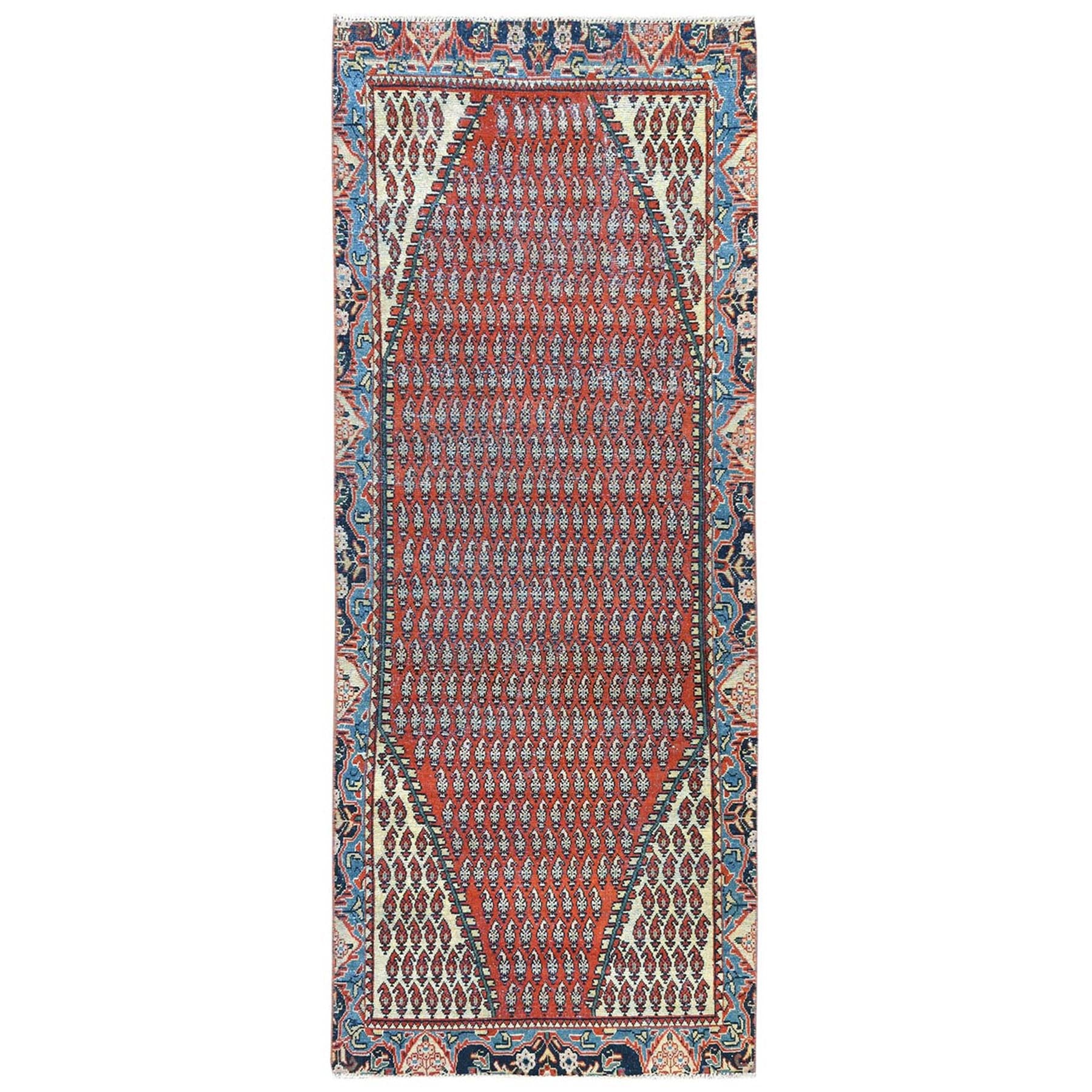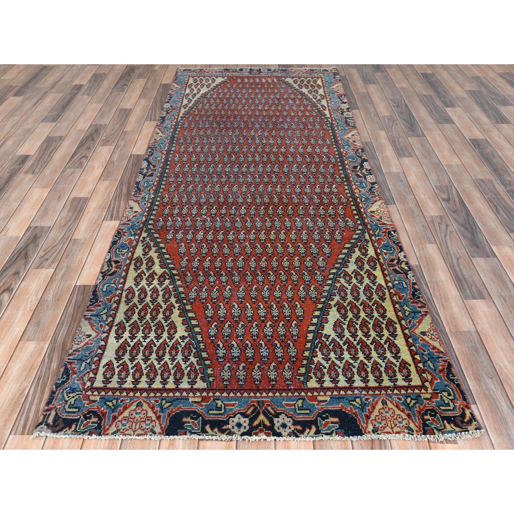 3'7"x9'3" Tomato Red, Pure Wool, Vintage Persian Serab With Small Repetitive Boteh Design, Hand Knotted, Worn Down, Distressed Look, Wide Runner Oriental Rug FWR489966
