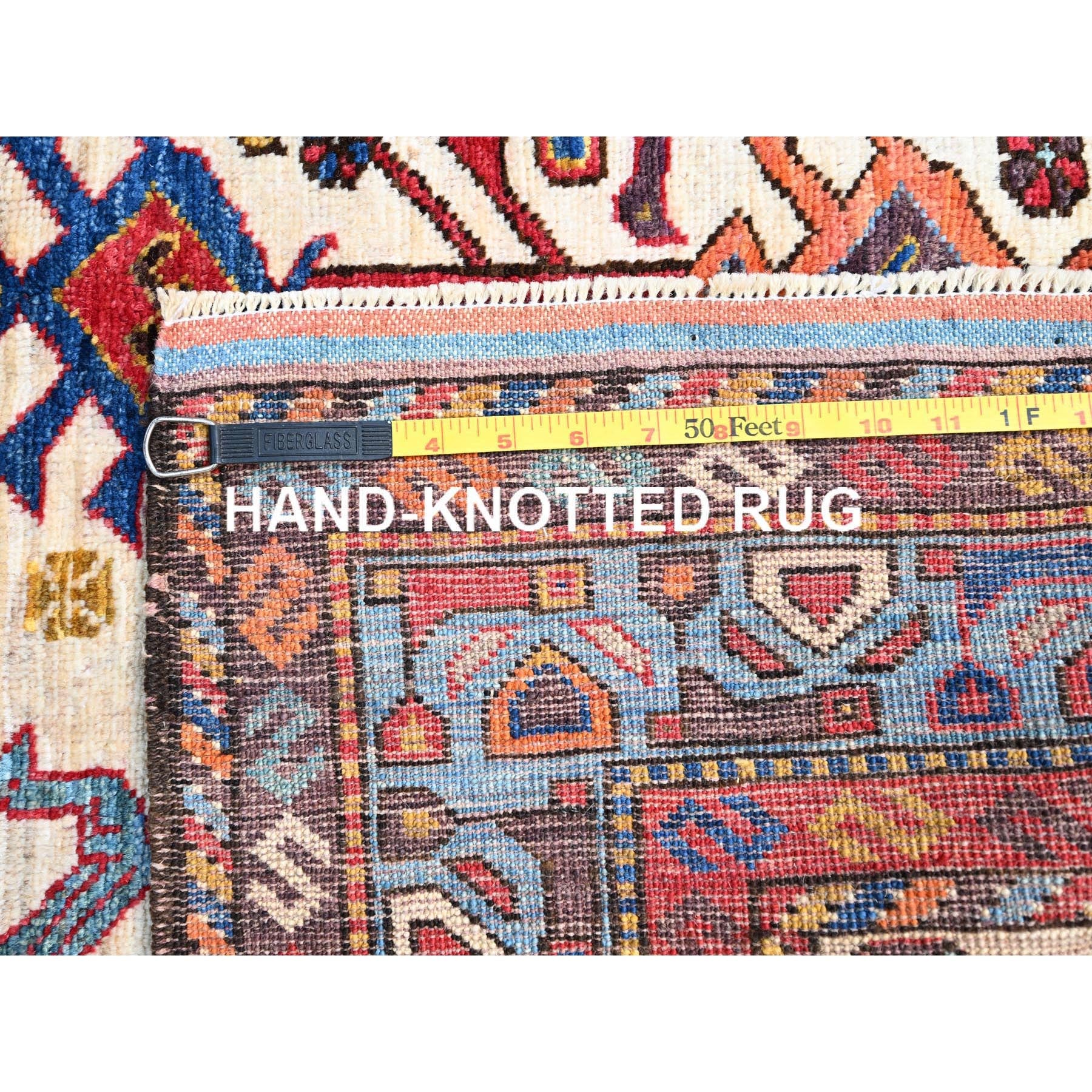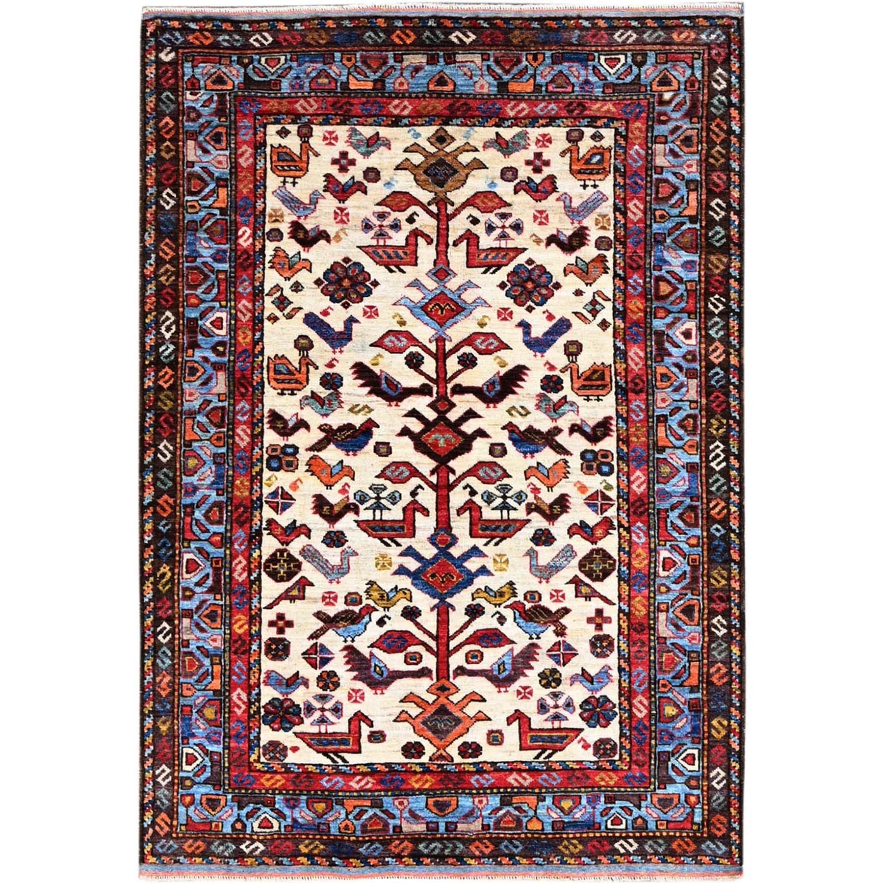 3'8"x5'4" Swiss Coffee White With Quilt Blue Border, Hand Knotted Vibrant Wool, Turkish Knot With All Over Small Birds Figurines, Denser Weave Natural Dyes, Oriental Rug FWR521928
