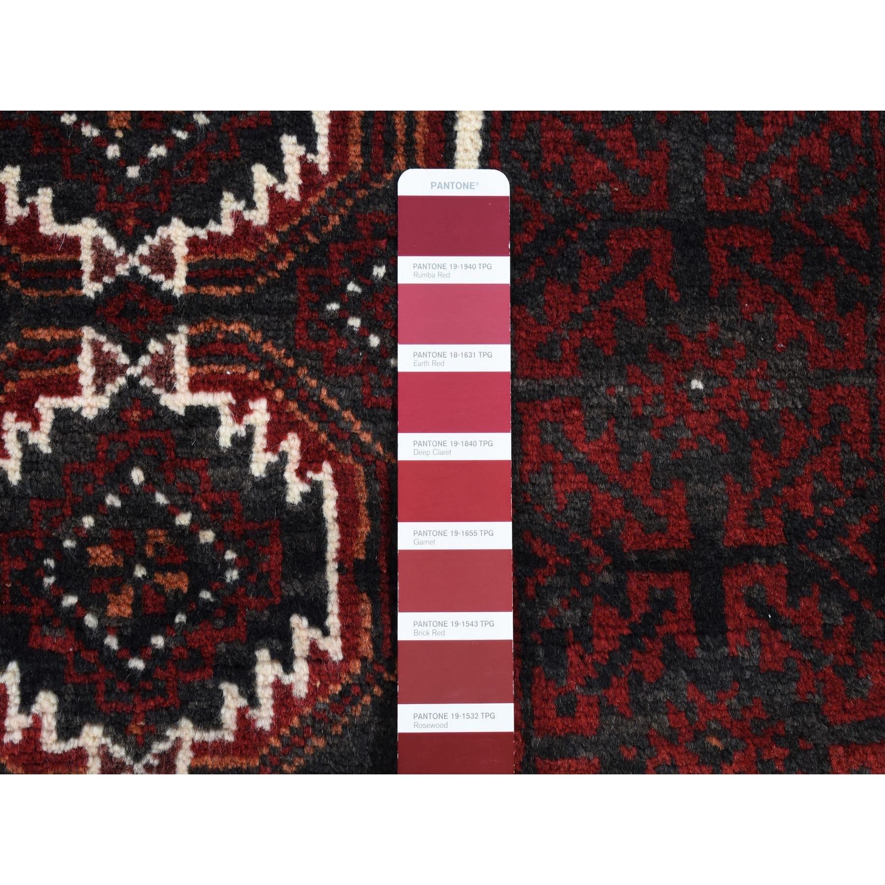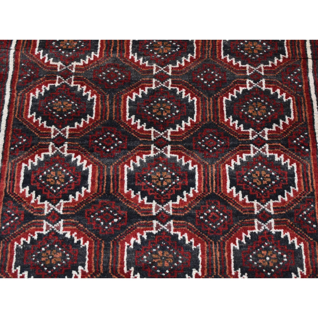 3'8"x8' Vermilion Red, Vintage Persian Baluch, Repetitive Gul Motif With Peacocks Design, Pure Wool, Hand Knotted, Wide Runner Oriental Rug FWR524310