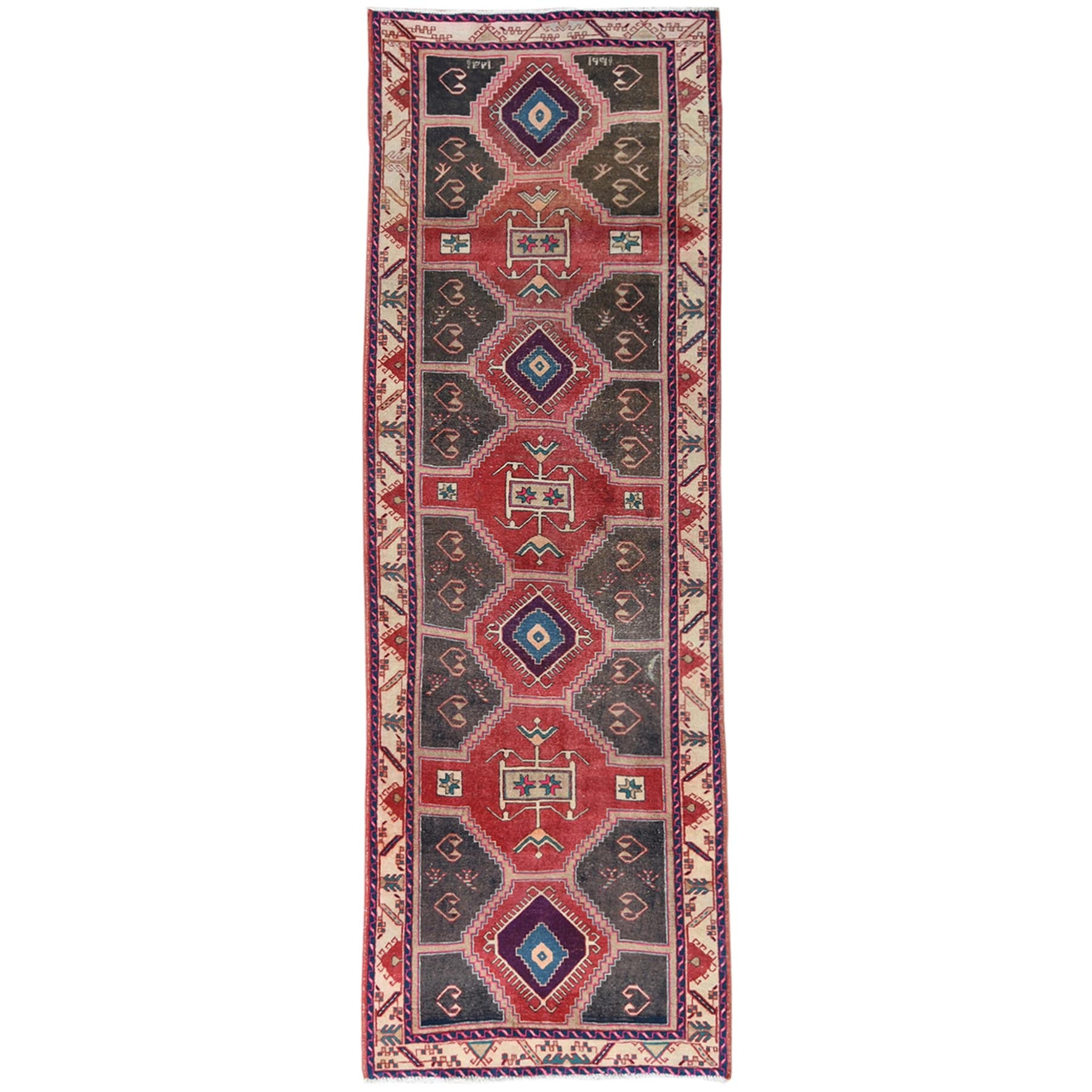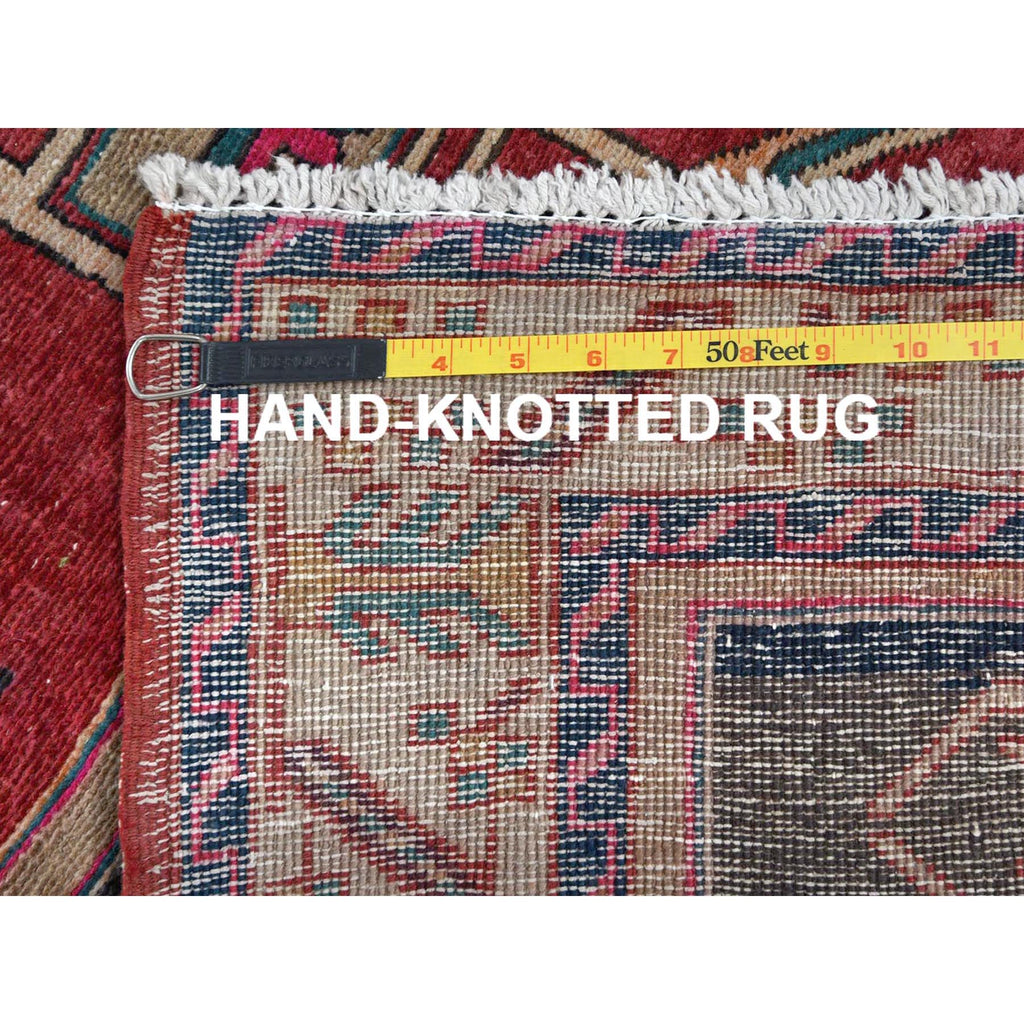 3'9"x10'9" Semi Antique Red Northwest Persian Heriz With Geometric Design Cropped Thin Pile Clean Hand Knotted Pure Wool Oriental Runner Rug FWR363060