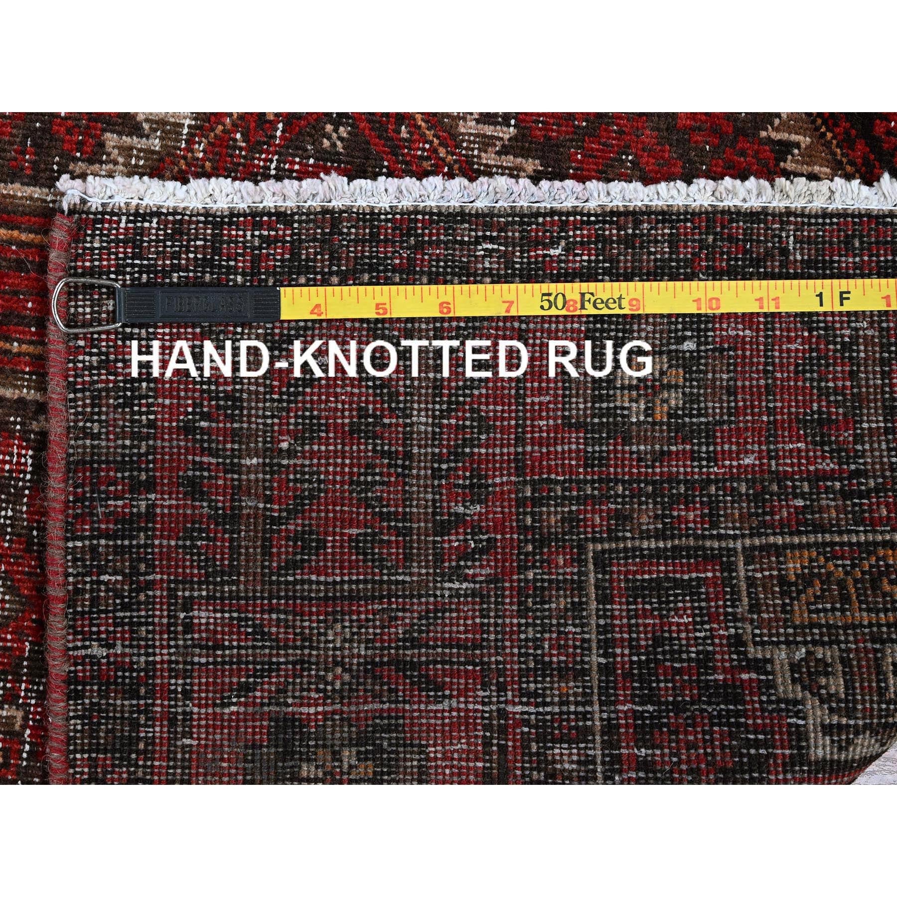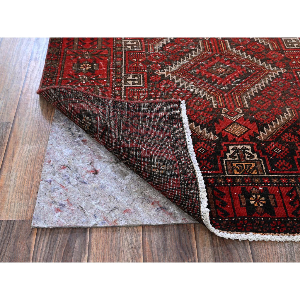 3'x6'1" Scarlet Red, Vintage Persian Baluch With Geometric Pattern, Shaved Low, Zero Pile, Worn And Distressed, Sides And Ends Professionally Secured, Hand Knotted, 100% Wool, Wide Runner, Oriental Rug FWR5184